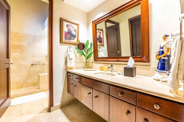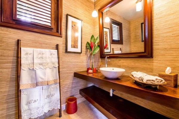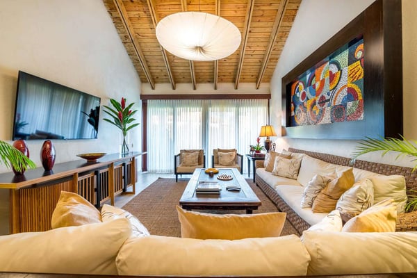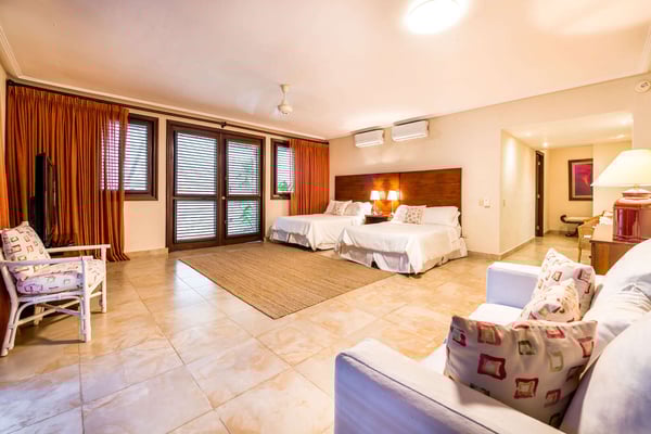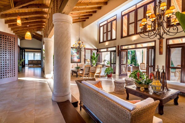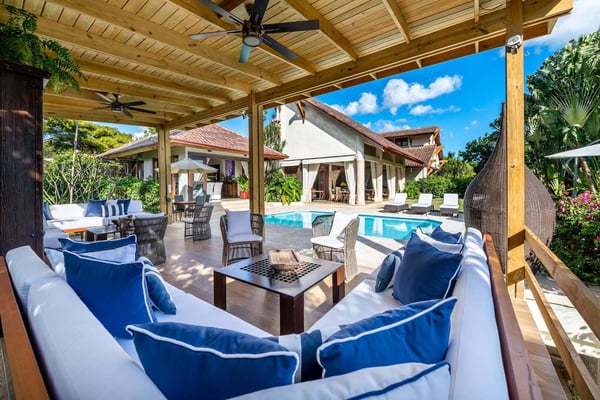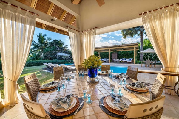 All guests must register with the Casa de Campo Concierge office, and for a small daily fee ($30 per adult per night & $15 per child per night), are granted access to resort areas and amenities. Casa de Campo Resort facilities and amenities include golf courses ($), the fitness centre ($), racquet center ($), restaurants ($) and bars ($). Contact Rental Escapes for more information about pricing. Villa Isabel is a spacious and elegant six-bedroom retreat designed for relaxation and comfort. With tall wooden ceilings and an open layout, the villa offers an airy, grand atmosphere enhanced by refreshing evening breezes. The double living room welcomes guests with warmth and sophistication, seamlessly connecting to an open terrace with comfortable seating and dining areas. A wide lanai stretches across the villa, perfect for lounging or enjoying al fresco meals while taking in the tranquil surroundings. For those who need a workspace, the villa includes an air-conditioned studio equipped with a desk, Wi-Fi, a flat-screen TV, and a surround-sound stereo system, providing a private and functional space. Tastefully decorated and thoughtfully designed, Villa Isabel combines style and practicality, ensuring every moment of your stay is both luxurious and memorable.