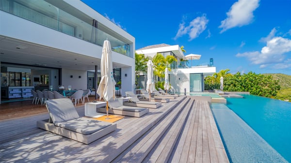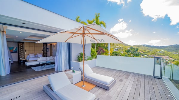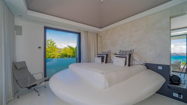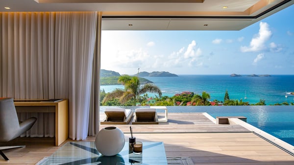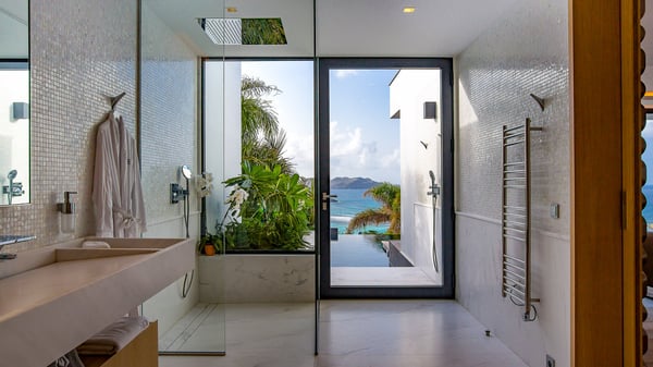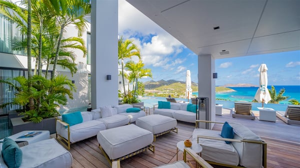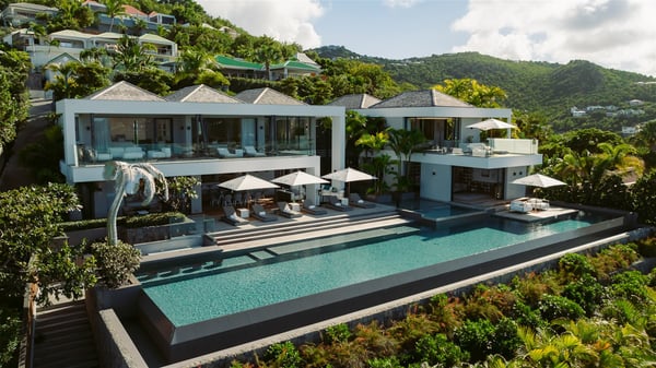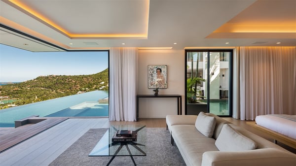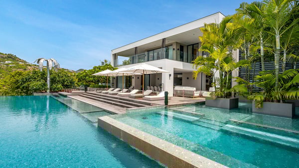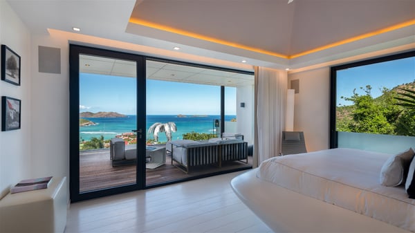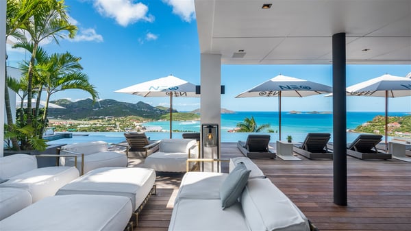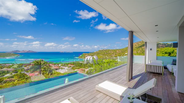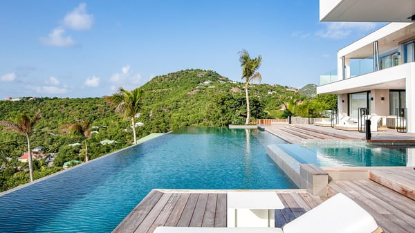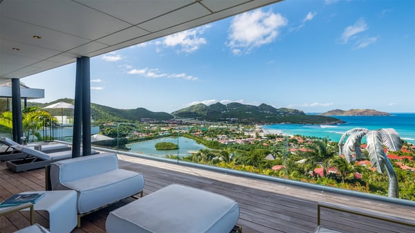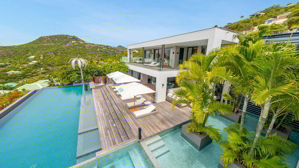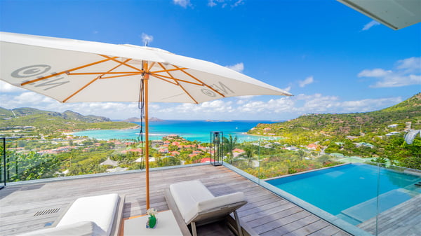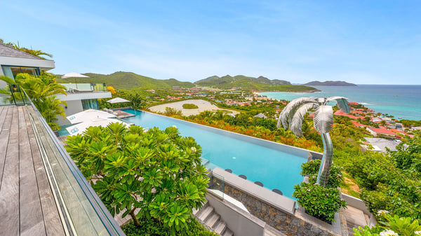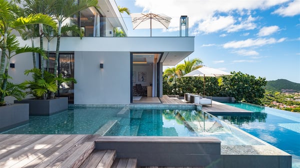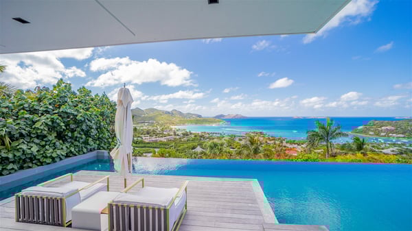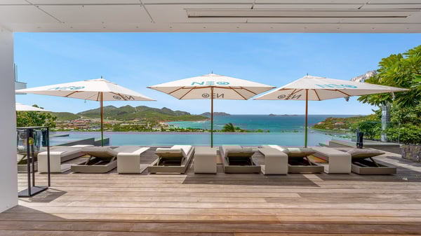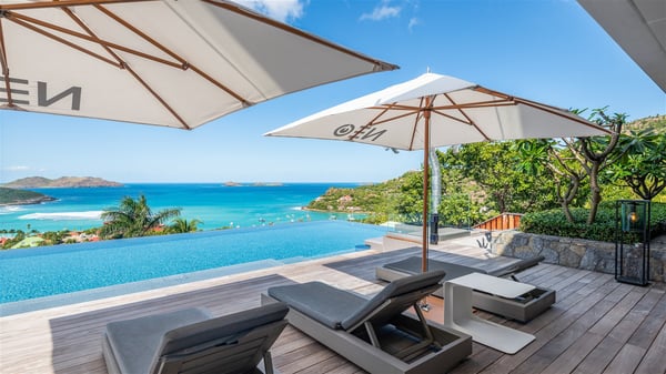The sumptuous vacation rental Neo is an exceptional property located on the heights of St. Jean. Named as the most beautiful Caribbean villa in 2018, the luxurious decoration and choice of noble materials make this vacation rental a true St. Barths’ gem. Built on two levels, villa NEO was designed in a very chic and modern style. This outstanding vacation home features large rooms and glass surfaces which provide fantastic panoramic views over the ocean and the neighbouring hills. On the main level, the living room welcomes you in a large and comfortable space furnished with spacious sofas, under the ceiling opening onto the upper level. The dining room is ideal for having meals in a soft, luxurious and refined decor. The kitchen is perfect for preparing your meals and drinks unless you prefer to call upon a private chef who can cook in a second kitchen specially designed for this purpose. There is also an entertainment room with a TV, a bar and a pool table, as well as a private disco room for late nights. On the terrace, the panorama over the bay and the ocean is incredible, as far as your eyes can see. The outdoor facilities are exceptional: there is a large heated infinity swimming pool (30 meters long), an outdoor lounge, sunbeds and an alfresco dining room for your meals in the gentle trade winds. All is beautiful and majestic, in a nice setting of exotic tropical vegetation. The luxury villa Neo welcomes you in six superb air-conditioned suites spread over the two levels of the property. Two of the bedrooms connect, although each has its own bathroom. They feature spacious dressing rooms, sitting areas, access to the terrace and whirlpool tubs and materials such as marble and mosaic. Five bedrooms open onto the panoramic view, while one room opens back onto the patio. An elevator, an air-conditioned fitness room and a steam room are also at your disposal in this sumptuous vacation rental in the heart of the Caribbean.
