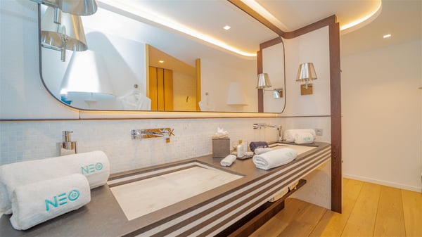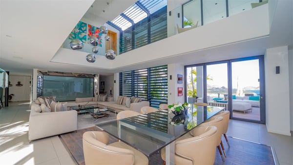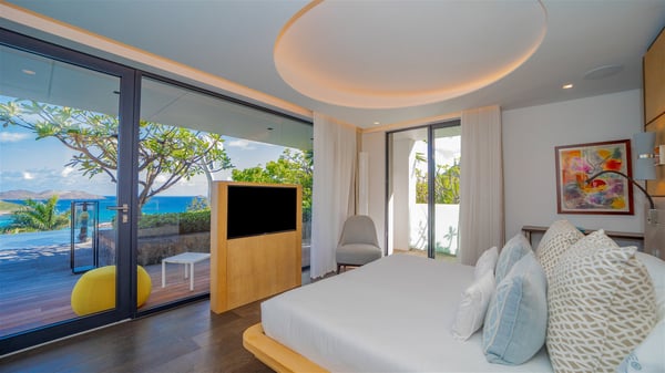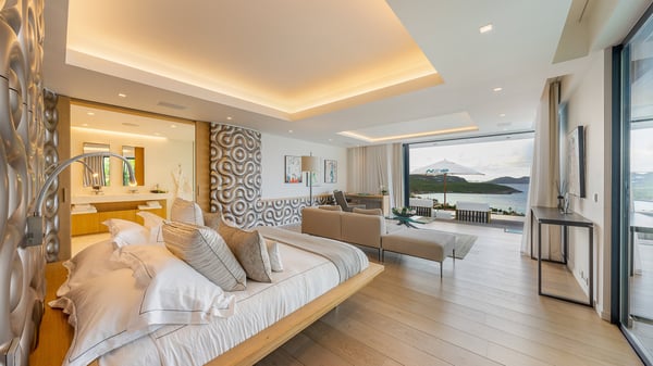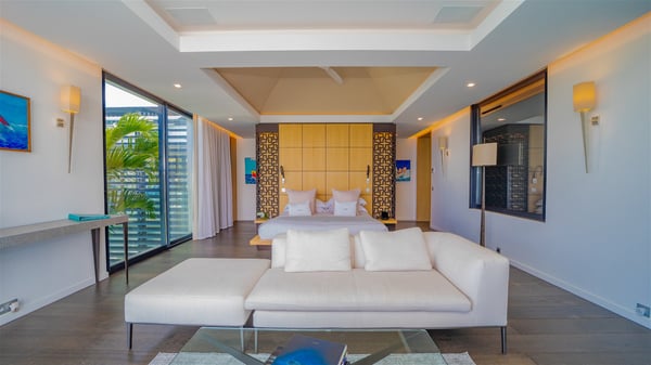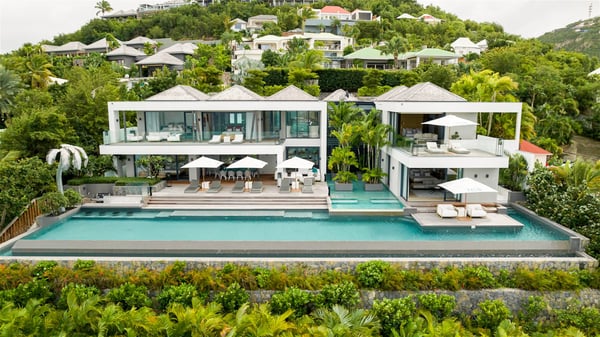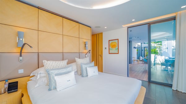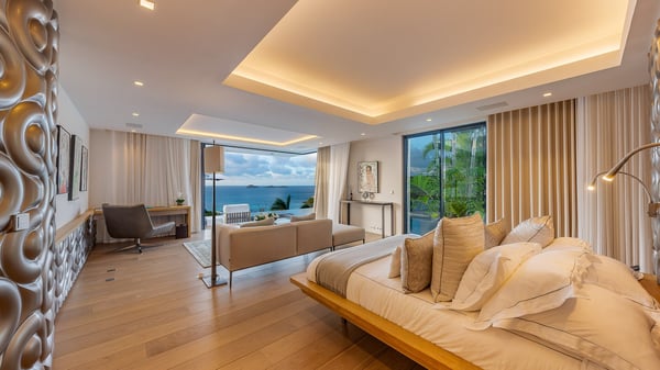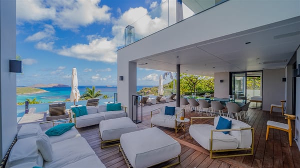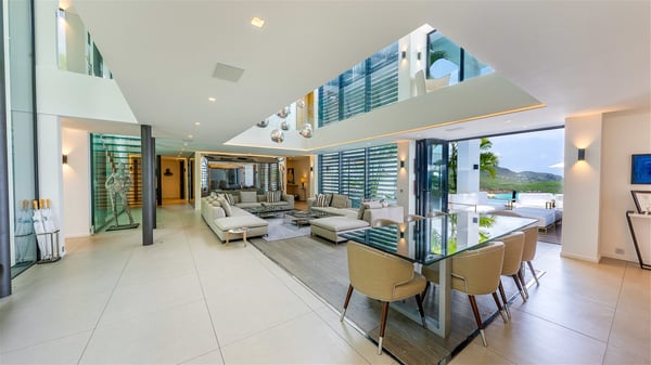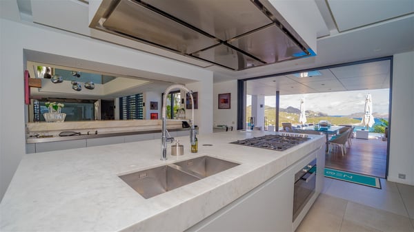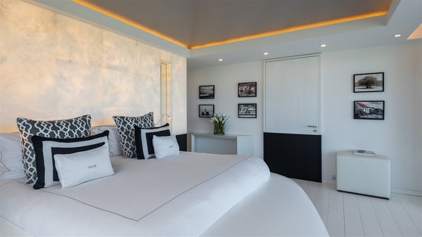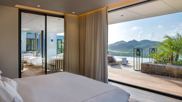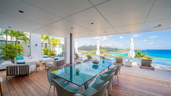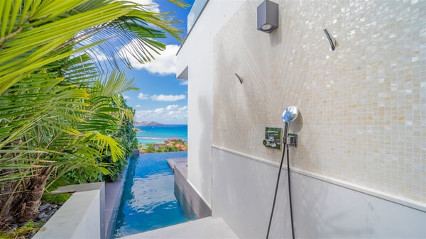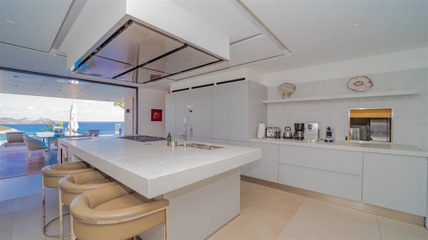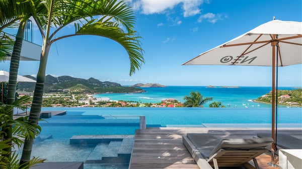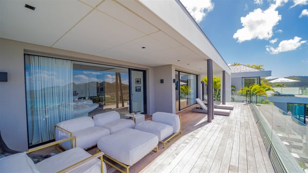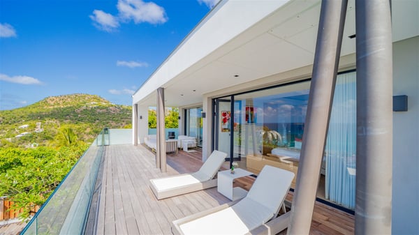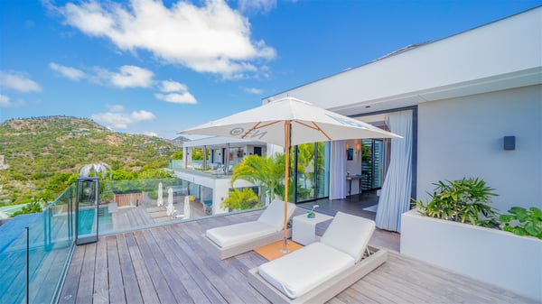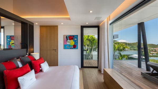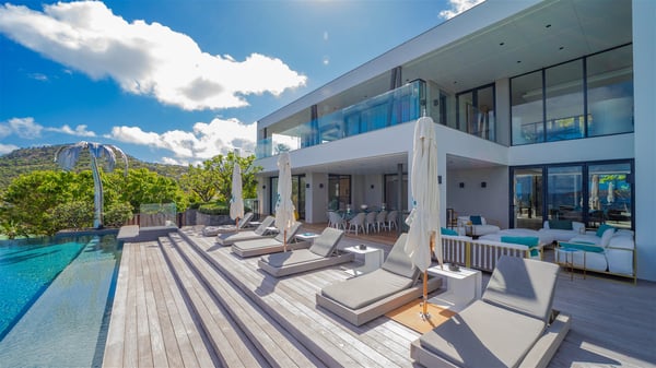 The sumptuous vacation rental Neo is an exceptional property located on the heights of St. Jean. Named as the most beautiful Caribbean villa in 2018, the luxurious decoration and choice of noble materials make this vacation rental a true St. Barths’ gem. Built on two levels, villa NEO was designed in a very chic and modern style. This outstanding vacation home features large rooms and glass surfaces which provide fantastic panoramic views over the ocean and the neighbouring hills. On the main level, the living room welcomes you in a large and comfortable space furnished with spacious sofas, under the ceiling opening onto the upper level. The dining room is ideal for having meals in a soft, luxurious and refined decor. The kitchen is perfect for preparing your meals and drinks unless you prefer to call upon a private chef who can cook in a second kitchen specially designed for this purpose. There is also an entertainment room with a TV, a bar and a pool table, as well as a private disco room for late nights. On the terrace, the panorama over the bay and the ocean is incredible, as far as your eyes can see. The outdoor facilities are exceptional: there is a large heated infinity swimming pool (30 meters long), an outdoor lounge, sunbeds and an alfresco dining room for your meals in the gentle trade winds. All is beautiful and majestic, in a nice setting of exotic tropical vegetation. The luxury villa Neo welcomes you in six superb air-conditioned suites spread over the two levels of the property. Two of the bedrooms connect, although each has its own bathroom. They feature spacious dressing rooms, sitting areas, access to the terrace and whirlpool tubs and materials such as marble and mosaic. Five bedrooms open onto the panoramic view, while one room opens back onto the patio. An elevator, an air-conditioned fitness room and a steam room are also at your disposal in this sumptuous vacation rental in the heart of the Caribbean.