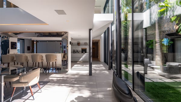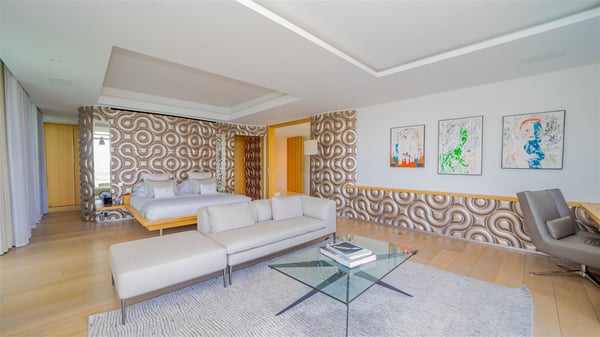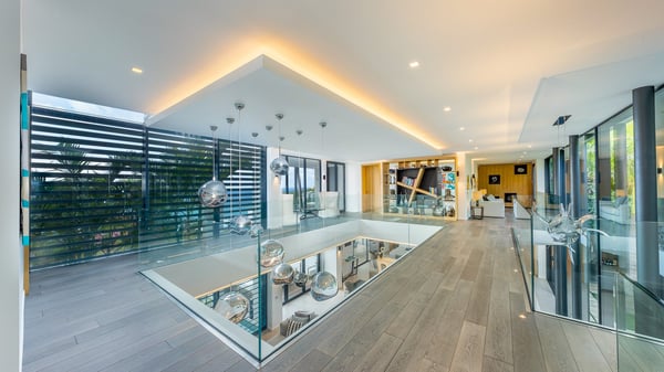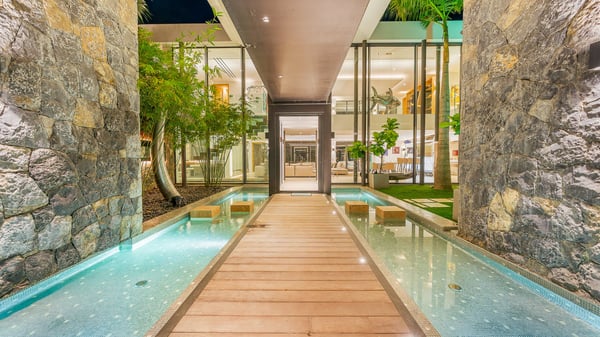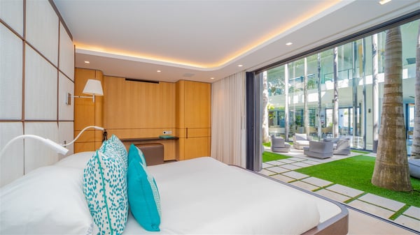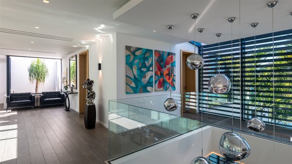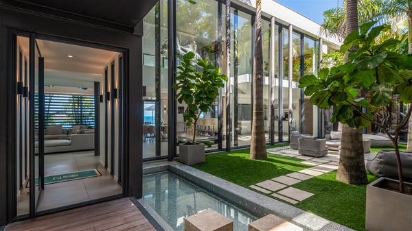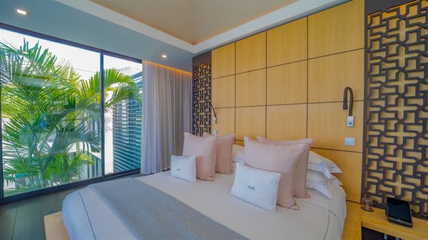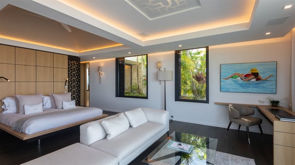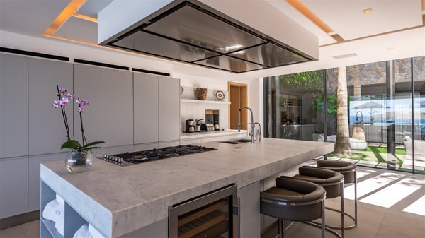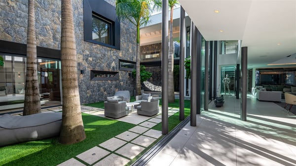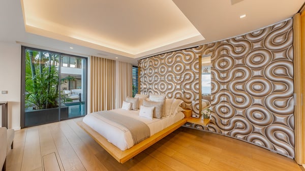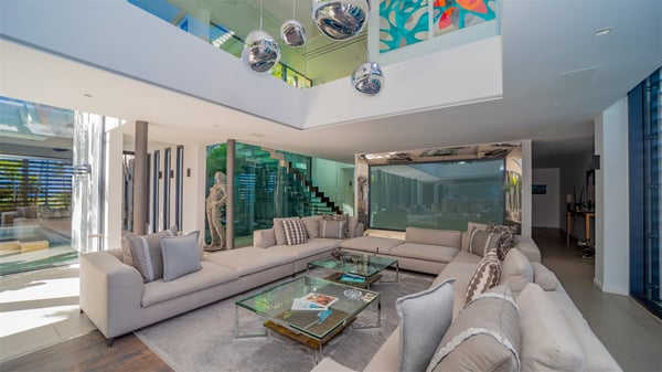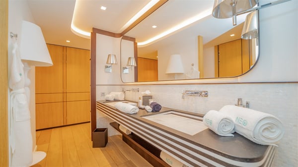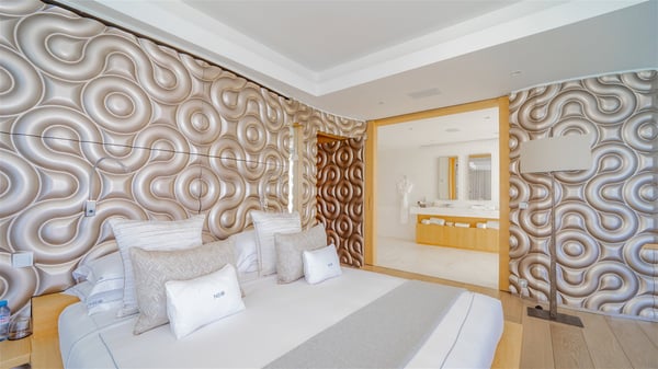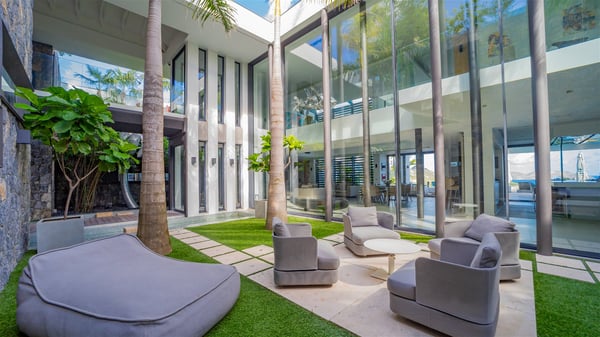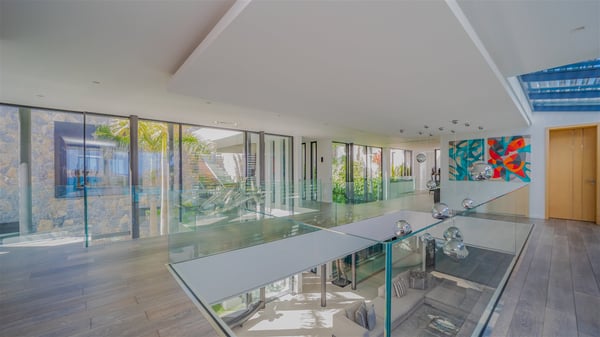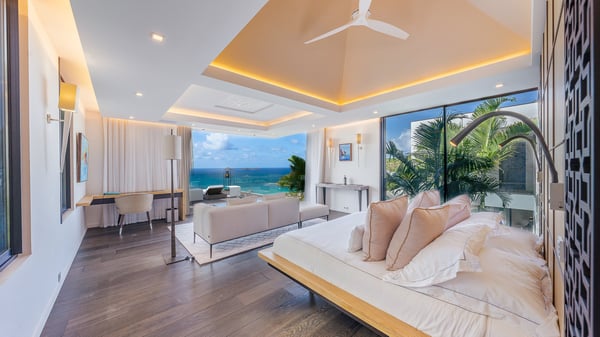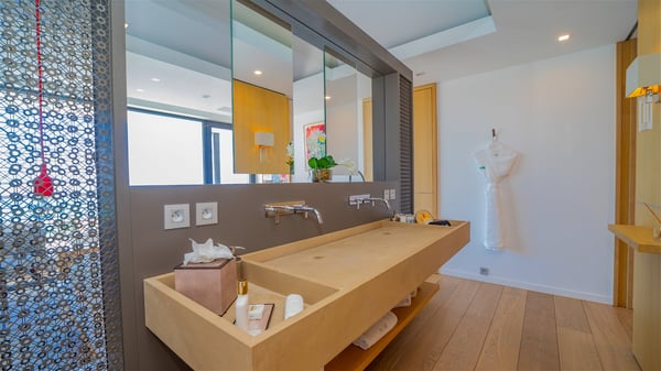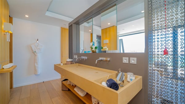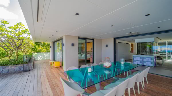 The sumptuous vacation rental Neo is an exceptional property located on the heights of St. Jean. Named as the most beautiful Caribbean villa in 2018, the luxurious decoration and choice of noble materials make this vacation rental a true St. Barths’ gem. Built on two levels, villa NEO was designed in a very chic and modern style. This outstanding vacation home features large rooms and glass surfaces which provide fantastic panoramic views over the ocean and the neighbouring hills. On the main level, the living room welcomes you in a large and comfortable space furnished with spacious sofas, under the ceiling opening onto the upper level. The dining room is ideal for having meals in a soft, luxurious and refined decor. The kitchen is perfect for preparing your meals and drinks unless you prefer to call upon a private chef who can cook in a second kitchen specially designed for this purpose. There is also an entertainment room with a TV, a bar and a pool table, as well as a private disco room for late nights. On the terrace, the panorama over the bay and the ocean is incredible, as far as your eyes can see. The outdoor facilities are exceptional: there is a large heated infinity swimming pool (30 meters long), an outdoor lounge, sunbeds and an alfresco dining room for your meals in the gentle trade winds. All is beautiful and majestic, in a nice setting of exotic tropical vegetation. The luxury villa Neo welcomes you in six superb air-conditioned suites spread over the two levels of the property. Two of the bedrooms connect, although each has its own bathroom. They feature spacious dressing rooms, sitting areas, access to the terrace and whirlpool tubs and materials such as marble and mosaic. Five bedrooms open onto the panoramic view, while one room opens back onto the patio. An elevator, an air-conditioned fitness room and a steam room are also at your disposal in this sumptuous vacation rental in the heart of the Caribbean.