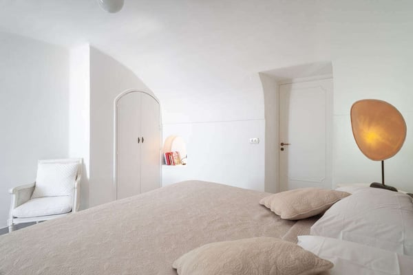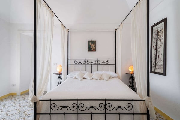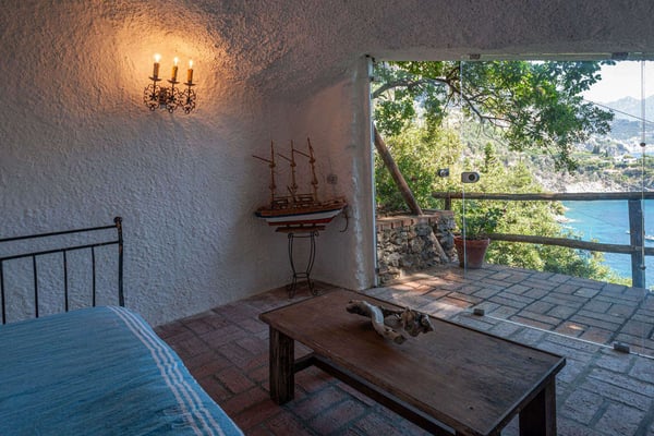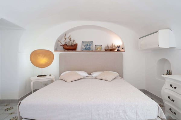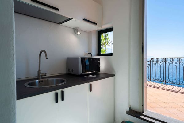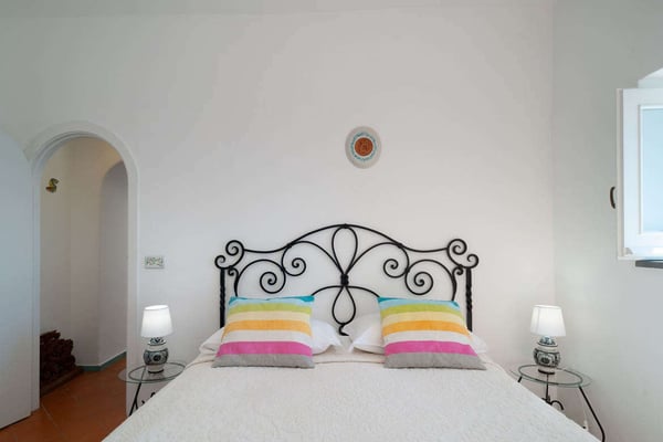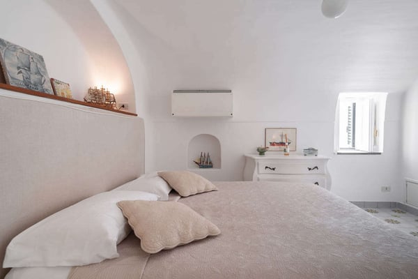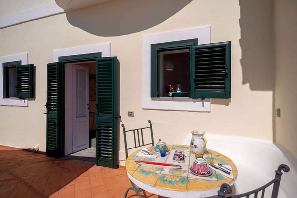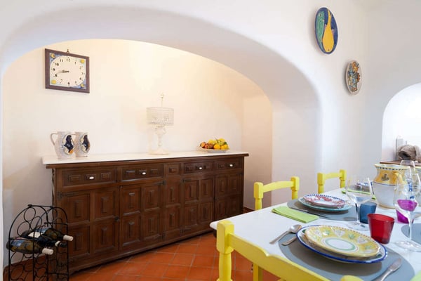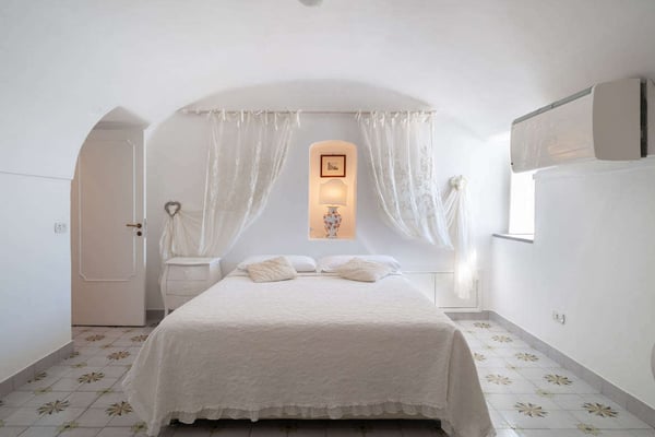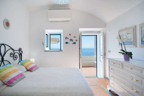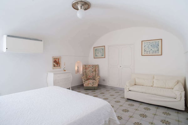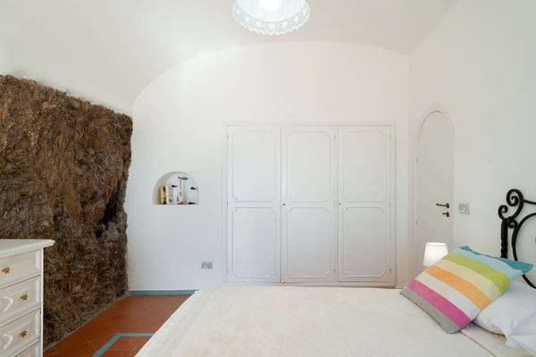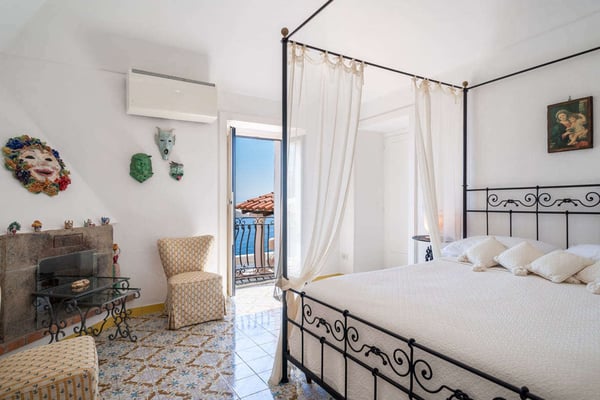 This beautifully peaceful and super-panoramic property, fully air conditioned in all bedrooms, is situated in Conca di Amalfi on a beautiful strip of coastline offering some of the area’s most panoramic views. Roughly 1,5 miles from the center of Amalfi, the property is situated in a very strategic area offering the best of the Amalfi Coast. The immense piece of property (60,000 sq. feet of land) is immersed in Mediterranean floral, vegetation, and trees and offers direct access, via a pathway and steps, directly down to the waterfront and some of the most pristine waters of the entire area. The 2798 square feet of covered house, dating back to 1820 but recently undergoing a complete restoration, offers an additional 3000 in usable, furnished terrace spaces. The property entrance is located directly off of the main coastal road (and offers one, enclosed parking spot), however, there are 90 steps leading down from the main road to the private gate which enters the property. The property offers various pathways intertwining throughout and the extreme left area of the property offers a stone ‘grotto’ from where one can sit and enjoy some of the panoramic views. To navigate the property requires walking, steps, and various terraces. The main terrace of the 3-story house is located about 100 steps down from the main gate. The front door is found off of the main terrace, which offers the most amazing panoramic views and tranquility. The main terrace, with its white color motif and tile floors, boasts a stone barbeque, dining table for 4, various seating areas, a glass coffee table, couches and chairs with a sun umbrella, and some stone bench seating. The villa is splashed with beach house colors (yellows, blues, and greens) and ceramic tile floors abound. Entrance is into an open format where a small breakfast room bleeds into the bright, ceramic tile kitchen with a four-range stovetop, dining table for 8, refrigerator/freezer, brick oven, and dishwasher. The breakfast room also borders, on the opposite side, the living room and secondary, small reading room. The main living room is an open space with a couch and several chairs, along with a glass coffee table. The smaller reading room boasts a Satellite TV with DVD player and radio. There is also a half bathroom. The first bedroom is found up a half flight of steps from the main entrance to the villa. It looks out onto the main terrace and access to the bedroom can also be achieved directly from the terrace. The very comfortable bedroom is a King size bed with beautiful ceramic tile floors, cupola ceilings, a fireplace, and en-suite, ceramic tile bathroom with Jacuzzi-jet shower. Another ½ flight of steps leads you to another two bedrooms, both doubles (queen size) and both with built-in closets. None of the four bedrooms have doubles that can be split into twin beds. These two bedrooms share an external, ceramic tile bathroom with shower. Down a flight of steps from the main terrace, a staircase leads to a super-panoramic external shower. The staircase leads to a second terrace where several sun lounge chairs and a sun umbrella offer even more amazing views and a 6-meter-long x 3-meter-wide ‘grotto’ heated pool/Jacuzzi coming out of the stone wall and plunging onto this second terrace. This terrace wraps around to yet another external terrace from where a small annex/guest apartment lies. CIN: IT065044C2DSWPN9DS