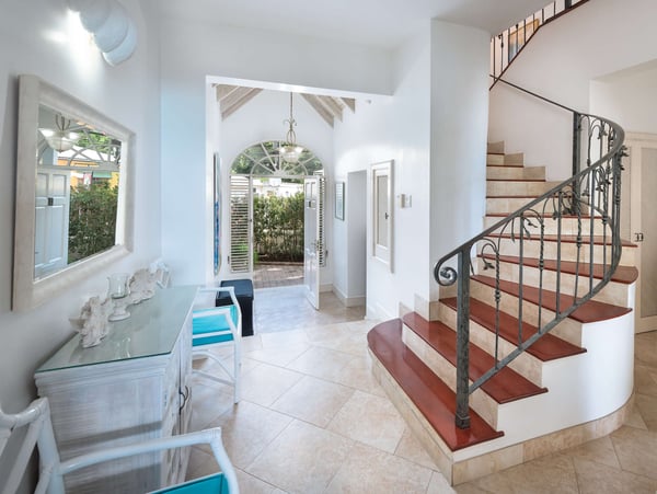 Please note the beach experiences seasonal fluctuations in its accessibility. Seashells is a three-story beachfront villa on the west coast of Barbados' Paynes Bay, offering seclusion and island charm. This property embraces outdoor living, and it features a spacious covered verandah and an open-air deck, seamlessly blending Caribbean Sea views with lush tropical gardens. The entrance leads to an open-plan living and dining area, as well as a kitchen. French doors open onto the patios, creating an indoor-outdoor flow. The coral stone walls exude tropical charm, and the patio features seating areas, a dining table, an open-air deck, and a private plunge pool. A BBQ gazebo awaits al fresco dining. A private gateway leads to the soft sands of the bay. The decor is Caribbean chic, with warm colours and local art. The living area boasts a TV, and modern amenities. The bedrooms are reached via a curved stairwell. Two guest bedrooms, one with a king-sized bed and the other with twin beds, are on the first floor. Both feature walk-in closets and spacious en-suite bathrooms. The master bedroom on the third floor includes a four-poster king bed, a seating area, and an office nook. A double balcony offers ocean views.