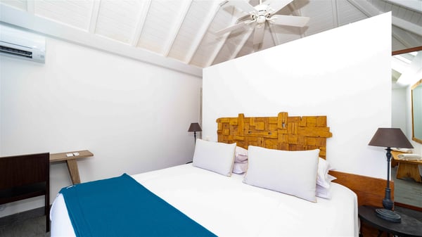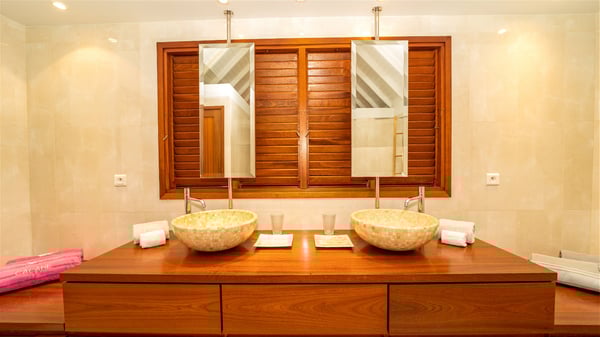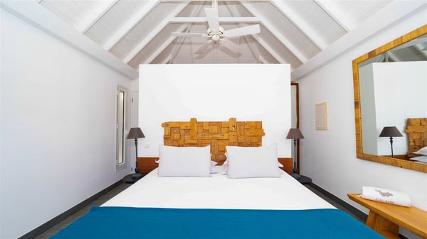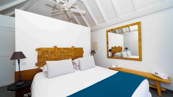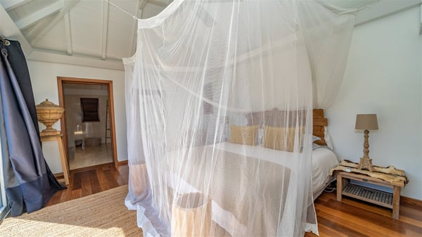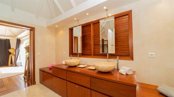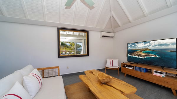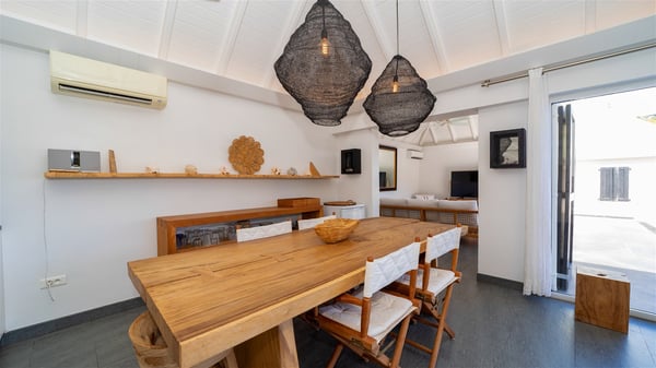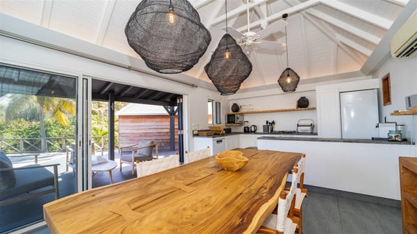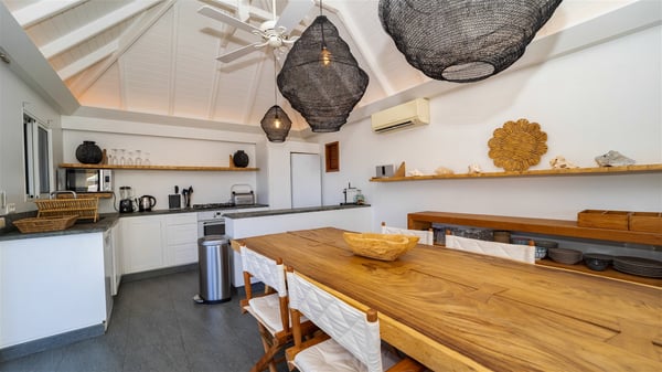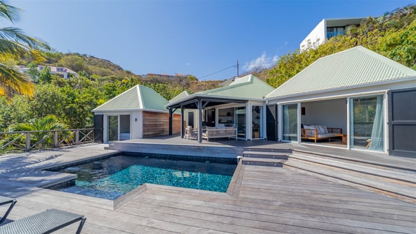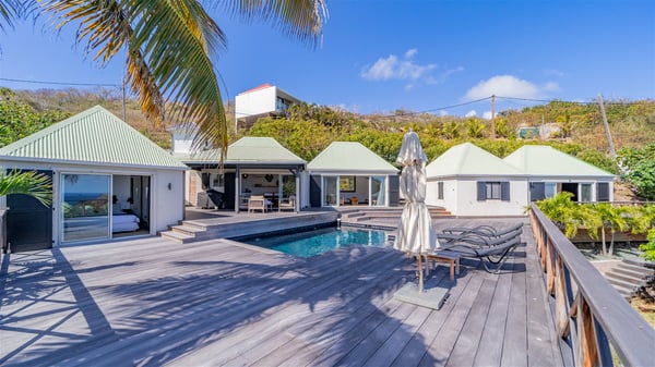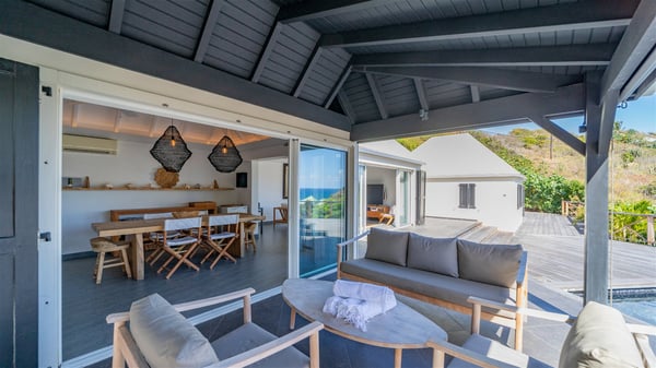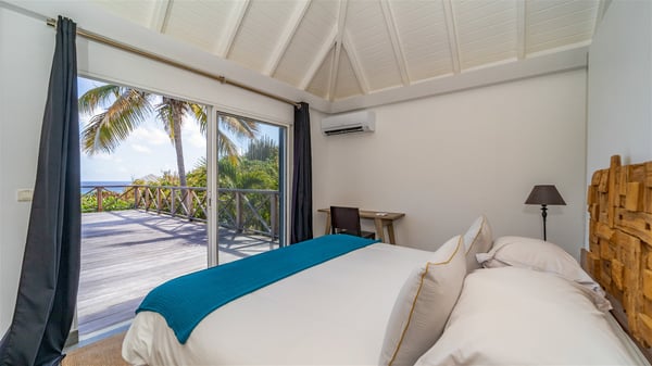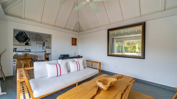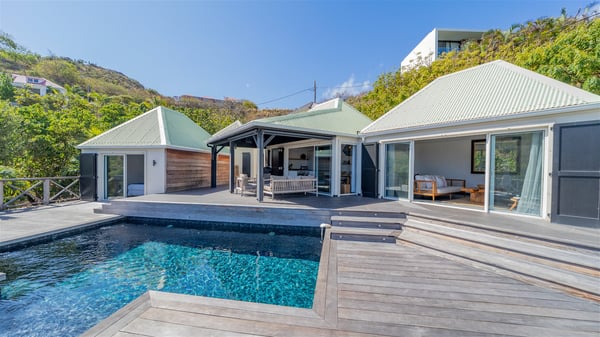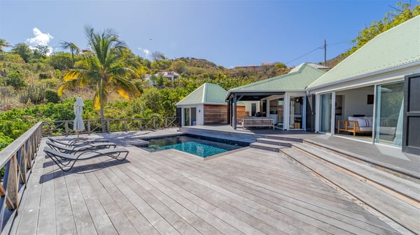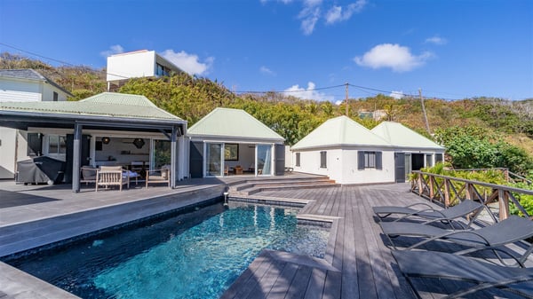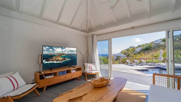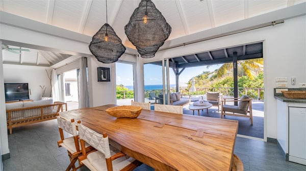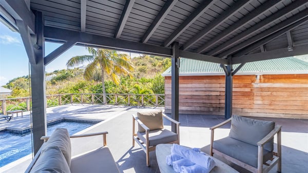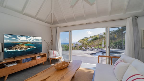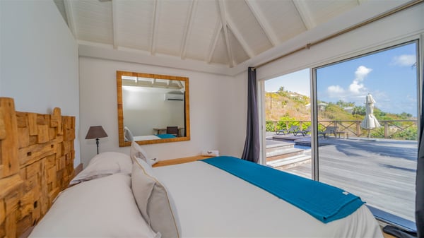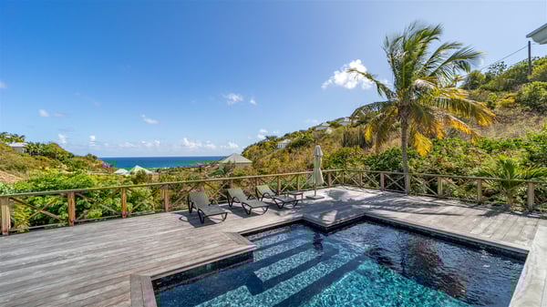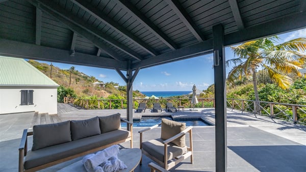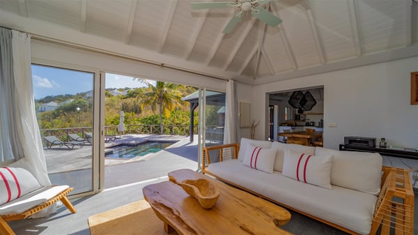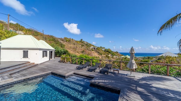 Located on the heights of Petit-Cul-de-Sac, the luxurious rental villa Mademoiselle is the charming haven of peace you’re looking for on your next vacation in St.Barths. Perfect for two couples travelling together, this traditionally styled home offers a high level of amenities in a simple and elegant decor. In a contemporary and chic ethnic-themed atmosphere, the cozy and open-plan living area features a large sofa and a coffee table facing the terrace with a breathtaking view over the lush environment. In the extension of this living space, the dining area has a beautiful, massive wooden table under a white vaulted ceiling, which brings a delightful touch of authenticity and a nice volume. At the back, the kitchen is well equipped for succulent meals preparation, in the heart of a natural and mineral-inspired setup. Outside, there is an expansive teak terrace for pleasant moments of rest and relaxing around a beautiful swimming pool as well as a sunbathing area shaded by a cream-colored umbrella. You’ll enjoy the amazing view over the ocean and the nearby hills. An outdoor lounge is located under the covered terrace, gently swept by the trade winds while time seems to softly slow down. The holiday rental villa Mademoiselle in St-Barths has two charming bedrooms with king-size beds and private bathrooms with showers and double sinks. Spacious and elegant, they are located on either side of the living room for maximum privacy. A direct access to the terrace from each room, curtains and wooden objects create a peaceful atmosphere for an unforgettable stay in the Caribbean. The rental villa Mademoiselle is calm and quiet, making you feel at home for a dream stay in St-Barths.