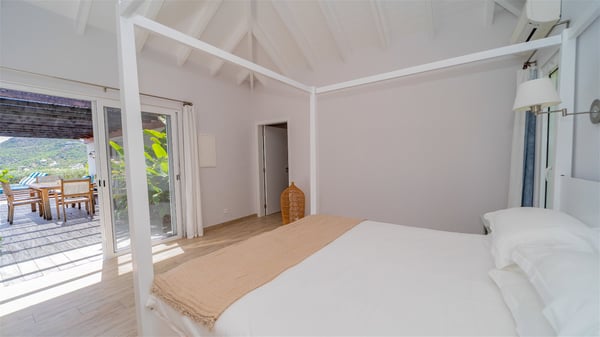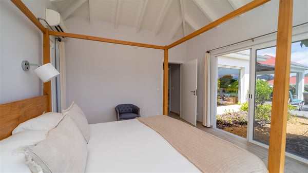 The vacation rental Paille En Queue is a charming property located on the heights of Saint-Jean in front of an amazing view over the hills and the ocean. Very comfortable and spacious, this vacation home with a swimming pool is the perfect place for an unforgettable getaway for four in the Caribbean. Villa Paille En Queue is a single-story property opening onto the breathtaking panorama over Saint-Barths’ rolling hills and the deep blue ocean. The large, fully air-conditioned living room offers a delightful feeling of volume, with high ceilings and glazed doors letting in the Caribbean light. The lounge is comfortably furnished with sofas and an HD screen, perfect to relax and sip a cocktail. The indoor dining room for four guests is close to the fully-equipped kitchen with a central island. As it opens both onto the front and the back where you’ll find a lovely planted terrace with barbecue, the living area welcomes guests in a peaceful, cozy atmosphere. At the front, the terrace of villa Paille En Queue is a most exquisite place for guests who will enjoy a heavenly, very private atmosphere. Under the sun-filtering roof, the al fresco dining room welcomes six guests for al fresco diners, blown by the gentle trade winds. Facing the ocean and St-Jean, the lovely swimming pool sparkles under the sunshine, near the deckchairs perfect for sunbathing and reading sessions. On the side, there is a second covered outdoor lounge, the perfect place to relax and chat by the pool. In the mild island air, you’ll love taking time to enjoy the quiet atmosphere, and watching the stunning panorama. The holiday rental Paille En Queue consists of two air-conditioned bedrooms with en suite bathrooms and queen-size beds. One of them is located near the living room, and the second one can be accessed via the terrace. They are both bright and comfortable, with vaulted ceilings that provide a romantic touch to the whole. In the mild and gentle Caribbean, villa Paille En Queue is the perfect place to stay with friends or family in St-Barths.