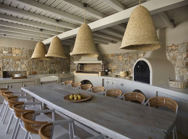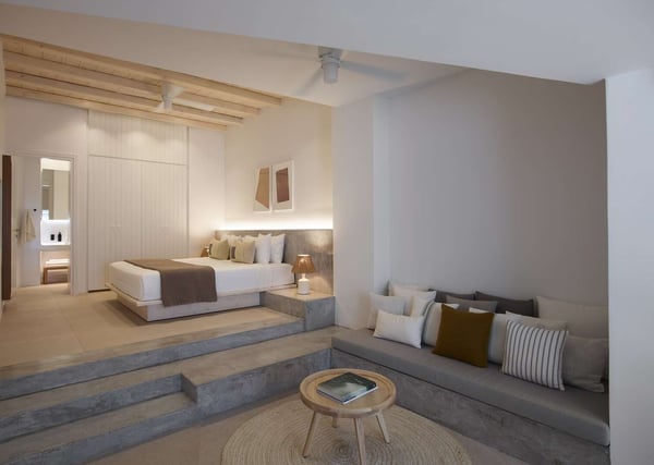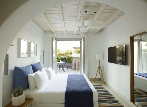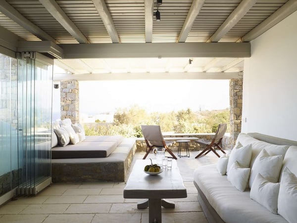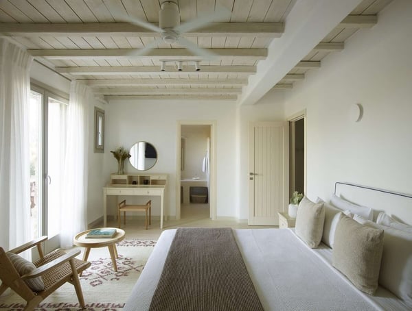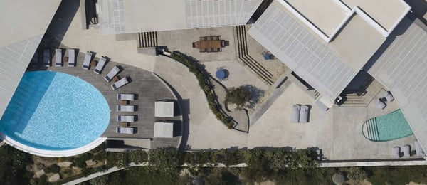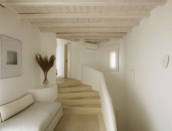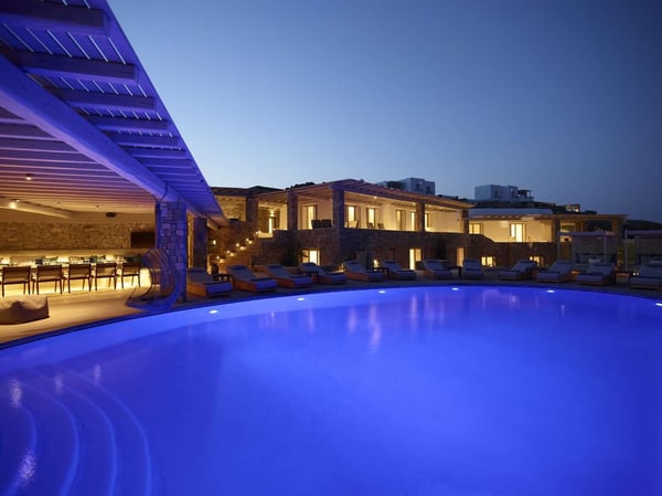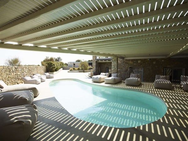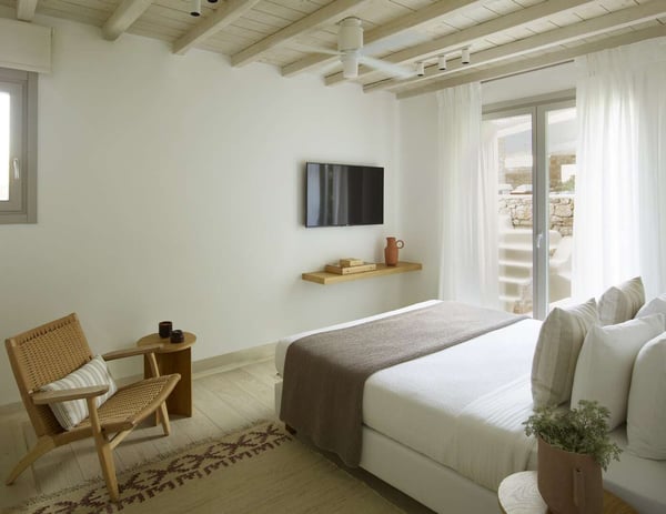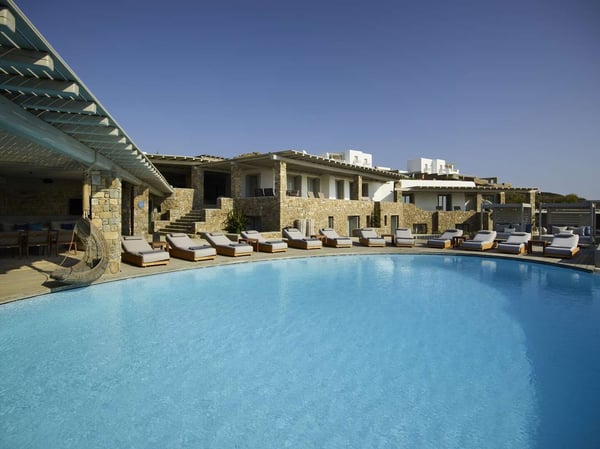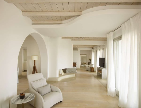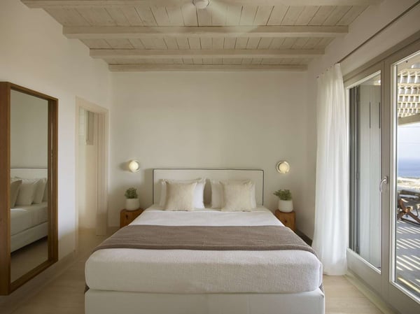 This modern new villa is located on the Cycladic Island of Mykonos, near Kalo Livadi (2km), Kalafatis Beach (1,5km), and Lia beach (3km), 10 km from the port of Mykonos and 11 km from Mykonos airport. It features magnificent sea views and three amazing infinity swimming pools with grand shaded surrounding areas of over 400sq. meters, suitable for dining and lounging at all hours. Not far from Bluewave Villa, you will find the idyllic beaches of Kalo Livadi, Agia Anna, Lia, Elia, Kalafatis, Ftelia, Agios Sostis, Panormos Beach, renowned for numerous watersports activities as well as for their great restaurants such as Solymar at Kalo Livadi, Spilia at Agia Anna, Allemagou at Ftelia and Liasti beach club at Lia beach. Consisting of a main building, 700 m2 at the ground floor and upper level, three guesthouses of 45 m2 each at the top upper level, one guest house of 55m2 and three extra guestroom of 25 m2 at entrance level as well as a large gym and spa area of 200 m2 and outdoor shaded areas of over 400 m2 in plot area of 3.000 sq. meters. Bluewave Villa consists of eleven spacious bedrooms with en-suite bathrooms, plus seven large guest rooms with individual entrances. This spacious summerhouse is decorated in harmonic shades and features, sleeps 36 guests and offers a selection of versatile living spaces for easy entertaining and uncomplicated holidaying. Enjoy a good night’s sleep on a Simmons mattress, relax at the soft touches of elegant sophistication and Greek colors sofas and the view from the bedrooms. Every bedroom and living room is equipped with a smart TV, hairdryer, safe box, ceiling fan and A/C, so that each member can be independent. A perfect spot for guests looking to enjoy Mykonos in a luxury and stylish to the last detail environment spending time close to a great choice of famous beaches and clubs/restaurants and yet not far from the night life for which the island is famous.