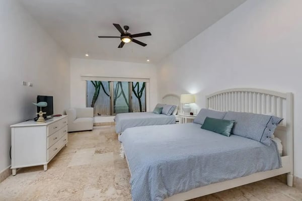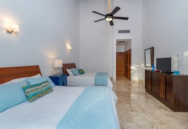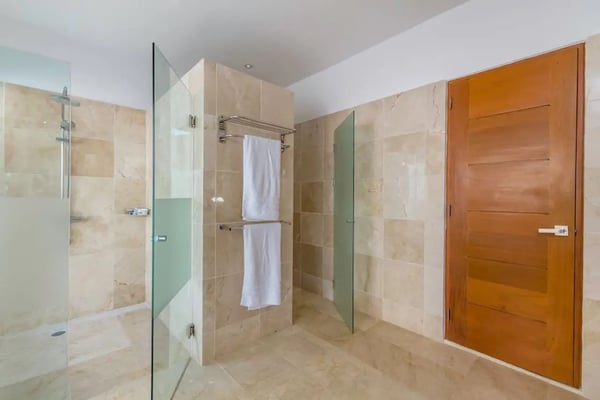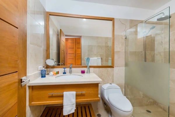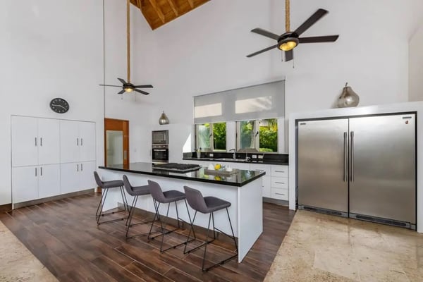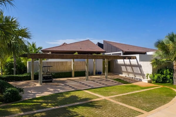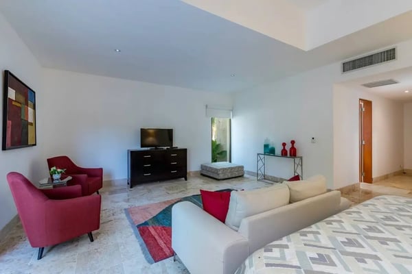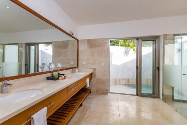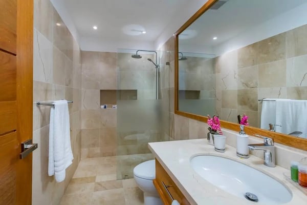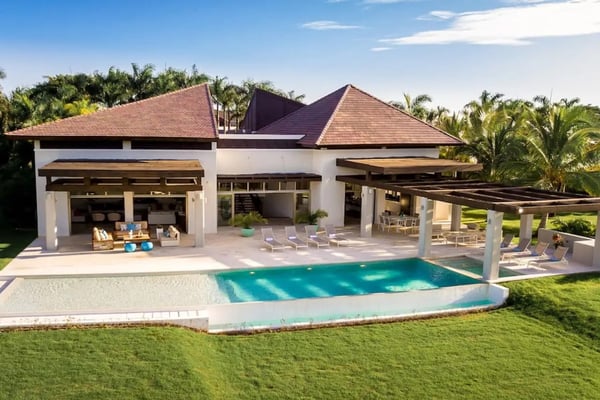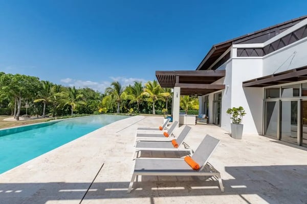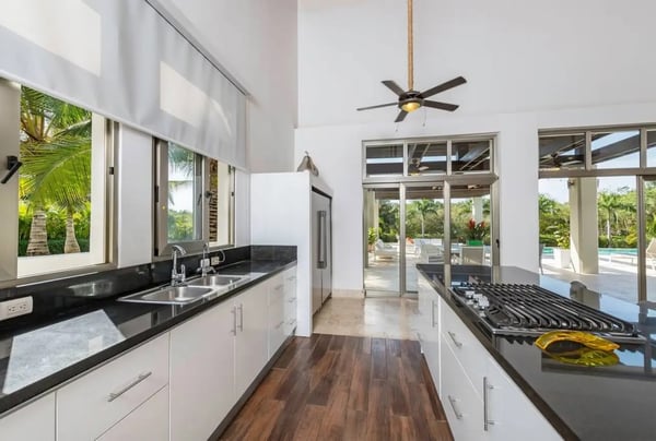 All guests must register with the Casa de Campo Concierge office, and for a small daily fee ($30 per adult per night & $15 per child per night), are granted access to resort areas and amenities. Casa de Campo Resort facilities and amenities include golf courses ($), the fitness centre ($), racquet center ($), restaurants ($) and bars ($). Contact Rental Escapes for more information about pricing. Villa Perfection is an impressive 12.000 sq. ft., 7-bedroom, 7 1/2 bath villa built on 3 levels (the main level and 2 lower levels). The property also features an enormous backyard and lawn area surrounded by palm trees and lush vegetation. The expansive grounds make this villa ideal for hosting private events. The interior design is very modern with clean lines, great furniture, high ceilings, light colors, lots of great design features, and no clutter. This is a place that will make you feel welcome and relaxed. The large terrace has several lounge areas and overlooks the swimming pool and enclosed, private garden. The swimming pool has a wading area (shallow area), which is ideal if you have small children. The open kitchen and dining area is the heart of the villa where you can entertain with your friends, enjoy delicious meals, fine wine, and good conversations. The kitchen is fully equipped with everything necessary to cook delicious meals during your vacation - AND your villa rental includes a private chef to prepare all of your meals at the villa (food and beverages are not included). From the kitchen/dining area, you have direct access to the covered terrace by the swimming pool. This is a semi-shaded area with a small outdoor dining table, a sitting area, and pool chairs. Outdoor ceiling fans are available to keep you cool. The formal living room is a beautiful space with several comfortable sofas and chairs. Slide the big windows open and step right out onto the terrace where you have another sofa sitting area with ceiling fans – if you prefer to sit directly by the pool. Get the popcorn ready and enjoy movie nights in the TV/media room, which has a comfortable sofa. Your kids will love hanging out in this room! The seventh bedroom is located on the second lower ground floor and offers complete privacy in its own, comfortable surroundings. This bedroom has two queen beds, air conditioning, a ceiling fan, a TV, a closet and dresser, and an ensuite bathroom with a shower.