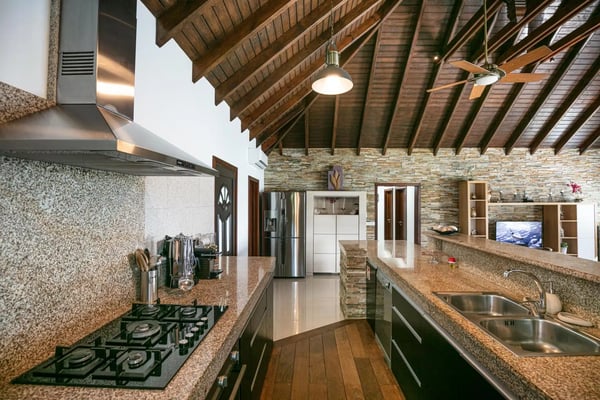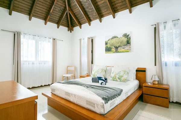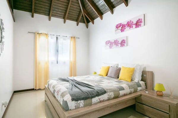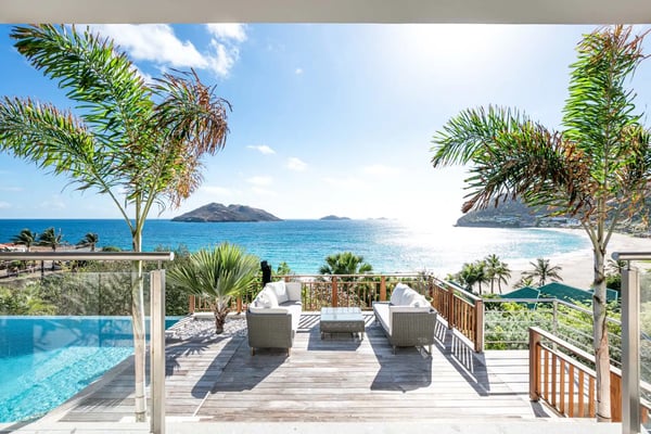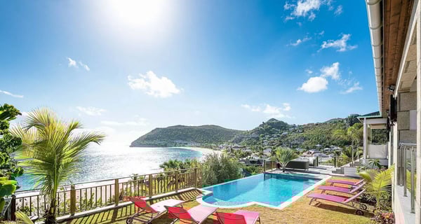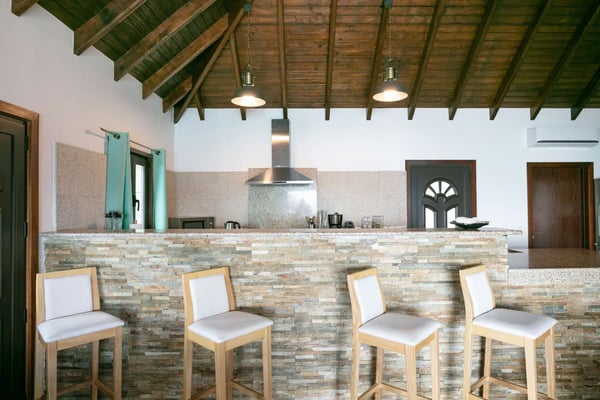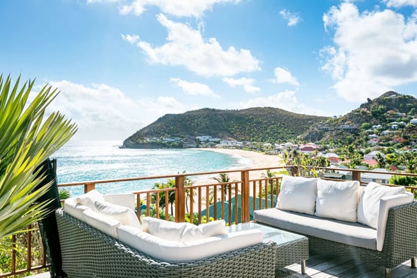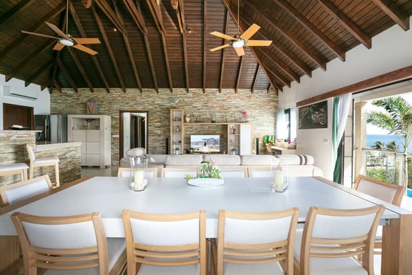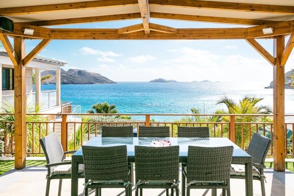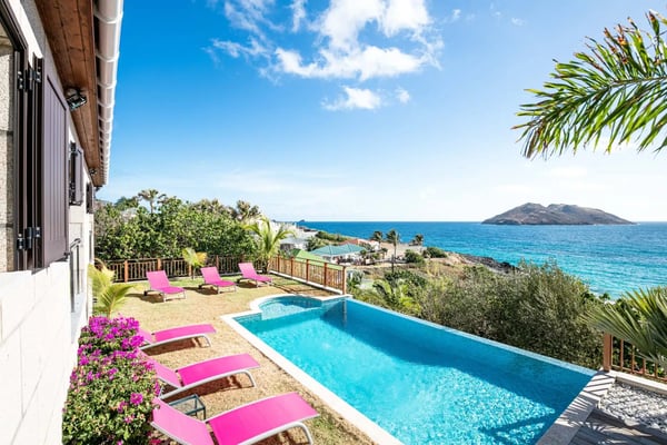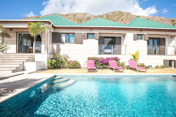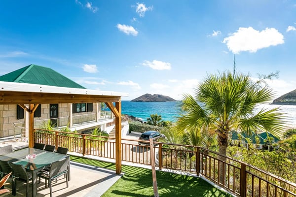 The newly built Villa Estrela is indeed a rising star on the island of St. Barth. Constructed in a traditional Caribbean style, with warm mahogany-toned wood for the pitched ceilings, the luxury rental home is a haven for families, as all four of the bedrooms are beneath the same roof. The property also benefits from its splendid beach and sea views and its convenient location right at the end of Flamands Beach all you need to do is go outside and cross the street. A short trail that leads to Colombier Beach is also right nearby. Villa Estrela sparkles with style and attention to detail. A comfortable, thoughtfully furnished (with a few retro midcentury touches) and fully air-conditioned living and dining area opens out onto a small terrace, and a set of stairs takes you down to a pool and lawn with loungers for sunbathing, both of which have those tremendous sea views. On the other side of the living area is a kitchen that's open to the sitting room with a low counter with barstools in between. There's a second, outdoor dining area with a gas grill to the right of the house. All four of the bedrooms lie to the left side of the living area. Each of them has a queen bed and air-conditioning, and two of them look out over the sea. Three of them have ensuite bathrooms, and the fourth has a bathroom next door, which can also serve as a guest bathroom for the villa.