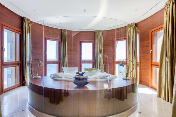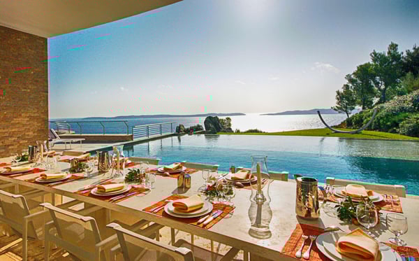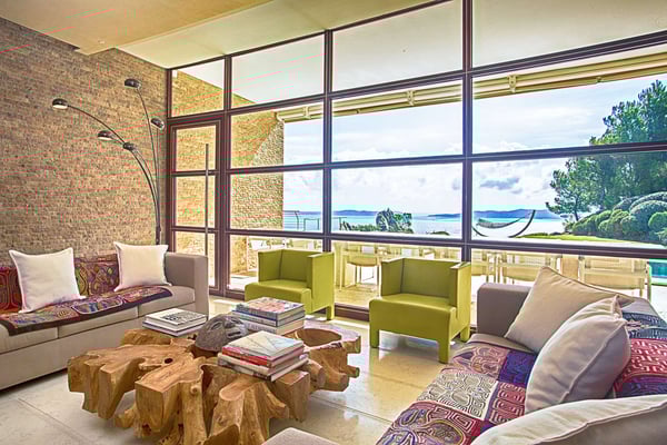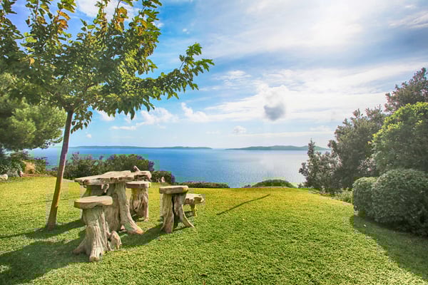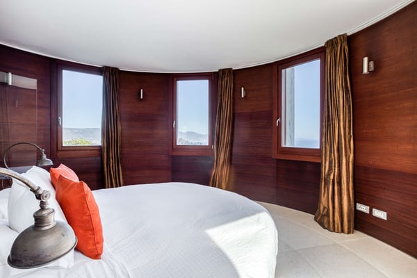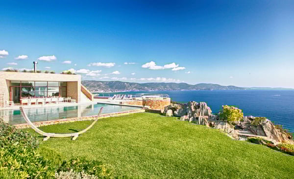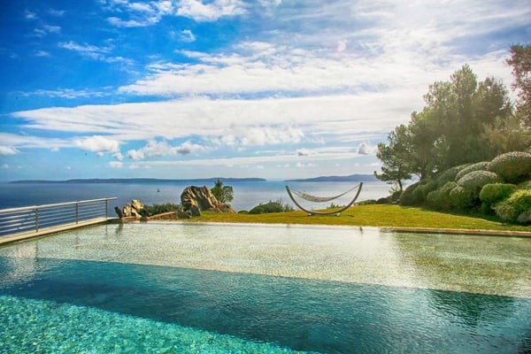 This unique and contemporary house, overlooking the Mediterranean Sea, is located in the heart of the private estate at Cap Benat, in the Hyères area. A gorgeous villa that has been built on three levels and ingeniously integrated into the hillside with an unobstructed view over the Sea. This large and modern property of 1,200 sqm of living space with eight air-conditioned en-suite bedrooms, a large stone terrace, infinity swimming pool is perfect to host 16 guests. A small harbor for private mooring, tennis courts, and private beaches within the domain. 45-minute drive to Saint Tropez. There is also a small beach nearby, specially arranged, where all the children and nannies meet at the bottom of the hill.
