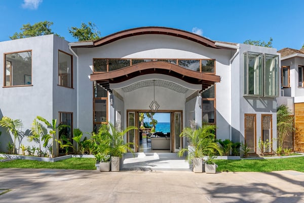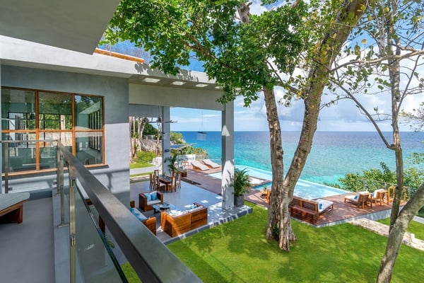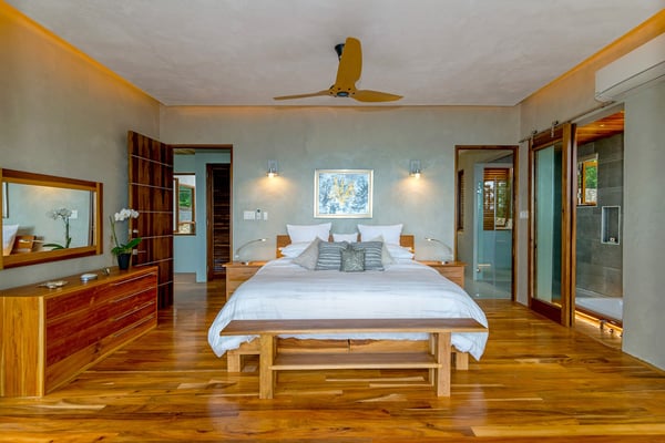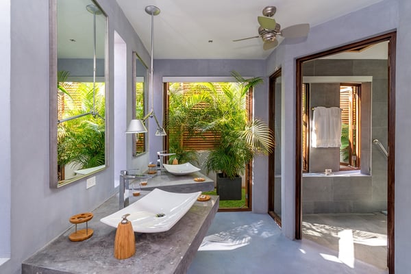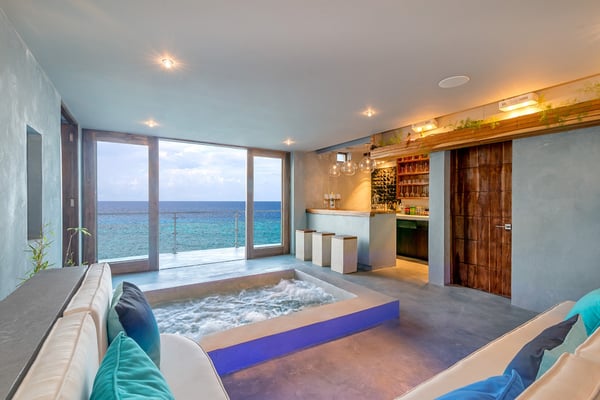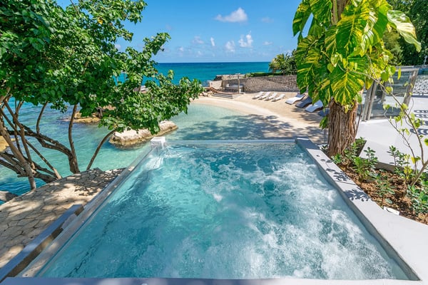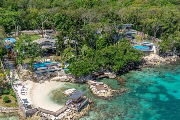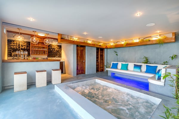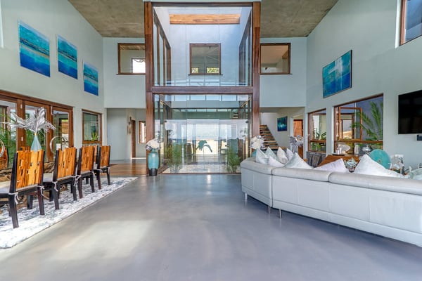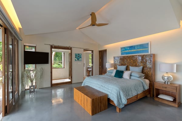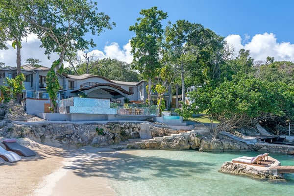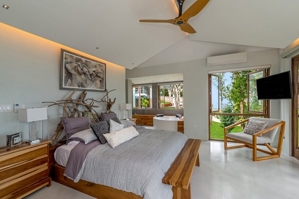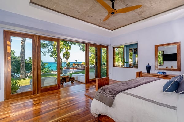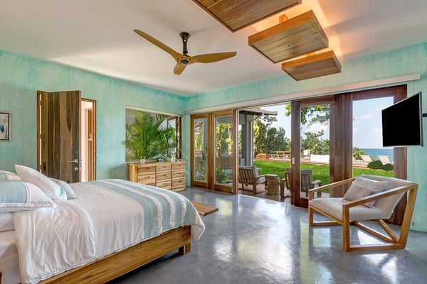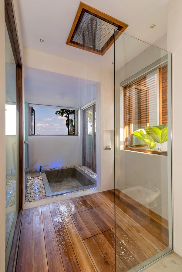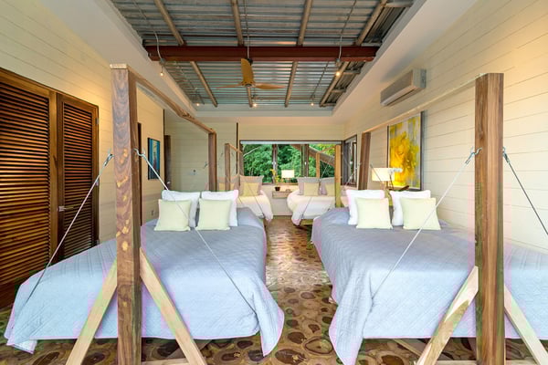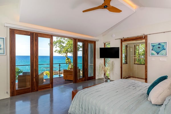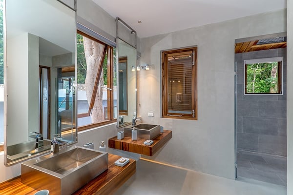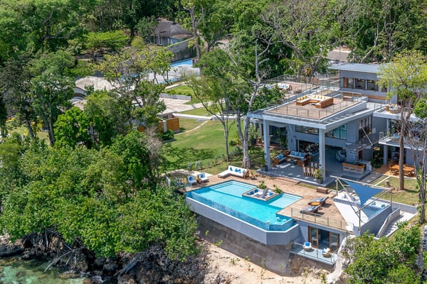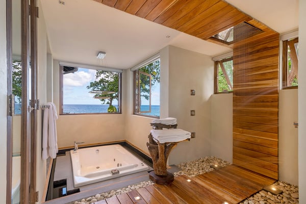 Please note that the private spa is currently unavailable.: Promiseas Villas are located on a fabulous private sandy cove, which are newly completed and exceptional in every way imaginable. These side-by-side villas with four bedrooms each are beautifully decorated. Excellent use of local wood (Modern Teak, Guango, Spanish Elm, and driftwood) adorns these properties. Major design elements of Promiseas Villas are the unique water features throughout the property and the modern architecture by Jeremy Millingen. Promiseas 1 has a spectacular curved shingle roof, a curved mirrored entrance ceiling with contemporary lighting to highlight all areas, and Blue Mahoe ceilings. The unique design features of Promiseas 2 include a glass atrium in the center of the living room with a beautiful Teak tree growing through the open top, a third-floor tree house bedroom, and a living room with spectacular views of the sea. The hot tub, in its man-made underground cave, is surrounded by bamboo with a bar and massage deck overlooking the sea.