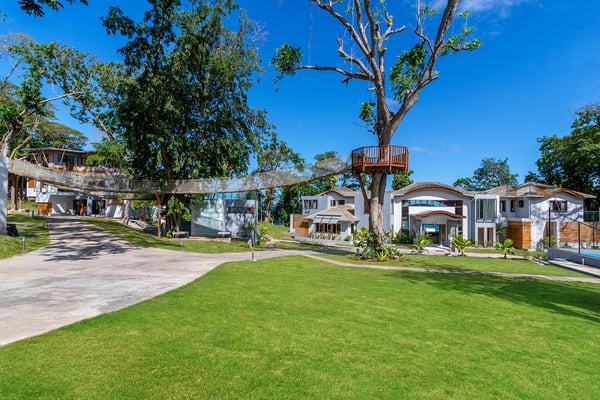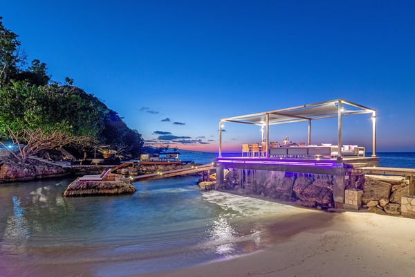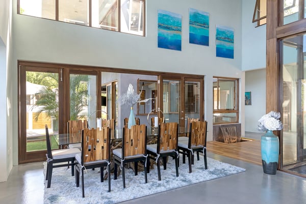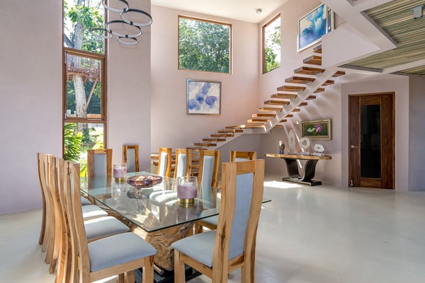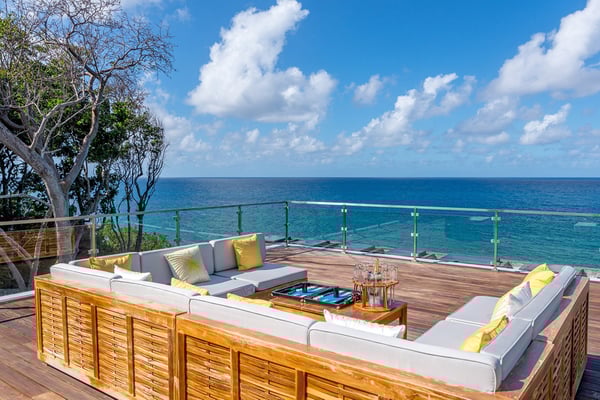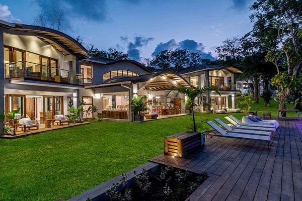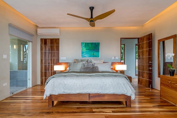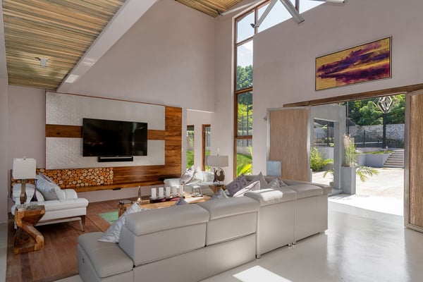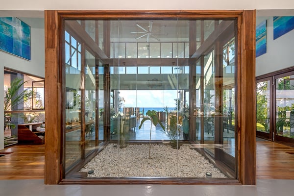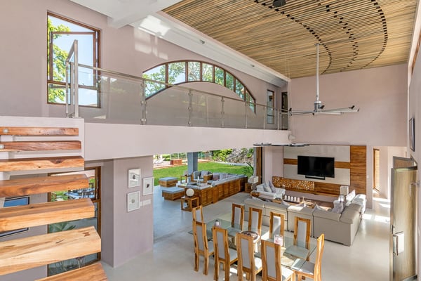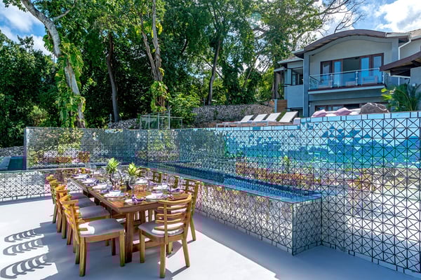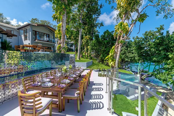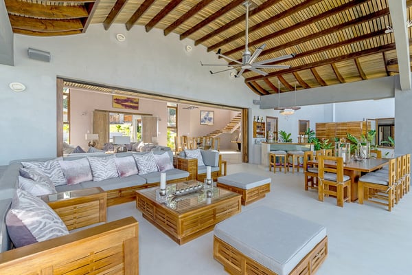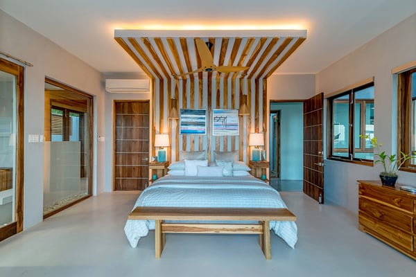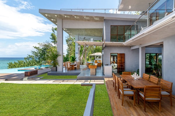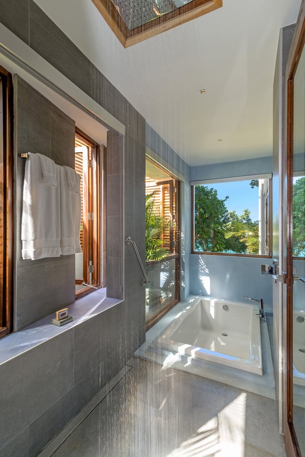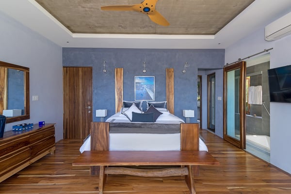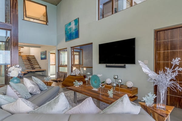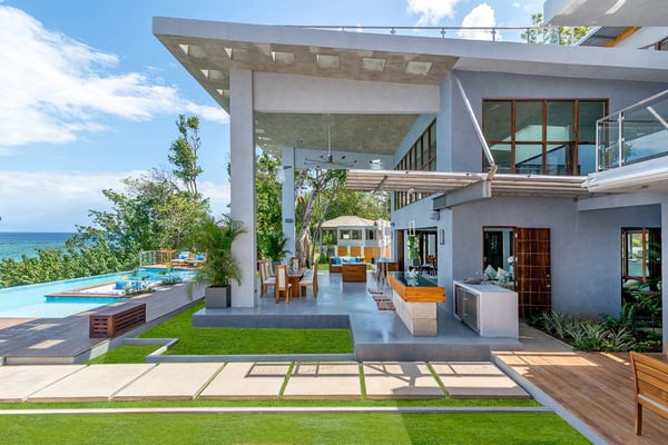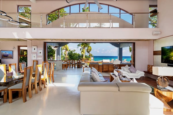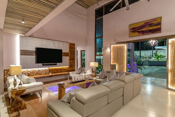 Please note that the private spa is currently unavailable.: Promiseas Villas are located on a fabulous private sandy cove, which are newly completed and exceptional in every way imaginable. These side-by-side villas with four bedrooms each are beautifully decorated. Excellent use of local wood (Modern Teak, Guango, Spanish Elm, and driftwood) adorns these properties. Major design elements of Promiseas Villas are the unique water features throughout the property and the modern architecture by Jeremy Millingen. Promiseas 1 has a spectacular curved shingle roof, a curved mirrored entrance ceiling with contemporary lighting to highlight all areas, and Blue Mahoe ceilings. The unique design features of Promiseas 2 include a glass atrium in the center of the living room with a beautiful Teak tree growing through the open top, a third-floor tree house bedroom, and a living room with spectacular views of the sea. The hot tub, in its man-made underground cave, is surrounded by bamboo with a bar and massage deck overlooking the sea.