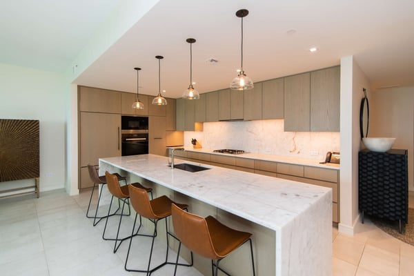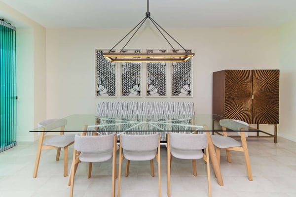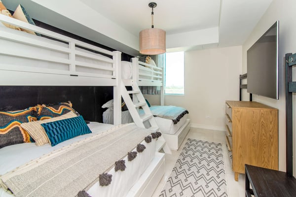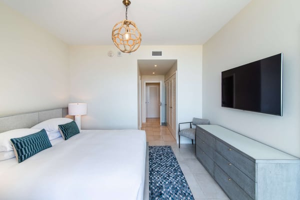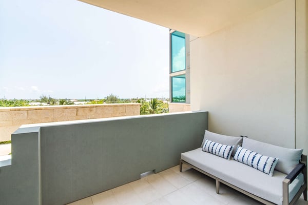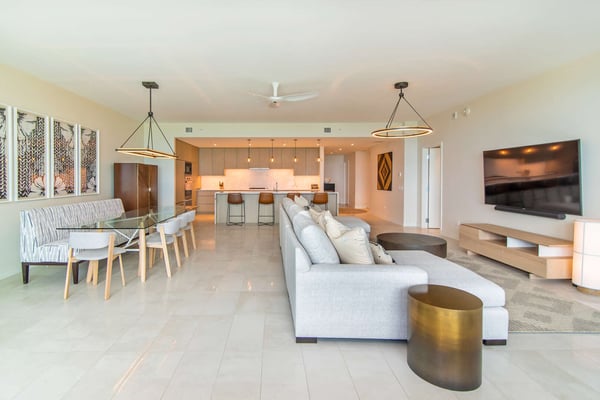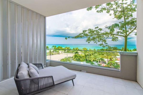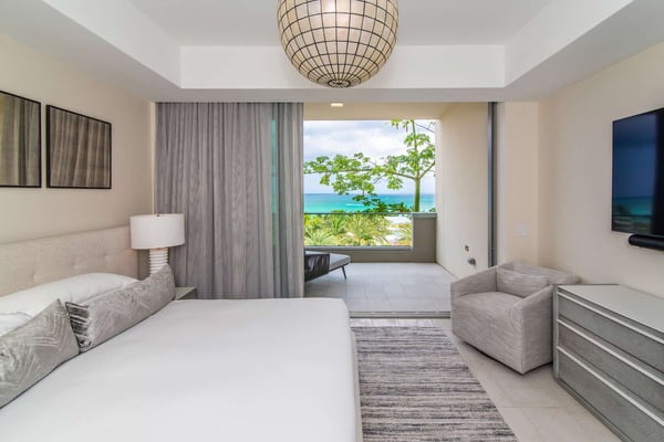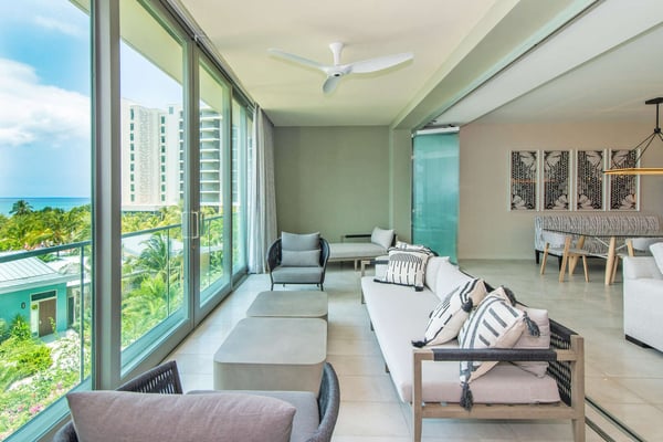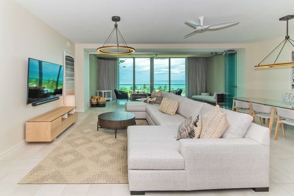 Modern design meets the timeless beauty of Seven Mile Beach at this three-bedroom, three-bath, 2,944 square foot condo at the Residences at Seafire. With walls of sliding glass, this 3rd-floor unit presents an unforgettable view of the sea and Seven Mile Beach. The Residences at Seafire combines the resort lifestyle with the comforts of your own private residence. After a day in the sun, take a luxurious shower at home (every bedroom has its own en suite) or a dip in one of the Kimpton Seafire Resort & Spa's glittering swimming pools. Rather not leave your sea-view nest for dinner? No problem. Choose between room service delivery, optional personal chef services, or preparing your own culinary creations in your own kitchen. Speaking of the kitchen: this spacious social hub is a dream for home chefs, with state-of-the-art appliances, a waterfall marble island with seating, and built-in cabinets. Tuck into your meal on the terrace dining table. Even rain can't spoil your evening: a wall of glass slides into place to keep the climate-controlled terrace protected. Or, when the Caribbean sun shines brightly, slide open both the outer and inner NanoWalls to create 860 square feet of gorgeous indoor outdoor living space with two lounging and dining areas in the sea breeze.
