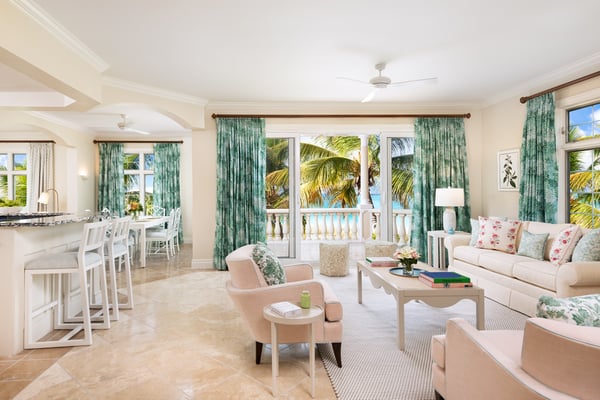 The splendid Ocean Front Luxury Three Bedroom Suite is a unique haven. Its handsome and dramatic Caribbean Colonial decor showcases fine craftsmanship with stunning rattan-lined cathedral ceilings, Italian granite and handcrafted antiques. Other perks of perfection include a media room with flat-screen television and Wi-Fi. With 2600 square feet, this Suite comfortably accommodates up to six.