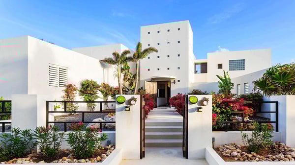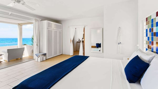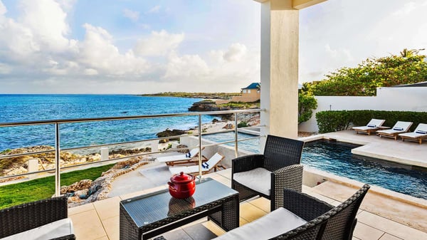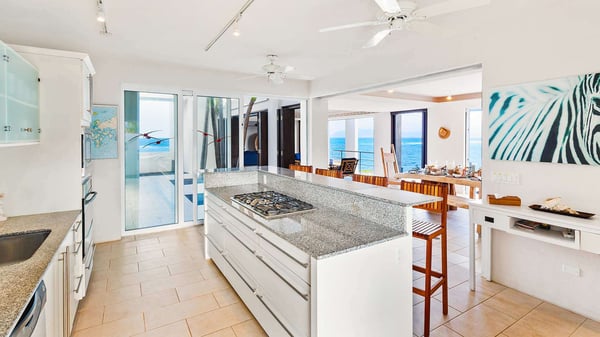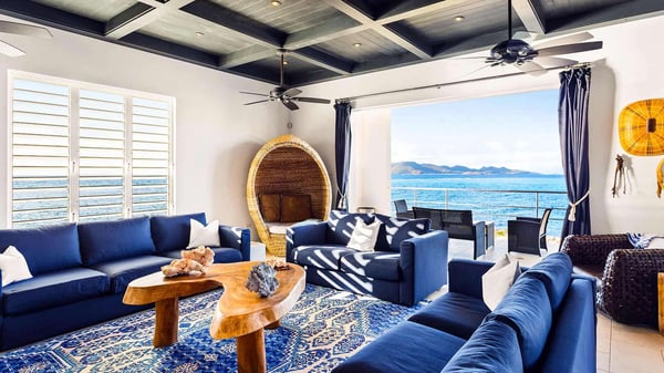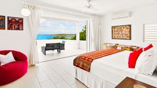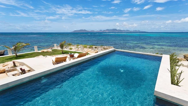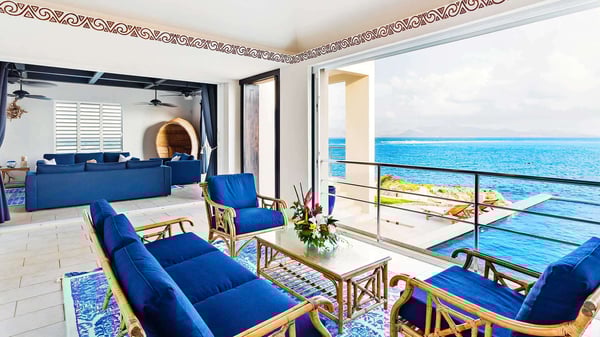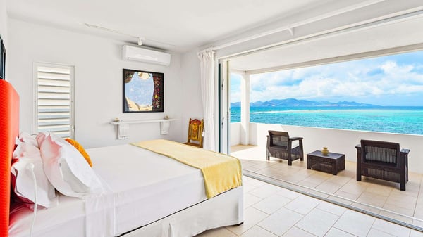 Limin’ Da Coconut is a stunning modern villa perched above Anguilla’s Little Harbour, set on a secluded stretch of coastline with turquoise waters and breathtaking blue skies, perfect for those seeking luxury villas. The grand modern entrance, adorned with bougainvillea and lush landscaping, provides an impressive welcome. Designed with clean, stark white lines—a hallmark of high-end Anguilla villas—Limin’ Da Coconut seamlessly integrates with its spectacular surroundings through expansive indoor and outdoor living spaces, vast windows, and a private pool. Large doors can be opened to let the gentle Caribbean breezes flow through. A small sandy beach, just steps from the pool deck, offers perfect privacy, or guests can visit Rendezvous Bay, at less than a 10-minute drive away, making it one of the most sought-after villas in Anguilla. Limin’ Da Coconut offers four uniquely themed primary King bedrooms, each with an ensuite bathroom. Accessed via walkways and bridges, these bedrooms provide an indoor-outdoor living experience, and each King Suite includes a private balcony with stunning views. The villa also includes a fifth bedroom with two twin beds and two trundle beds, which can be converted into a King if preferred. Located on the ground floor and without access to a private balcony, this room is ideally suited for children. Additionally, Limin’ Da Coconut features a self-contained apartment with a kitchenette, living area, and a sixth bedroom with its own bathroom. At night, guests can marvel at the star-studded sky from the tower’s viewing deck, which also serves as a very private sunbathing area during the day. The side garden features a spacious grassy area with an oversized hammock, perfect for swinging or relaxing in the Caribbean trade winds, along with a patio ideal for evening cocktails. Experience island royalty and complete relaxation at Limin’ Da Coconut, the ultimate villa vacation destination!