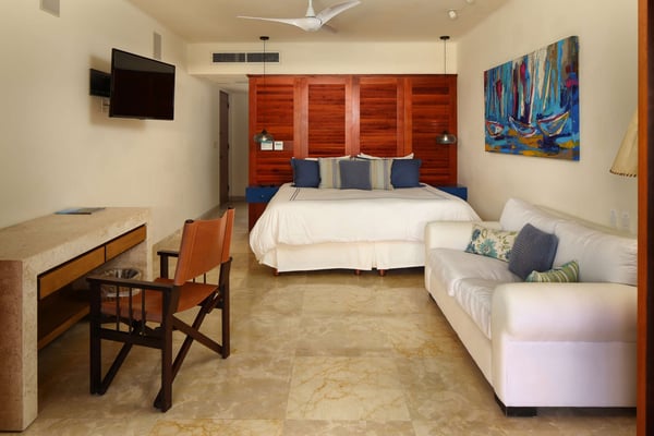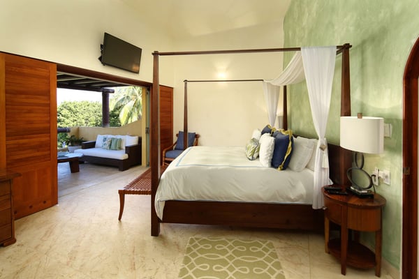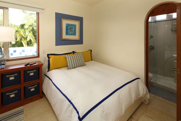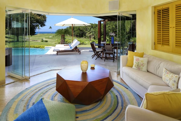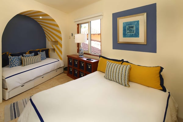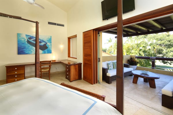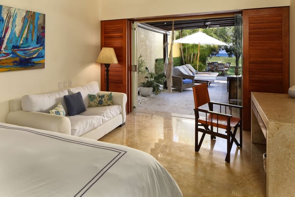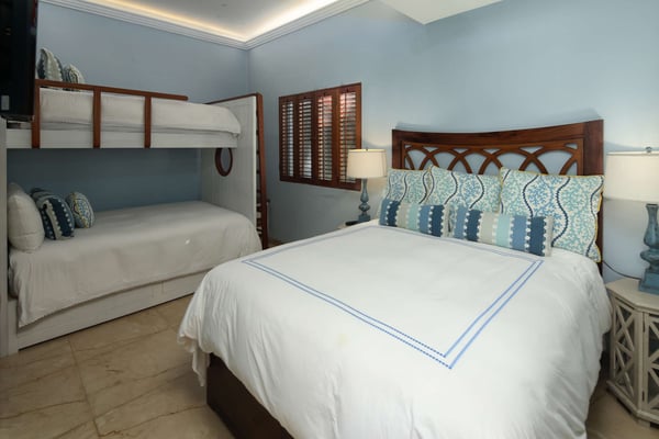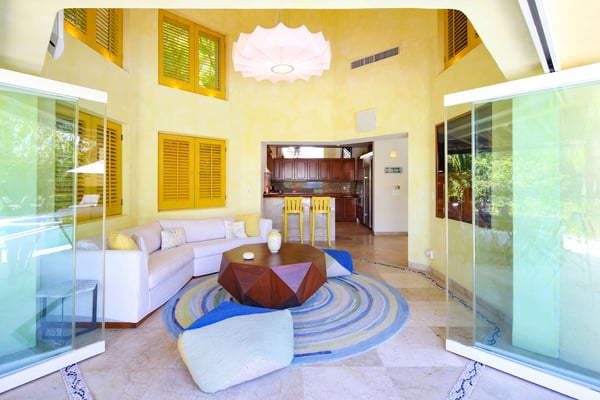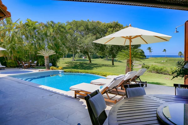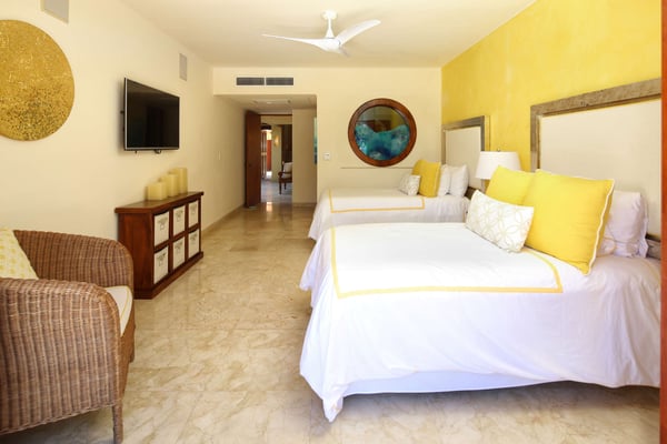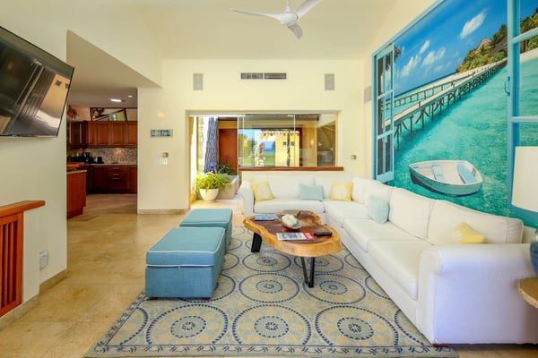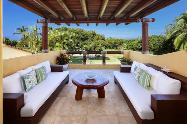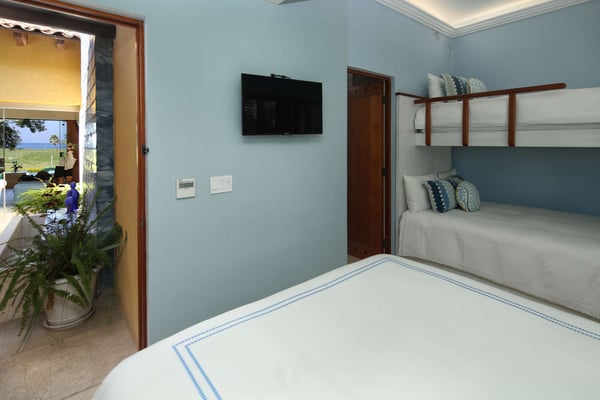Nicknamed "Ipanema," this luxe Punta Mita house rental is located a stone's throw from the fairway of the Pacifico Golf Course, with the Pacific just beyond. The multi-level villa opens into a bright, inviting living room with colorful furnishings, accessorized with shades of blue and yellow and tropical artwork that brings the relaxing beach vibe indoors. The living room extends to an adjacent outdoor lounge area, with comfy couches, lounge chairs and an outdoor grill and dining area that overlook the villa's private swimming pool and Jacuzzi. Inside, the kitchen is outfitted with stainless steel amenities and marble countertops, with an attached octagonal dining room that overlooks the lush outdoor area and golf course and ocean views beyond. Inside, the bedroom suites are graciously appointed with ensuite bathrooms and luxury amenities to ensure you have the most relaxing stay possible. The Primary Suite is located on the upper level, and features a King-size bed, a private patio with ocean views, a sitting area, and indoor-outdoor showers. Downstairs, the second suite has double beds and separate access to the pool patio. The third suite has a King-size bed, pool access and an ensuite bathroom with indoor-outdoor showers. The home's fourth bedroom is ideal for children or teens, with a queen-size bed and two extra-large bunks. All bedrooms are equipped with hotel-quality linens, L'Occitane toiletries and plush bath robes. The villa is equipped with air conditioning and Wifi, along with daily housekeeping, breakfast and snack service, and use of two bicycles and surfboards, along with 24/7 security.