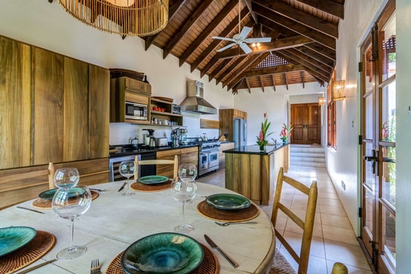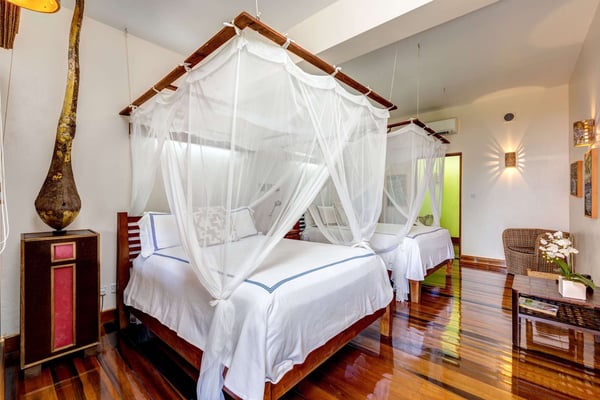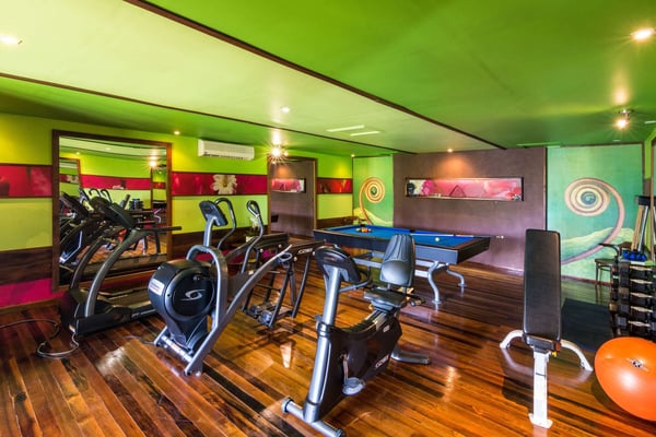 Tree Frog Villa offers a very spacious living environment in an enviable location. The villa has been built to a very high specification. The interiors feature polished hardwood floors and Balinese style cathedral ceilings. Tree Frog has a spacious air-conditioned kitchen featuring top-of-the-line equipment with adjoining breakfast room. Located on the south side of the villa are the dining room, lounge and TV room. To the west side of the property is the south-facing Primary bedroom with luxurious bathroom with whirlpool bath. On the east side of the property are four bedrooms, two on the ground floor and two on the lower floor. French doors from the lounge and dining rooms lead onto the sunny pool deck and the large infinity edge pool featuring natural river stones. Tree Frog also features a gym/games room with a pool table & a table tennis table, a running machine, free weights and a cycling machine. The gym also has cable TV.