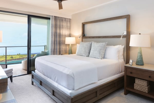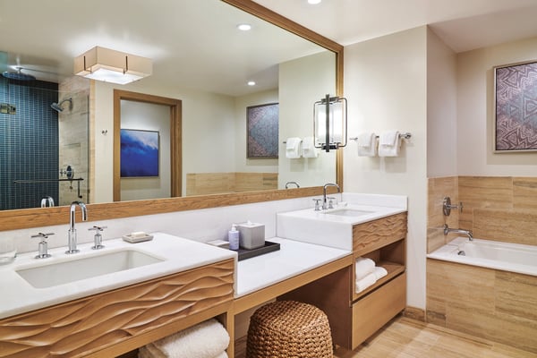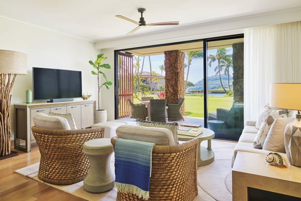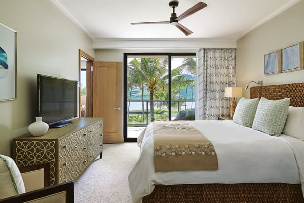 The Hawaiian word "maliula" means enveloping in Aloha. Our Maliula vacation rentals embody a peaceful abode surrounded by nature. The interior is relaxing with greyed woods and textured white oak flooring and millwork with elegant touches of silvered iridescent stone tile and glass, shell-like tile. Each Maliula vacation rental features multiple lanais and peaceful views of the mountains, gardens, Maliula pool, Hokuala Estate, or the Pacific Ocean. The Maliula Residences are located in the heart of the amenities at Timbers Kauai. Timbers Spa, Timbers Fitness Center, Tykes Club, and the popular Maliula pool are all just steps away from your residence. The floor-to-ceiling sliding glass doors blur the line between indoors and out. Inside, you’ll find an exceptional level of finish, with thoughtfully designed custom cabinetry, natural stone vanities, and a beautifully appointed kitchen with Thermador and Bosch appliances.