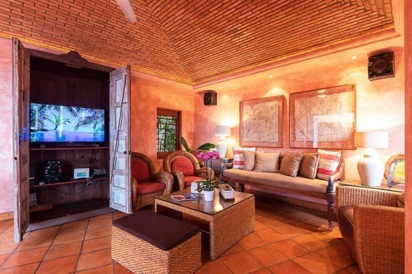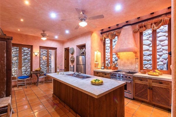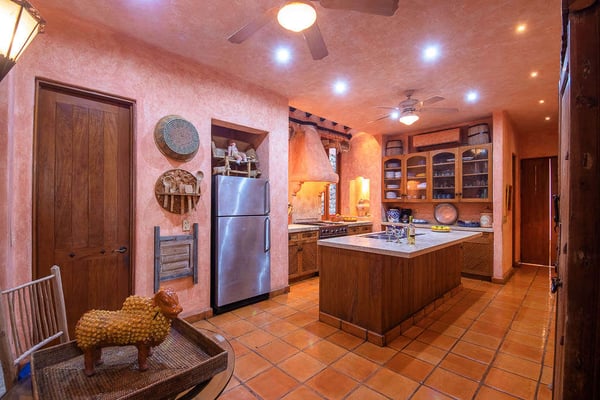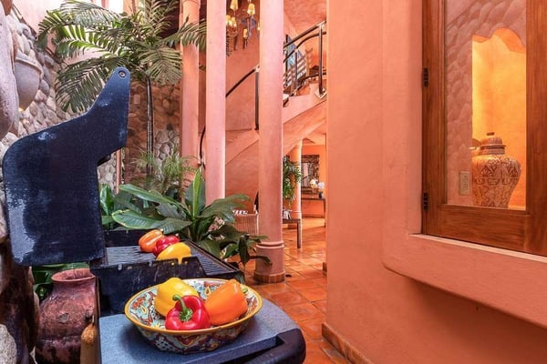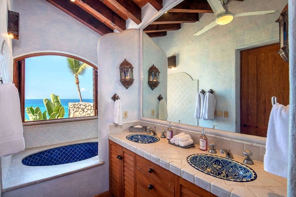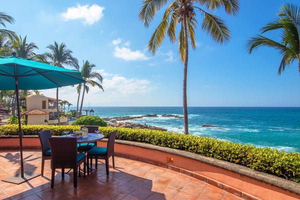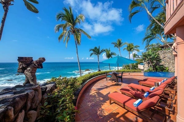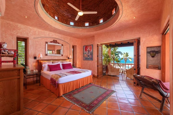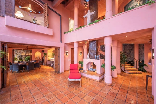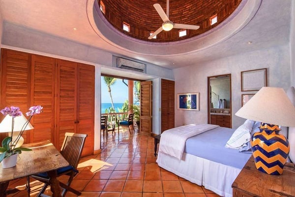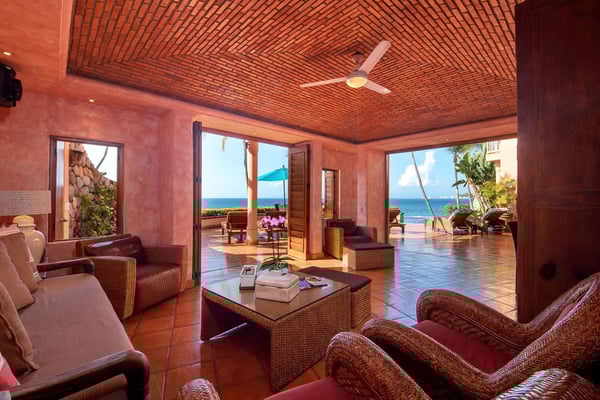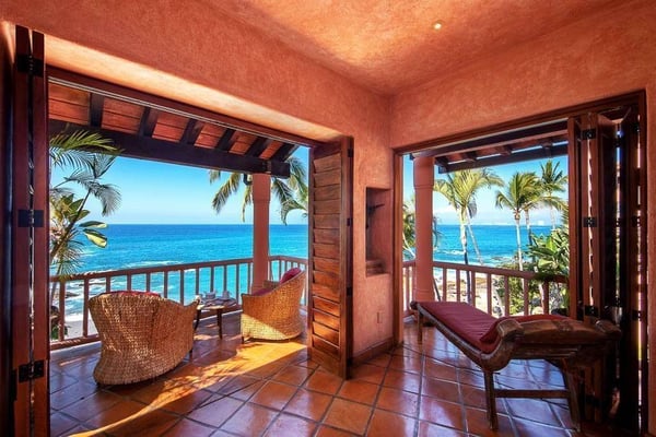 Experience beachfront luxe at Villa Marea Baja, a mix of Antiques, hand-woven textiles, folk art and fun modern touches. The three Bedroom plus fourth flex bedroom Beach house is located approximately 1 ½ miles from the charm and energy of the Romantic Zone and downtown Puerto Vallarta. The design is a focus is the best of indoor/outdoor living, with a heated infinity pool looking out to views of the sparkling Pacific Ocean. This luxury private villa includes all the luxury amenities and comforts plus full staff for an unforgettable vacation getaway Villa Marea Baja is part of a two-villa walled complex, the two villas are designed to be completely private and self-contained, just sharing the common elevator down to the lower level for Beach access for Marea Alta and access to the main entrance of Villa Mara Baja. The names of the villas translate as High Tide (Villa Marea Alta) and Low Tide (Villa Marea Baja). Villa Marea Baja the lower villa is closer to the beach. The beach is swimmable for kids and adults.