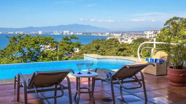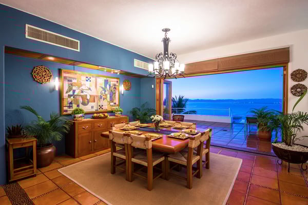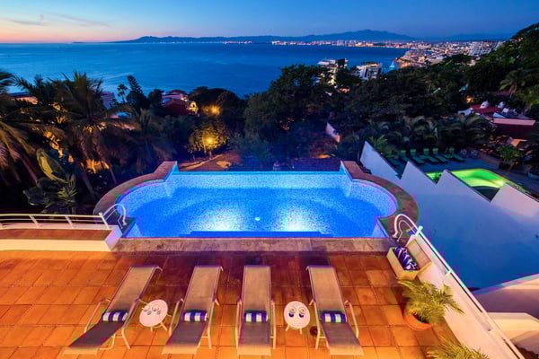 This Luxury Villa vacation rental is called Casa la Palma and features a contemporary style that simply feels like understated elegance. Casa La Palma sets the tone for this Puerto Vallarta Villa rental, with the Sierra Madre Mountains in the background and breathtaking views of Banderas Bay and picturesque Puerto Vallarta. Casa la Palma is located in the exclusive area of Conchas Chinas and just minutes into the Romantic Zone in Downtown Puerto Vallarta. This impressive vacation rental features four-bedroom suites each with private en-suite baths. Off the primary bedrooms, there is a twin bedroom ideal for teens or young children. This bedroom would share the primary bathroom. The main level great room is a common gathering place for guests and is open to the dining room, which leads out onto the luxurious outdoor terrace and heated infinity pool. The state-of-the-art gourmet kitchen features top-of-the-line appliances. Come and relax and enjoy all the amenities and services offered at Casa la Palma and enjoy the Magic of Puerto Vallarta.