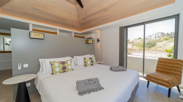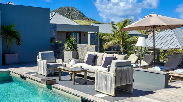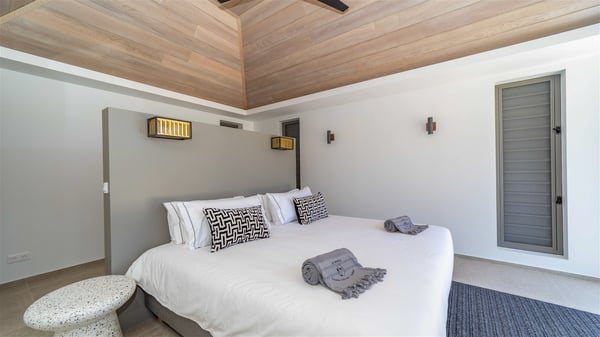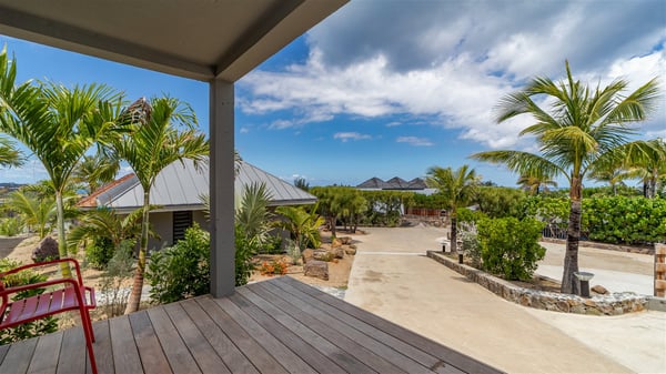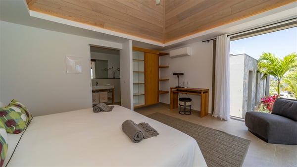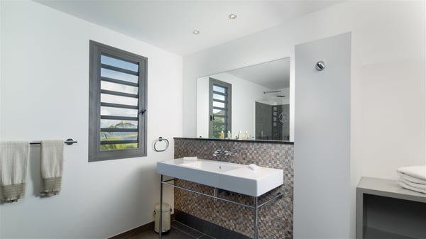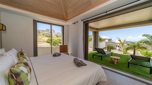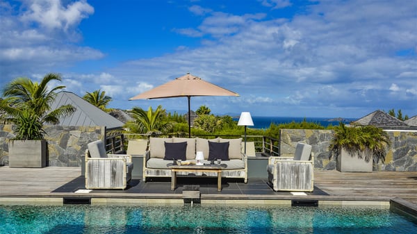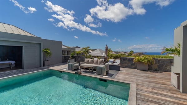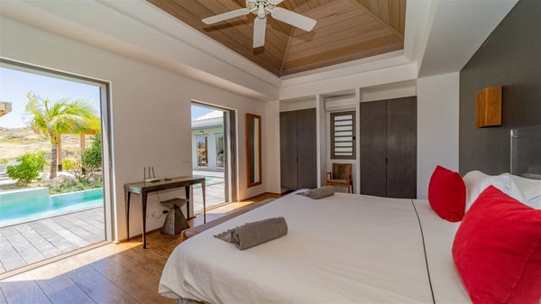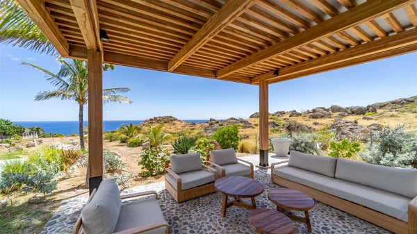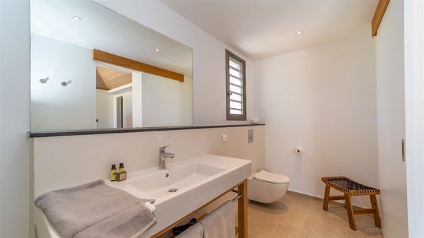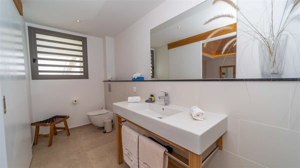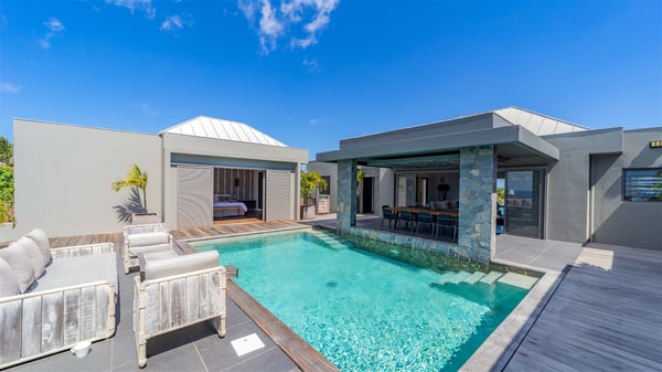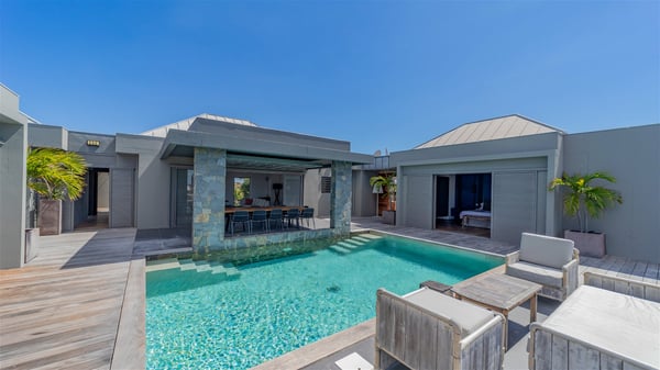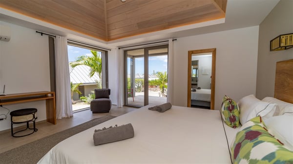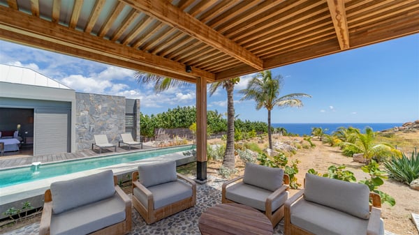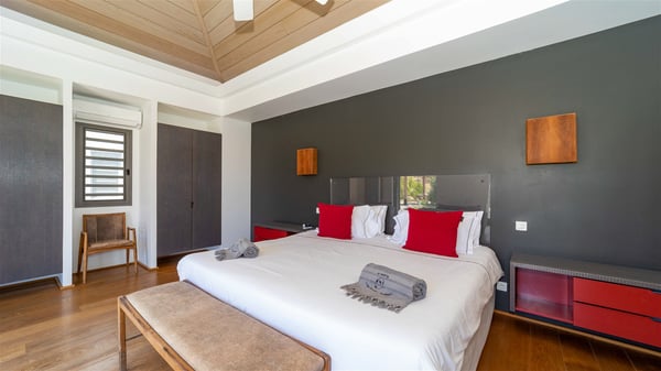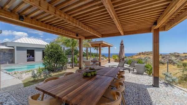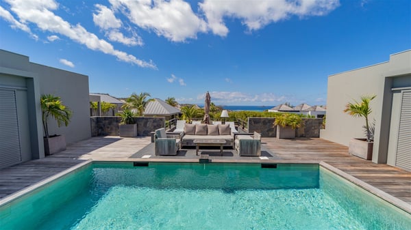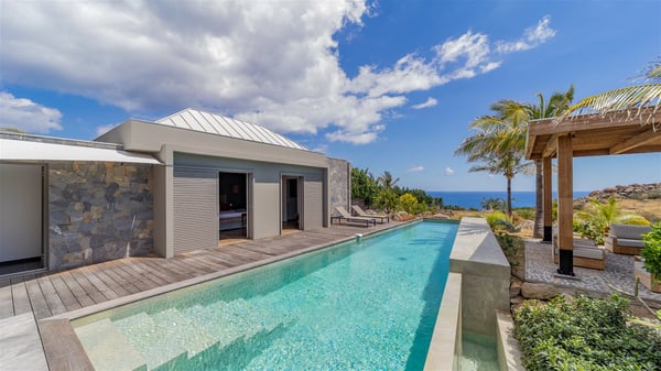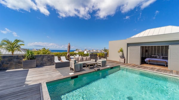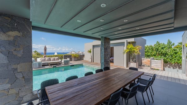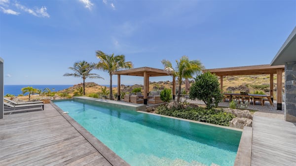Located in the private community of Domaine du Levant in Petit-Cul-de-Sac, the luxurious vacation villa Lagon Vert is a six-bedroom and one-level property, perfect for couples or families vacationing together. It features two swimming pools and a splendid ocean view, as a perfect place for an unforgettable stay in Saint-Barths. Recently built in both modern and Caribbean-spirited style, the rental home Lagon Vert is a charming and comfortable holiday property. Earth-coloured and orange hints create a delightful and soothing atmosphere in the heart of the surrounding natural colours. Very private yet spacious under its high beige vaulted ceiling, the living room is furnished with modern U-shape sofas set up facing the opening onto the terrace. A separate air-conditioned and cozy television room is located next to the living room for quiet movie nights. The well-equipped kitchen opens onto two sides, gently swept by the trade winds. Under the covered part of the terrace, the dining area is furnished with a beautiful design table for eight, where you will enjoy delicious meals facing the ocean view. The rental villa Lagon Vert in St-Barths has two swimming pools, one on the front terrace enjoying the ocean view and the second at the back of the house, and sheltered by the garden. There are several comfy lounge chairs and sofas with cushions around the pools on both terraces, for exquisite moments of relaxing, reading and talking under parasols, while the trade winds gently blow through the palm trees. The vacation home Lagon Vert has six beautiful air-conditioned rooms with a stunning view over the ocean or the pool. All are spacious and have king-size beds and en-suite bathrooms in a contemporary and cozy decor. The three suites are tastefully decorated and comfortable, each in a different palette of colours. High vaulted ceilings bring a pleasant feeling of volume in the bedrooms, elegantly dressed with warm fabrics, creating a soothing atmosphere. The villa Lagon Vert is definitely the ideal place for an exclusive vacation with friends in Saint-Barths.