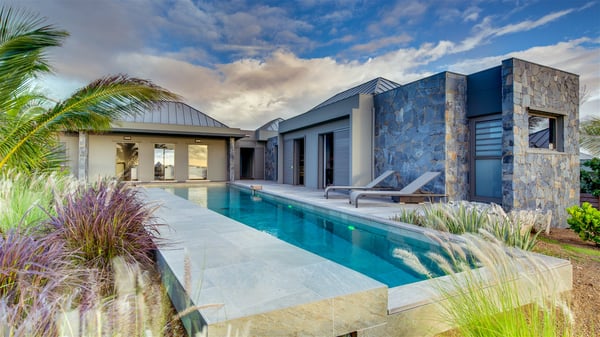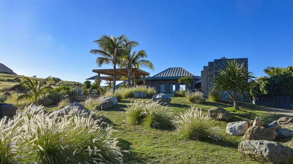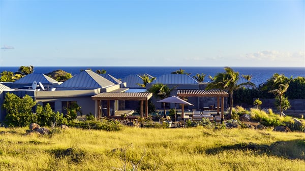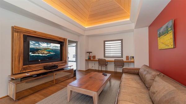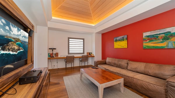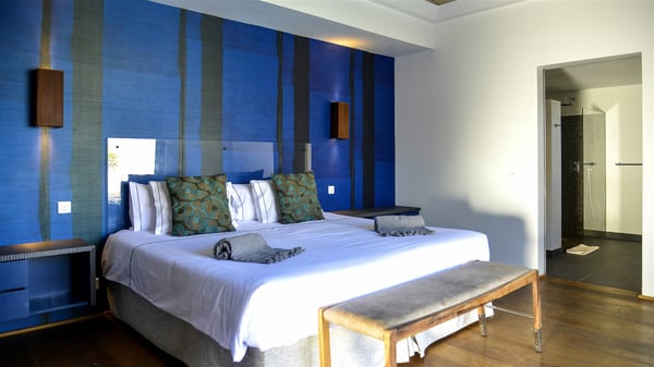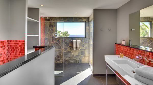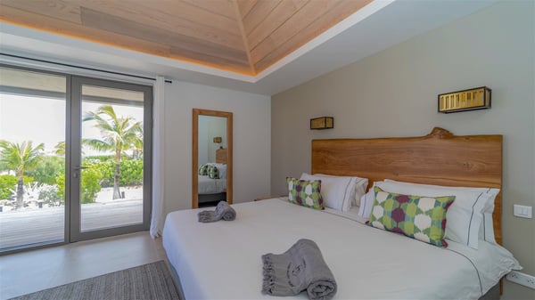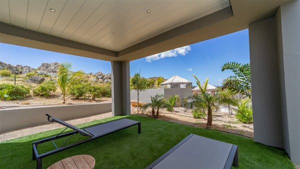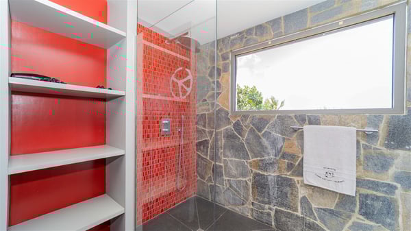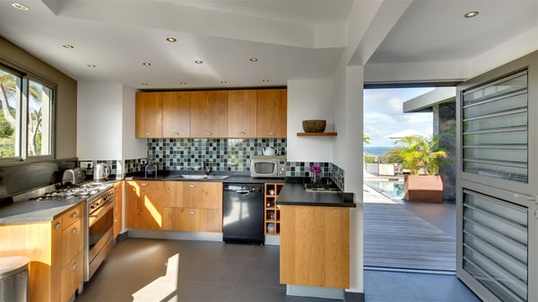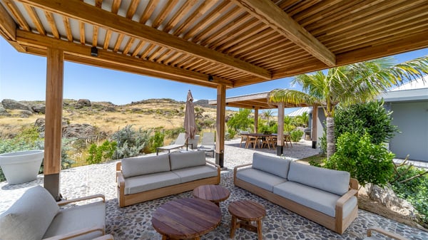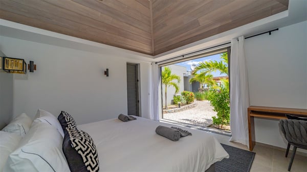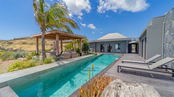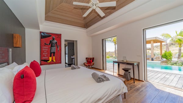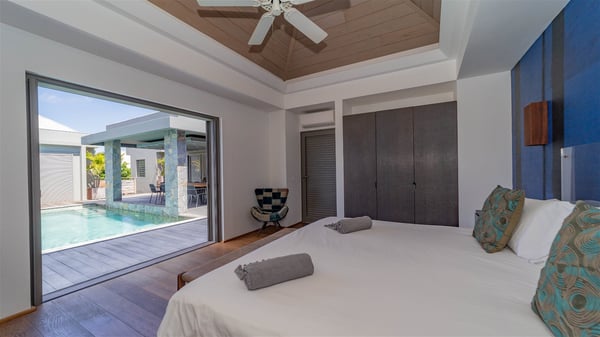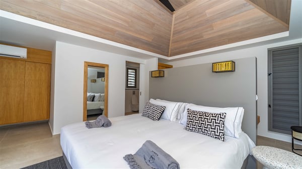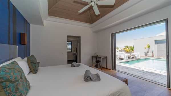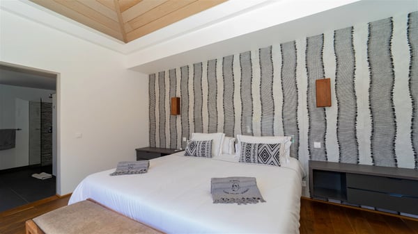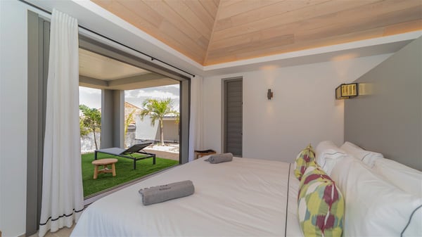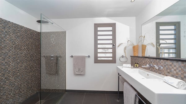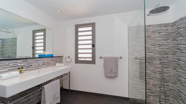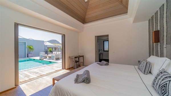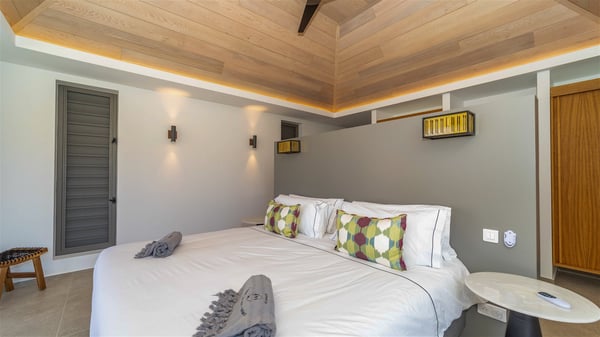 Located in the private community of Domaine du Levant in Petit-Cul-de-Sac, the luxurious vacation villa Lagon Vert is a six-bedroom and one-level property, perfect for couples or families vacationing together. It features two swimming pools and a splendid ocean view, as a perfect place for an unforgettable stay in Saint-Barths. Recently built in both modern and Caribbean-spirited style, the rental home Lagon Vert is a charming and comfortable holiday property. Earth-coloured and orange hints create a delightful and soothing atmosphere in the heart of the surrounding natural colours. Very private yet spacious under its high beige vaulted ceiling, the living room is furnished with modern U-shape sofas set up facing the opening onto the terrace. A separate air-conditioned and cozy television room is located next to the living room for quiet movie nights. The well-equipped kitchen opens onto two sides, gently swept by the trade winds. Under the covered part of the terrace, the dining area is furnished with a beautiful design table for eight, where you will enjoy delicious meals facing the ocean view. The rental villa Lagon Vert in St-Barths has two swimming pools, one on the front terrace enjoying the ocean view and the second at the back of the house, and sheltered by the garden. There are several comfy lounge chairs and sofas with cushions around the pools on both terraces, for exquisite moments of relaxing, reading and talking under parasols, while the trade winds gently blow through the palm trees. The vacation home Lagon Vert has six beautiful air-conditioned rooms with a stunning view over the ocean or the pool. All are spacious and have king-size beds and en-suite bathrooms in a contemporary and cozy decor. The three suites are tastefully decorated and comfortable, each in a different palette of colours. High vaulted ceilings bring a pleasant feeling of volume in the bedrooms, elegantly dressed with warm fabrics, creating a soothing atmosphere. The villa Lagon Vert is definitely the ideal place for an exclusive vacation with friends in Saint-Barths.