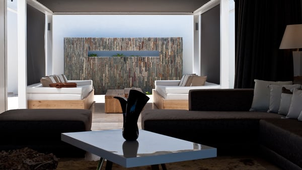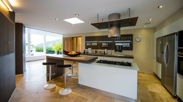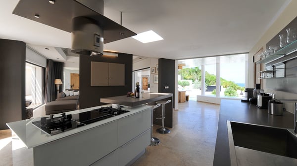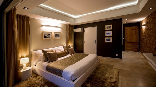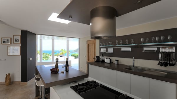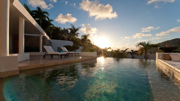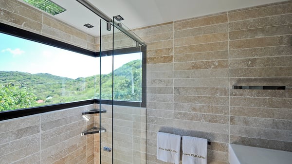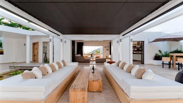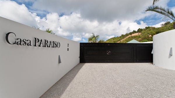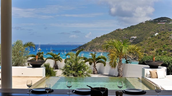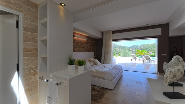 Located in Public, the luxury villa rental in Saint-Barths Villa Casa Paraiso is a haven of beauty, only a few minutes from Gustavia and the main activities. It is a beautiful view, combined with luxurious architecture, that makes it the ideal holiday spot for a family or a group of friends of up to eight people in the Caribbean. Enter the villa and let yourself be captivated by the exquisite refinement of its design. The villa is contemporary with Italian furniture by the Dall'Agnese brand. The living room is designed with sleek and elegant lines with leather sofas and benches, under a high vaulted ceiling, which provides a delightful feeling of volume and space. Dark wood, taupe colours and honey-coloured tiles bring a soft and cool feeling of serenity and privacy. The well-equipped kitchen with a breakfast bar is the ideal place to prepare delicious gourmet meals around the dining room under the covered terrace, which can accommodate up to twelve guests. On the terrace, there is a sumptuous infinity swimming pool on the deck from where you can watch the planes starting their landings on Saint-Jean Airport. Views over the bays of Public and Gustavia are very pleasant throughout the day, while you are comfortably installed on the deckchairs under the rays of the island’s sun. Benches and cushions bring a pleasant feeling of well-being in this outdoor and relaxing space. Tropical vegetation is everywhere: banana trees, mango trees and olive trees enhance the serene and exotic atmosphere. The luxurious villa Casa Paraiso is composed of four air-conditioned luxurious suites in the same Italian and refined style as in the living room. Bedrooms are very spacious and come with king-size beds and private bathrooms. A fitness room with a jacuzzi is also at your disposal in the house. Please note that since Casa Paraiso overlooks Gustavia's industrial area, some noise may be heard from time to time.