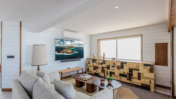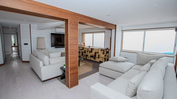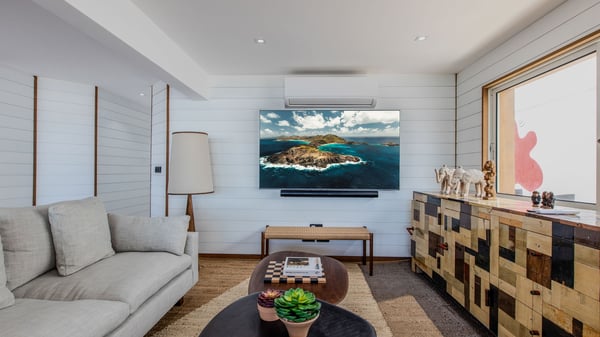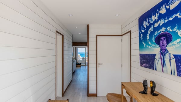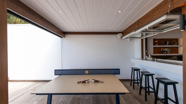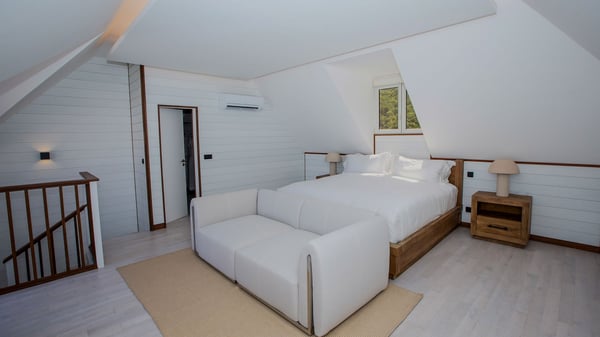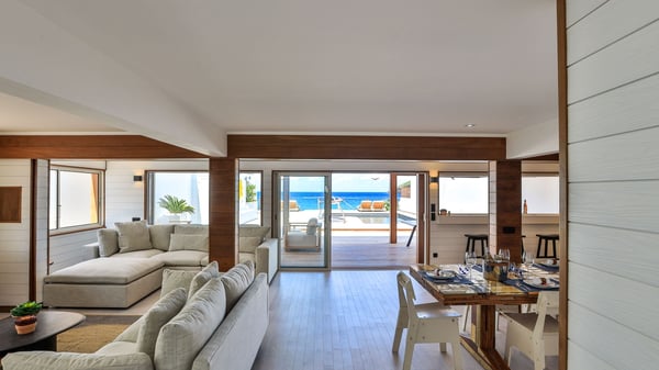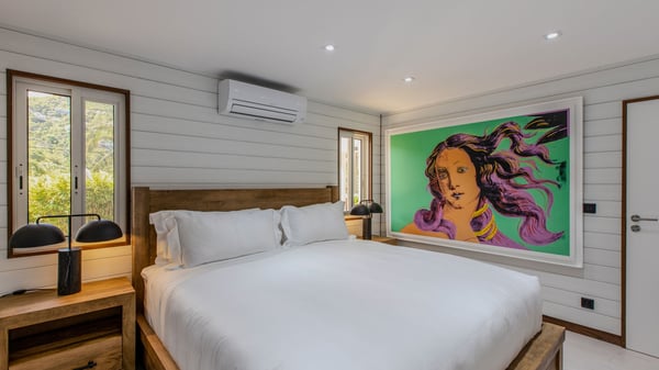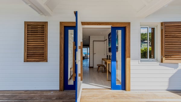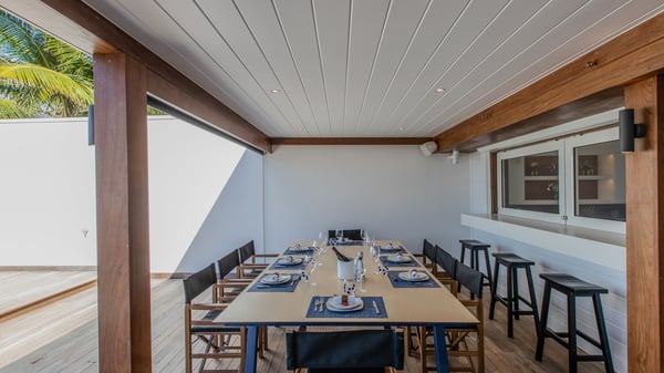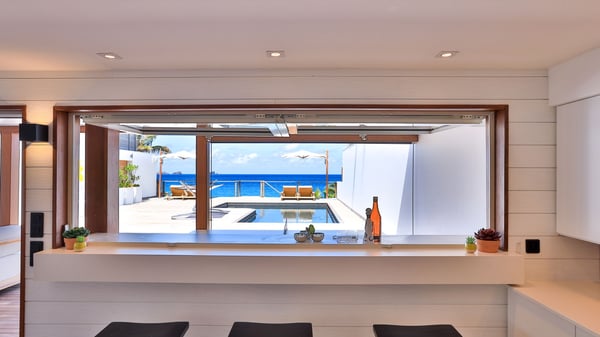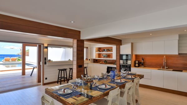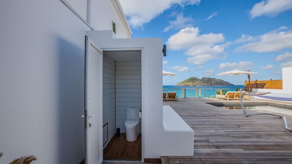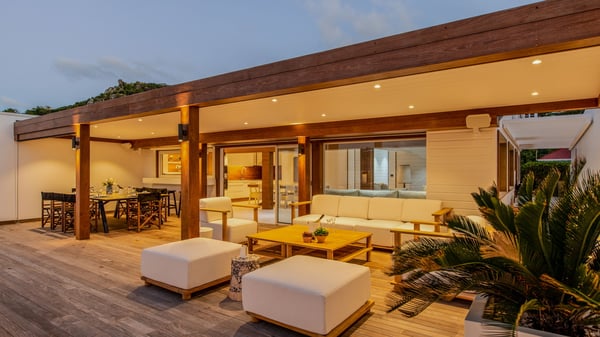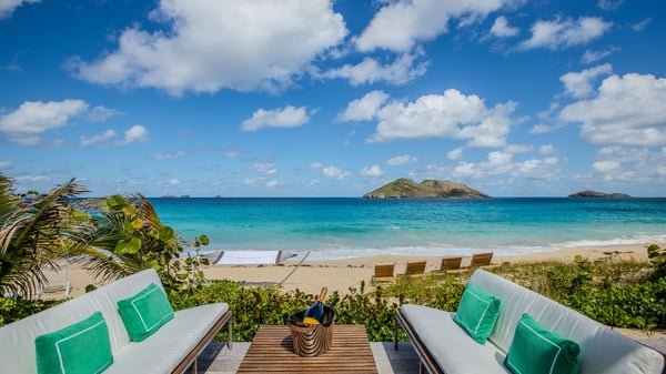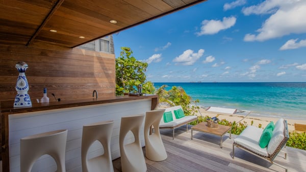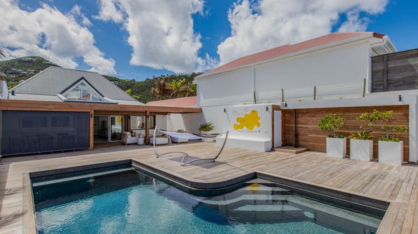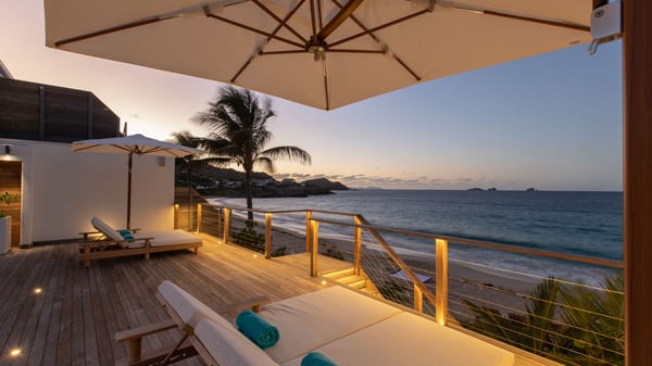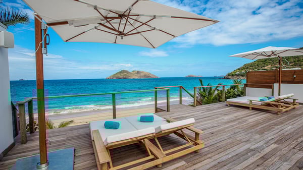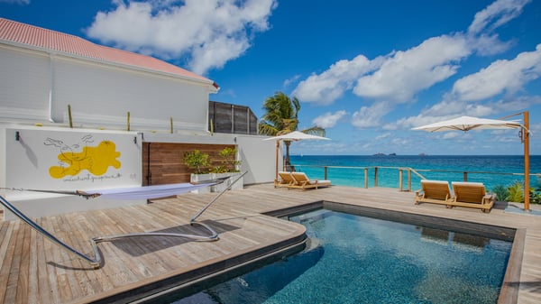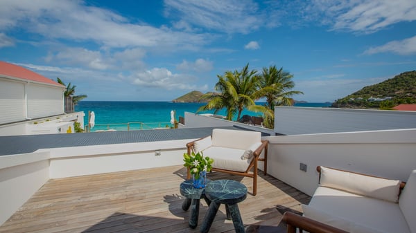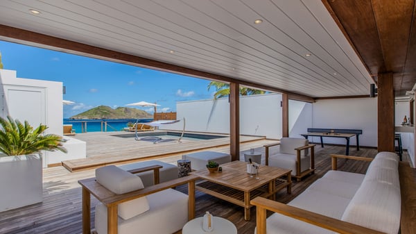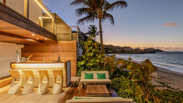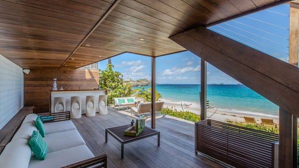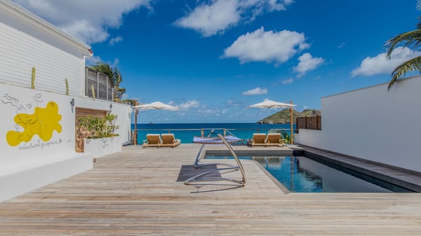 The rental villa in St-Barths Ganesha is a superb beachfront property located on Flamands Beach. This vacation beach house is an idyllic Caribbean getaway for refined travellers looking to take in the natural beauty of St-Barths. Completely renovated in a contemporary and welcoming style, the villa Ganesha is built on two comfortable levels in typical island architecture. The spacious open-plan living area creates a bright and soothing atmosphere, gently furnished by woven fibre sofas and soft cushions and a large flat-screen TV for pleasant movie nights. Warm fabrics blended with a sleek but Caribbean-style decoration make this vast living room a very nice space. The large windows and floor-to-ceiling doors allow the warm sunlight to stream in naturally while opening to the beguiling terrace. There is an elegant, well-equipped kitchen for delicious meal preparation that can be enjoyed around the dining areas for eight guests, either inside the air-conditioned great room or outside under the pergola. On the terrace, an idyllic scenery is set up for a heavenly vacation in St-Barths. The deck is very spacious, lulled by the sound of the waves, as it faces the sea view and the Chevreau Island. A glittering private swimming pool separates the house from the beach, fringed with loungers and sofas sheltered by umbrellas - just perfect for sunbathing sessions and watching the magnificent turquoise ocean views. Equipped with two kayaks, two paddle boards and an assortment of life jackets, the beachfront villa GANESHA in St-Barths also offers plenty of activities to keep action-seekers entertained. Under the pergola, a ping pong table is also available for great games in the gentle breeze. And whenever you wish to taste the ocean water nearby, a staircase leads you directly to the Flamands beach. This luxurious vacation home has three air-conditioned bedrooms with private bathrooms and optimal comfort. The master suite is located on the first floor, with a king-size bed and a TV set. This luxurious suite also features a terrace with ocean and beach views. A second bedroom with a queen-sized bed opens onto the living room. The third bedroom is suitable for children, with a queen bed and two perfect bunk beds. Comfortable and modern, this luxury beachfront villa Ganesha on the Flamands beach is the perfect place for your next family vacation in St-Barths.