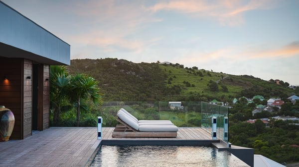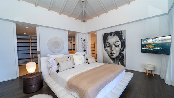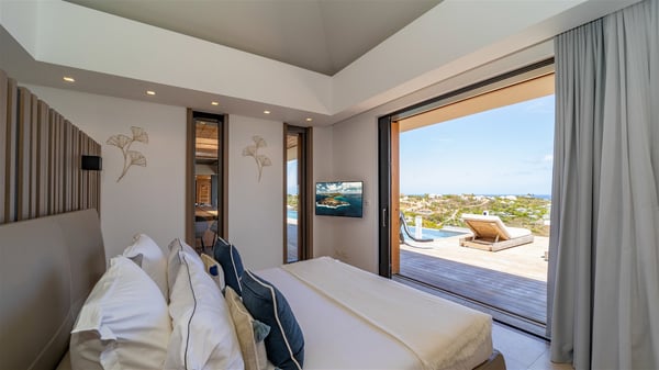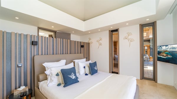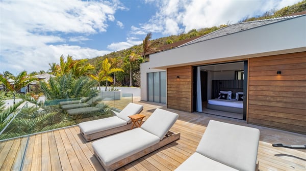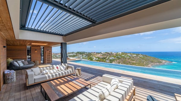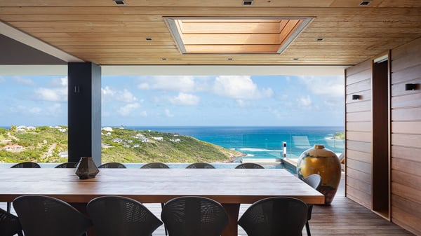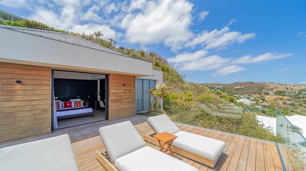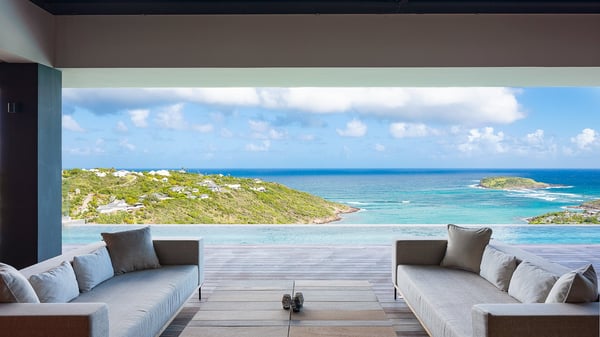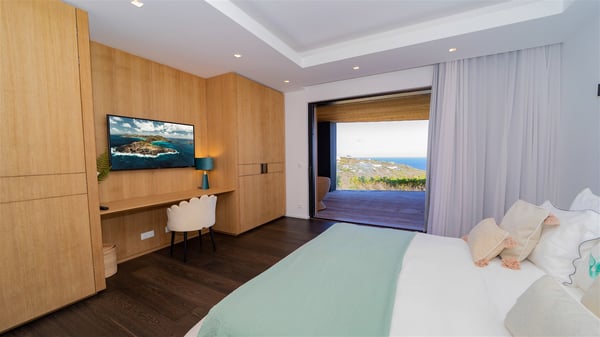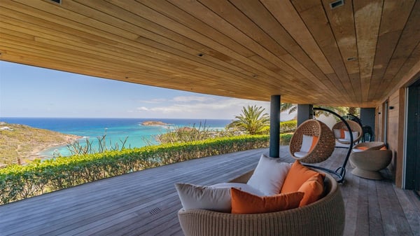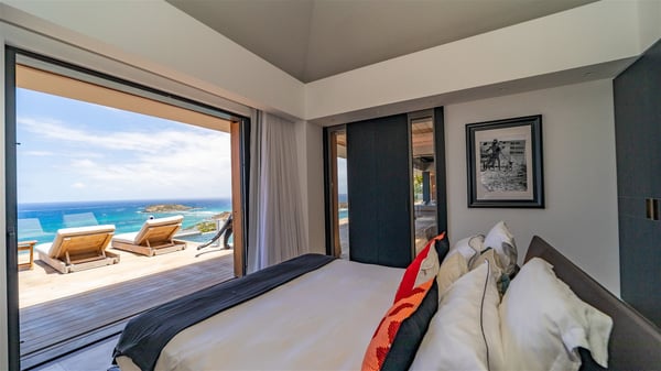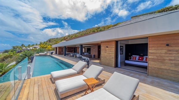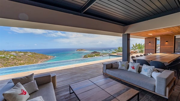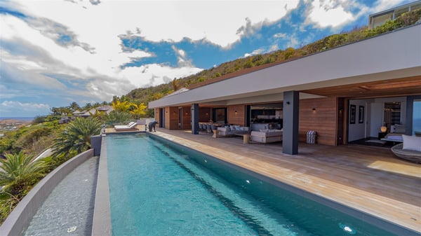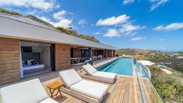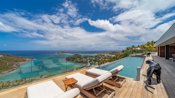 Villa Epicure in St-Barths is a sumptuous property located in Marigot with a splendid view over Grand-Cul-de-Sac and Turtle Island in the distance. In a setting of luxury and beauty, this very spacious and prestigious seven-bedroom vacation villa is a very private place for an extraordinary stay in the Caribbean. Villa Epicure offers the best of St-Barths with top-of-the-line amenities, large and wide spaces, as well as bay windows that play with transparency, all in contemporary and inspired architecture. The living room of the vacation rental villa Epicure is designed with great spaces coming with high-quality furnishing. It is composed of two oversized sofas around a large square coffee table. The indoor dining room is located in the same open space in front of the stunning ocean view, close to the well-equipped kitchen with a long breakfast bar perfect for talking over coffee. The beauty of the Caribbean can be found in this amazing property, with extraordinary views over the turquoise waters and the fantastic villa’s upscale services. At the front of this outstanding villa, the terrace is designed around a beautiful, long infinity swimming pool that seems to merge with the deep blue ocean. Sun loungers are at your disposal on the large deck for pleasant sunbathing and relaxing sessions. An outdoor dining room is set up under the covered area for delicious al fresco dining, next to the comfortable garden lounge where you’ll enjoy sipping a cocktail in the evening. In the gentle breeze of the trade winds, time seems suspended, allowing guests to fully enjoy the beauty of the idyllic scenery. The vacation rental villa Epicure welcomes groups or families in seven air-conditioned bedrooms, perfectly furnished with king-size beds and en-suite bathrooms. Three of them are on the main level, while the other four are located on the lower level. Each bedroom offers privacy and great comfort, bright decor and amazing views over the ocean and the tropical palm trees. Luxurious and beautiful, villa Epicure is a truly unique place to enjoy unforgettable moments in the mildness of the Caribbean.
