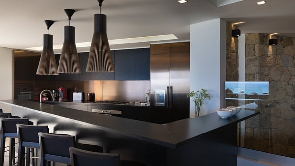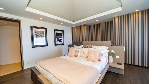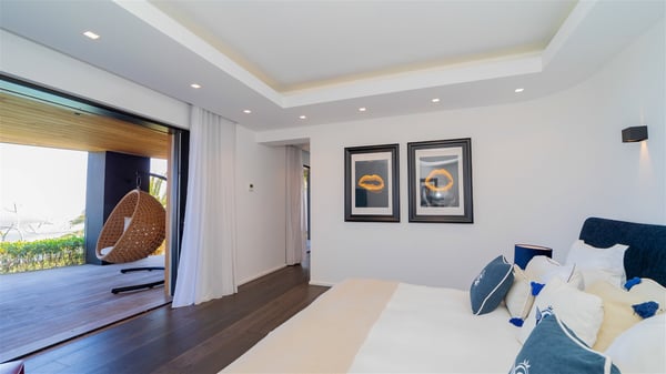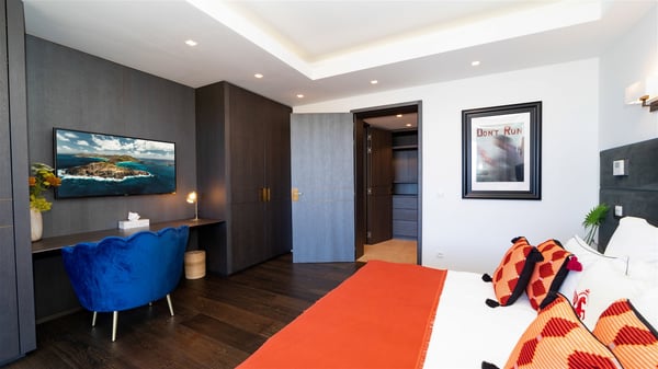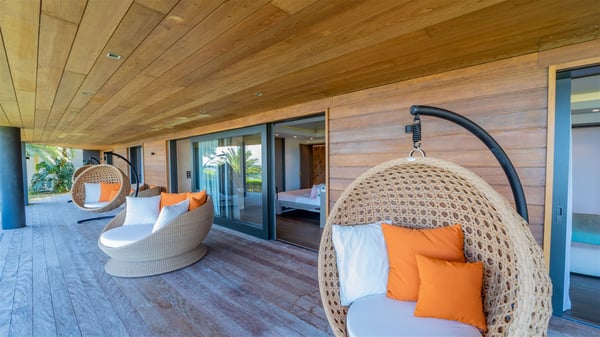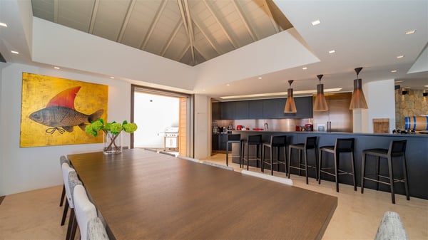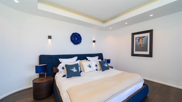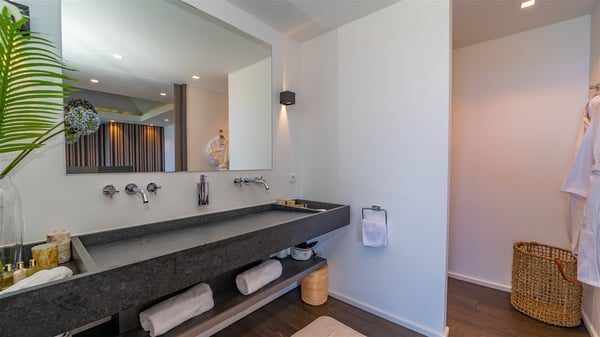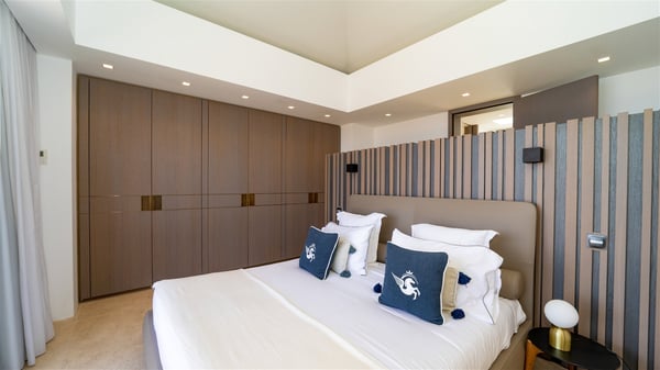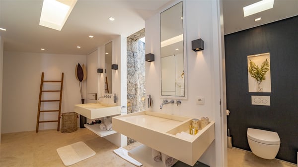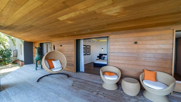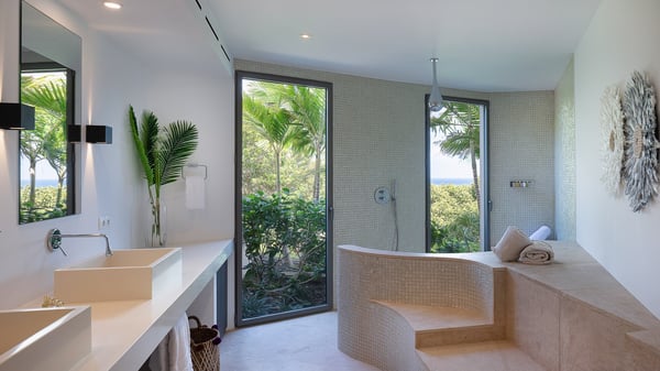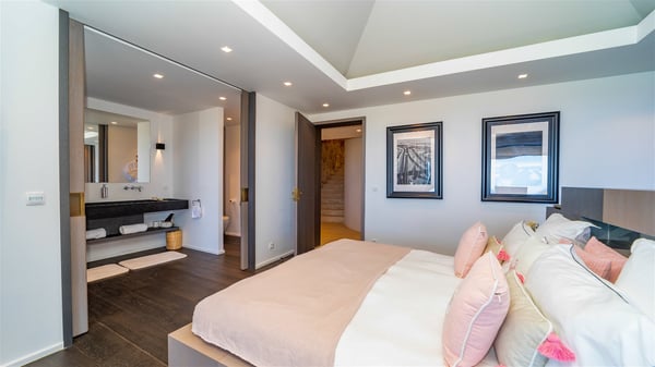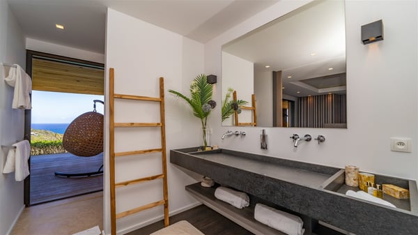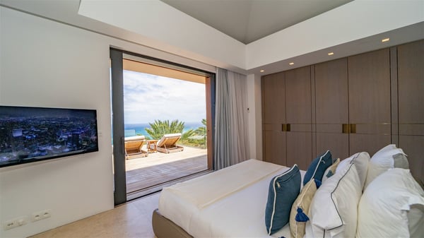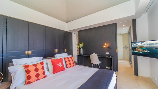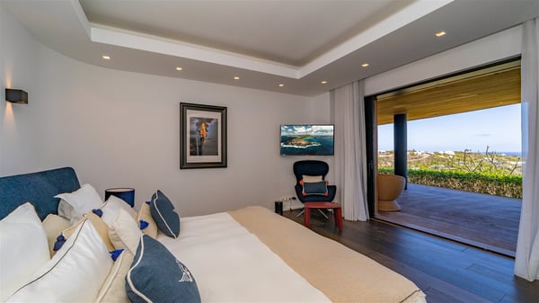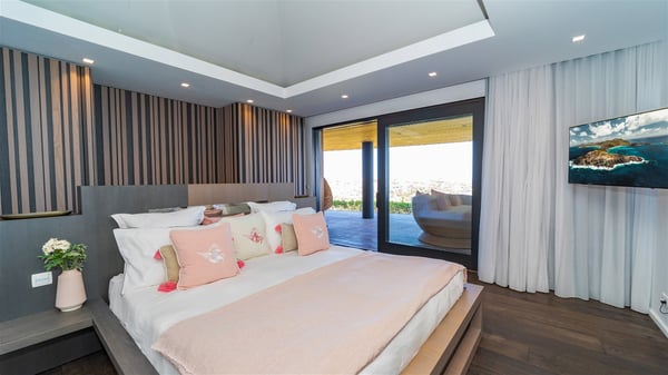 Villa Epicure in St-Barths is a sumptuous property located in Marigot with a splendid view over Grand-Cul-de-Sac and Turtle Island in the distance. In a setting of luxury and beauty, this very spacious and prestigious seven-bedroom vacation villa is a very private place for an extraordinary stay in the Caribbean. Villa Epicure offers the best of St-Barths with top-of-the-line amenities, large and wide spaces, as well as bay windows that play with transparency, all in contemporary and inspired architecture. The living room of the vacation rental villa Epicure is designed with great spaces coming with high-quality furnishing. It is composed of two oversized sofas around a large square coffee table. The indoor dining room is located in the same open space in front of the stunning ocean view, close to the well-equipped kitchen with a long breakfast bar perfect for talking over coffee. The beauty of the Caribbean can be found in this amazing property, with extraordinary views over the turquoise waters and the fantastic villa’s upscale services. At the front of this outstanding villa, the terrace is designed around a beautiful, long infinity swimming pool that seems to merge with the deep blue ocean. Sun loungers are at your disposal on the large deck for pleasant sunbathing and relaxing sessions. An outdoor dining room is set up under the covered area for delicious al fresco dining, next to the comfortable garden lounge where you’ll enjoy sipping a cocktail in the evening. In the gentle breeze of the trade winds, time seems suspended, allowing guests to fully enjoy the beauty of the idyllic scenery. The vacation rental villa Epicure welcomes groups or families in seven air-conditioned bedrooms, perfectly furnished with king-size beds and en-suite bathrooms. Three of them are on the main level, while the other four are located on the lower level. Each bedroom offers privacy and great comfort, bright decor and amazing views over the ocean and the tropical palm trees. Luxurious and beautiful, villa Epicure is a truly unique place to enjoy unforgettable moments in the mildness of the Caribbean.
