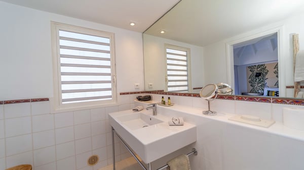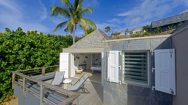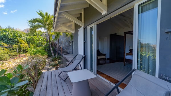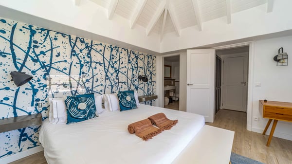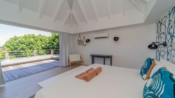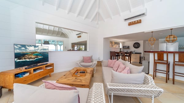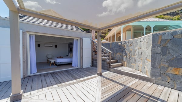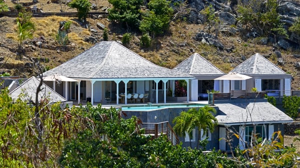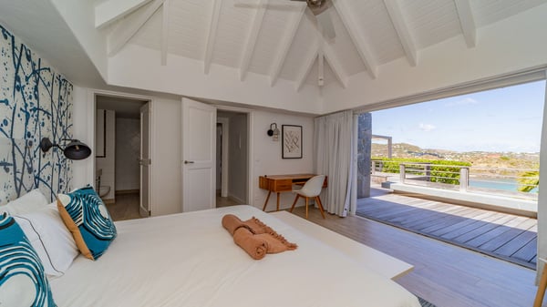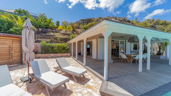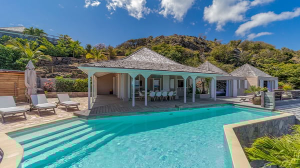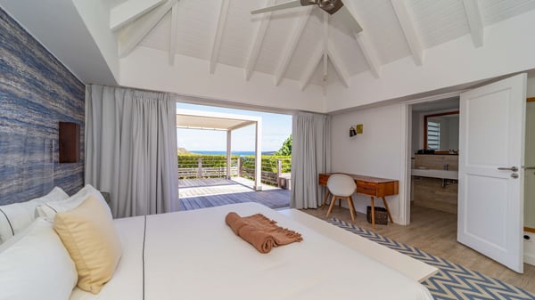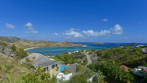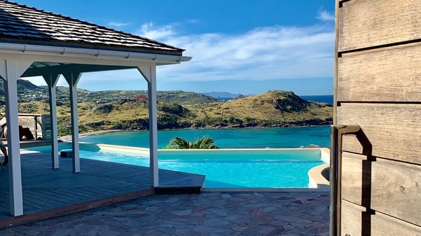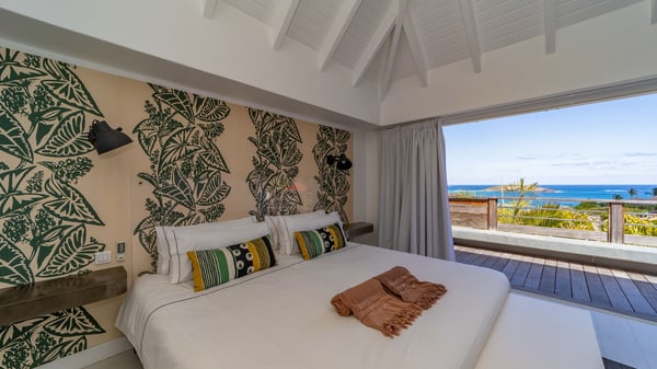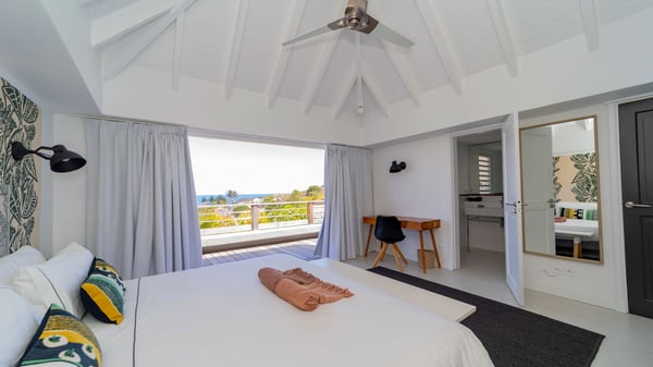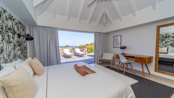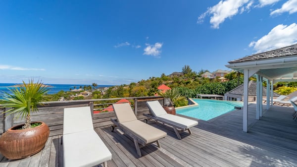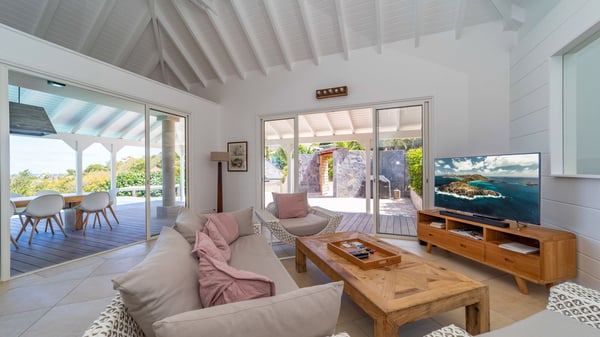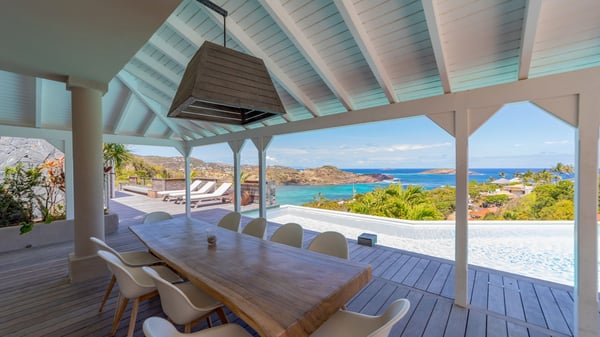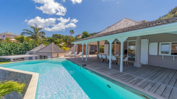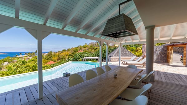 The luxurious villa Lagon Rose in St-Barths is a five-bedroom property located in Petit-Cul-de-Sac in the exclusive Domaine du Levant gated community. Only a few minutes from the beach, this hillside property offers a breathtaking view over Tortue and Saint-Martin islands, and the ocean. This very private vacation home is the perfect choice for groups or for family stays in the Caribbean. Spread out over multiple levels in a typical colonial design, the vacation villa Lagon Rose has been recently renovated with charming contemporary decoration, a perfect setup for daydreaming. The large air-conditioned living room is warm and comfy and enjoys a beautiful view over the pool and the outdoor scenery. This open-plan and airy great room is tastefully furnished with rattan sofas and armchairs, soft cushions, a flat-screen TV, under a high bleached vaulted ceiling. A lovely square dark wood table is next to the well-equipped kitchen which has a breakfast bar. The dining room is at the front of the house under the covered terrace. A beautiful, rectangular and massive wooden table overlooks the bay for delicious alfresco dining in the gentle breeze of the trade winds. On the large terrace, a beautiful swimming pool faces the splendid panorama, surrounded by sunbeds and parasols for delicious moments of quiet or reading in a peaceful atmosphere. The villa's tropical garden brings a vegetal touch to the stunning ocean and island views, as true idyllic scenery. Ideal for a group of friends or for a large family with young children, the rental villa Lagon Rose in St-Barths has five beautiful air-conditioned bedrooms with terraces and ocean or garden views. All of them feature king-size beds and en-suite bathrooms, and office areas and are tastefully decorated with creamy-tone colours and warm fabrics. Two suites are located on the main level and open onto the terrace, while two others are on a lower level, close to the pool. The fifth very spacious bedroom is in a separate bungalow in a decor of dark wood and parquet floor which brings a unique charm. The holiday rental villa Lagon Rose is the very right place to make your stay in Saint-Barths the most wonderful vacation.