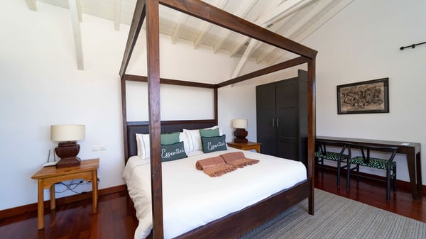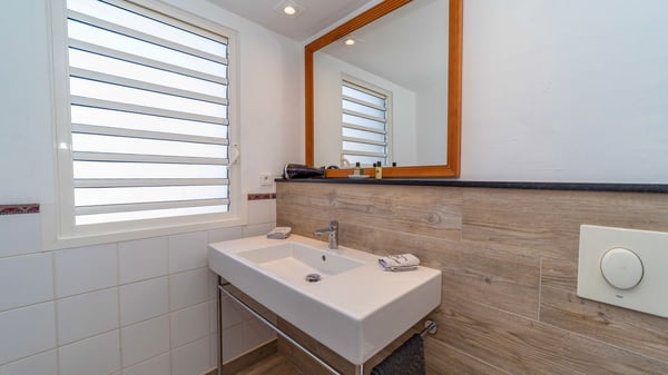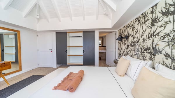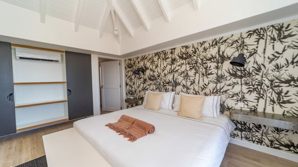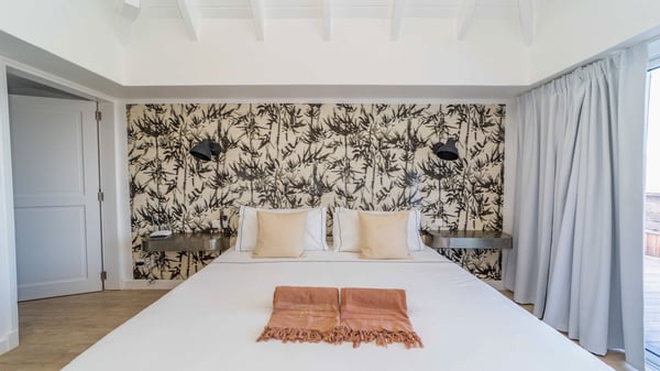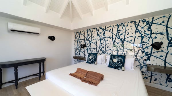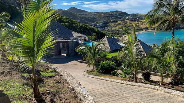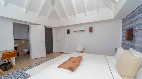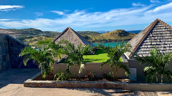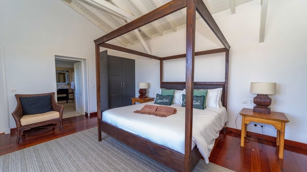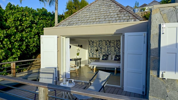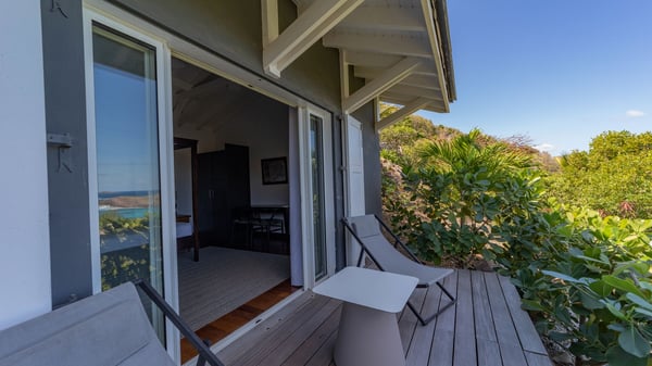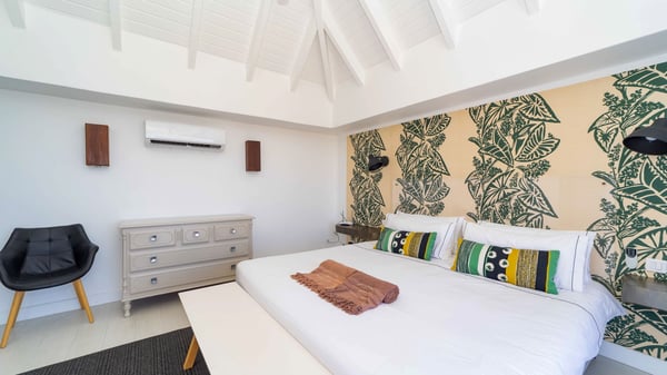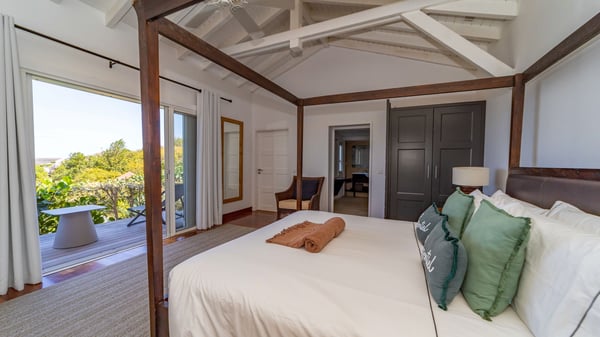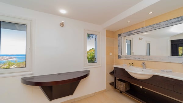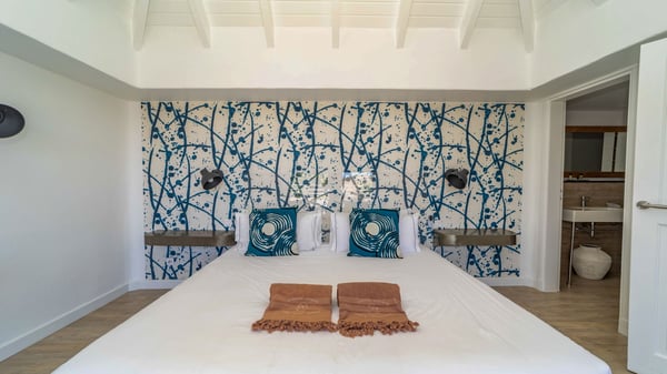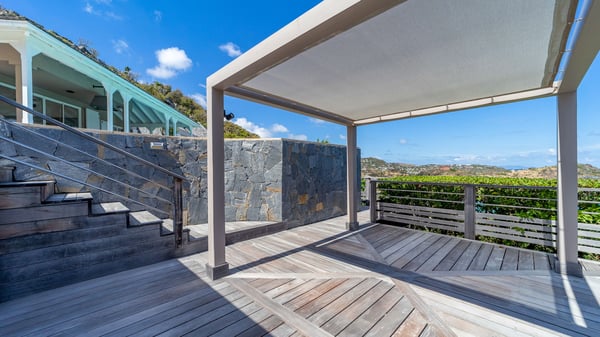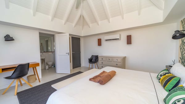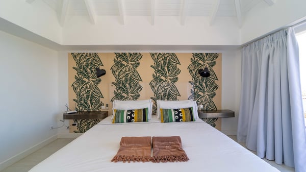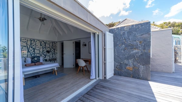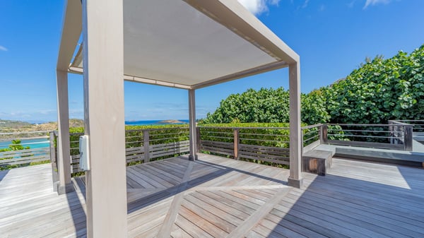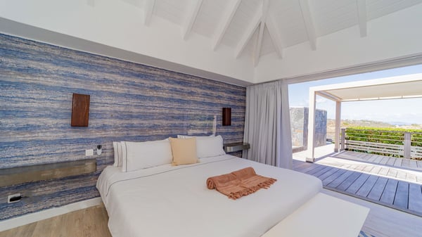The luxurious villa Lagon Rose in St-Barths is a five-bedroom property located in Petit-Cul-de-Sac in the exclusive Domaine du Levant gated community. Only a few minutes from the beach, this hillside property offers a breathtaking view over Tortue and Saint-Martin islands, and the ocean. This very private vacation home is the perfect choice for groups or for family stays in the Caribbean. Spread out over multiple levels in a typical colonial design, the vacation villa Lagon Rose has been recently renovated with charming contemporary decoration, a perfect setup for daydreaming. The large air-conditioned living room is warm and comfy and enjoys a beautiful view over the pool and the outdoor scenery. This open-plan and airy great room is tastefully furnished with rattan sofas and armchairs, soft cushions, a flat-screen TV, under a high bleached vaulted ceiling. A lovely square dark wood table is next to the well-equipped kitchen which has a breakfast bar. The dining room is at the front of the house under the covered terrace. A beautiful, rectangular and massive wooden table overlooks the bay for delicious alfresco dining in the gentle breeze of the trade winds. On the large terrace, a beautiful swimming pool faces the splendid panorama, surrounded by sunbeds and parasols for delicious moments of quiet or reading in a peaceful atmosphere. The villa's tropical garden brings a vegetal touch to the stunning ocean and island views, as true idyllic scenery. Ideal for a group of friends or for a large family with young children, the rental villa Lagon Rose in St-Barths has five beautiful air-conditioned bedrooms with terraces and ocean or garden views. All of them feature king-size beds and en-suite bathrooms, and office areas and are tastefully decorated with creamy-tone colours and warm fabrics. Two suites are located on the main level and open onto the terrace, while two others are on a lower level, close to the pool. The fifth very spacious bedroom is in a separate bungalow in a decor of dark wood and parquet floor which brings a unique charm. The holiday rental villa Lagon Rose is the very right place to make your stay in Saint-Barths the most wonderful vacation.