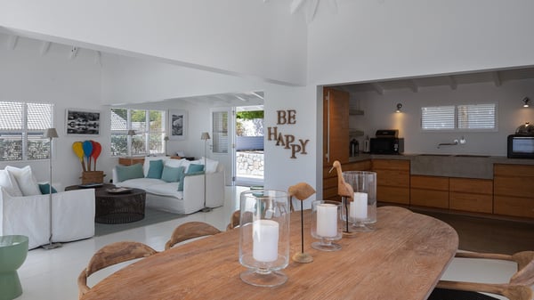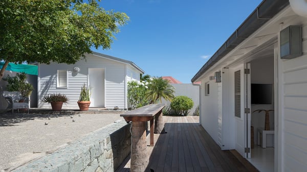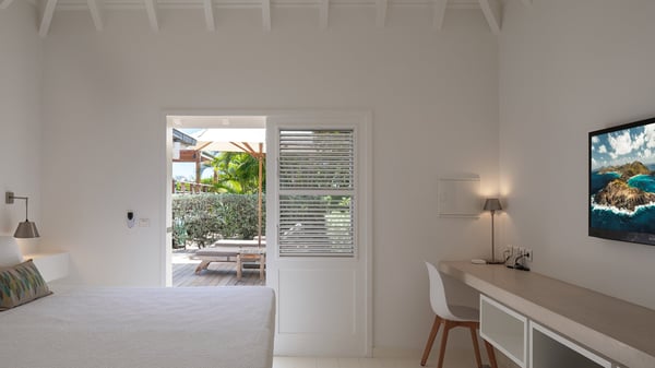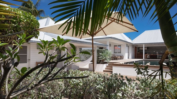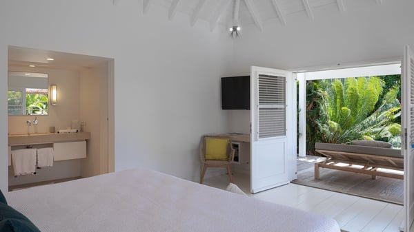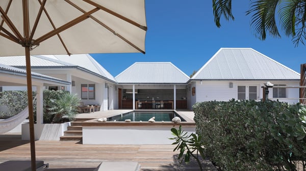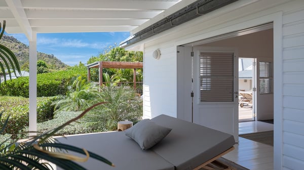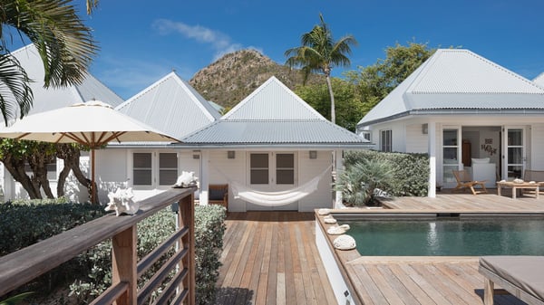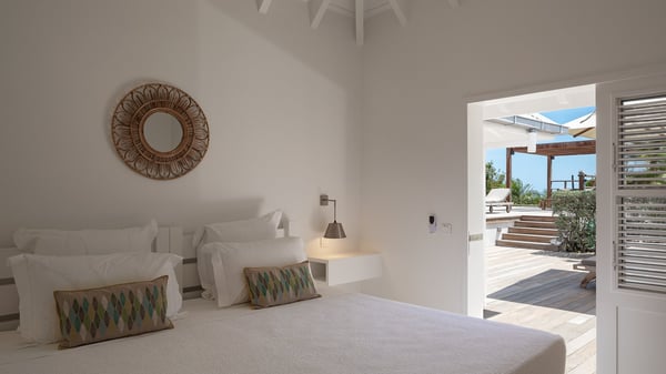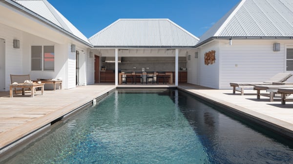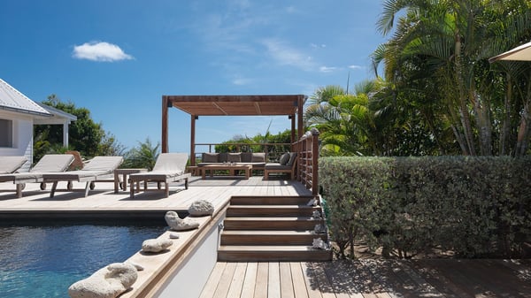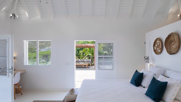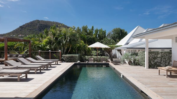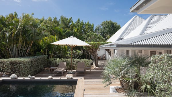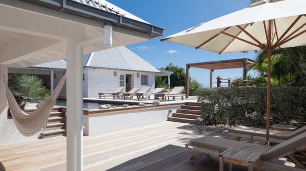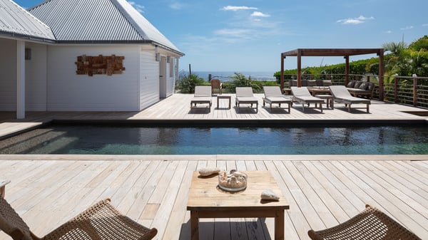 The vacation rental villa Pastels is a beautiful property located in Vitet in the heart of a peaceful and green environment, in front of the sparkling ocean. Spacious and bright, this four-bedroom house with a swimming pool welcomes guests in a very private atmosphere with a wide range of upscale services, in the heart of the Caribbean's lush vegetation. Built around a lovely swimming pool in the heights of Vitet, the luxury villa Pastels in St-Barth is a single-story house in front of the ocean. All rooms are spacious, with wide openings that let in the natural light and the gentle trade winds, which create a most soothing atmosphere. The living room is comfortably furnished with a sofa and soft armchairs, close to the well-equipped kitchen with a dining area that can accommodate up to ten guests. From there, the view over the pool provides a delightful sense of luxury and quiet. Under the high, whitewashed mansard ceiling, the ambience is relaxing and restful. The terrace of the luxury vacation rental villa Pastels is a large teak deck furnished with deckchairs and parasols. In the center, the swimming pool with steps shines under the Caribbean sun, near the many palm trees and exotic plants all around the pool and over the property. On the terrace, you’ll also find a shaded hammock and a pleasant pergola which filters the light rays on the terrace so that you can fully enjoy the mild Caribbean air. You will love sipping a cocktail in front of a view in the outdoor lounge under the pergola, in a truly idyllic setting. The luxury villa in St-Barth Pastels consists of four air-conditioned bedrooms which open onto the terrace. All have their own bathroom, one with two showers, one inside and one outside. Three bedrooms have king-size beds, and the fourth has twin beds. The white and beige colours combined with the warm wood and the modernity of the polished concrete make this vacation villa a lovely paradise in front of the ocean. In the heart of the Caribbean nature in utmost calm and luxury, villa Pastels welcomes guests in a relaxing and paradise-like decor for an unforgettable vacation in St-Barth.