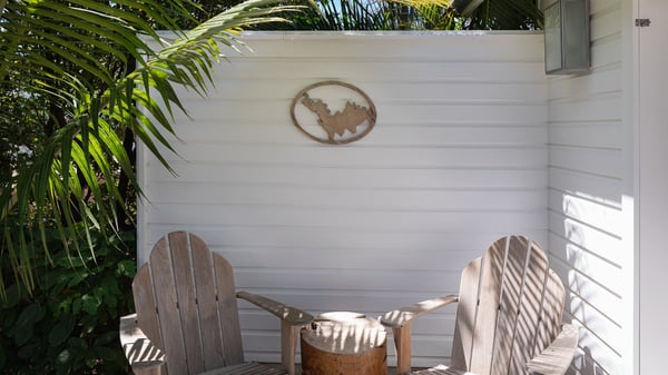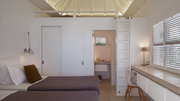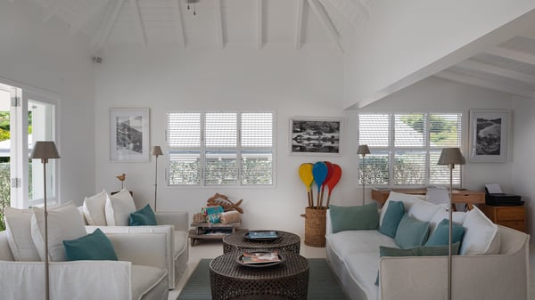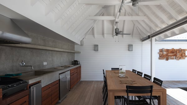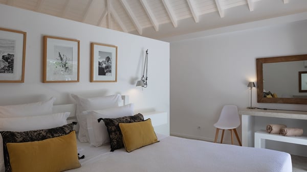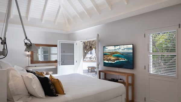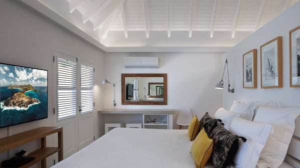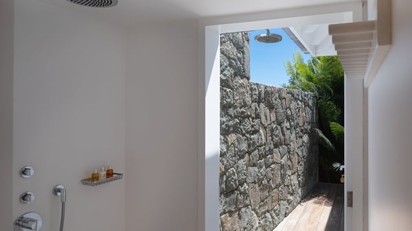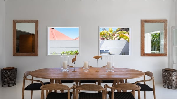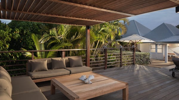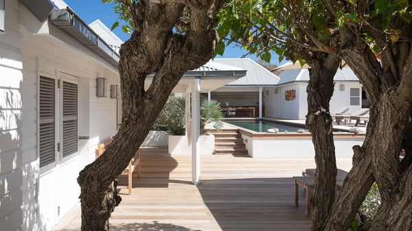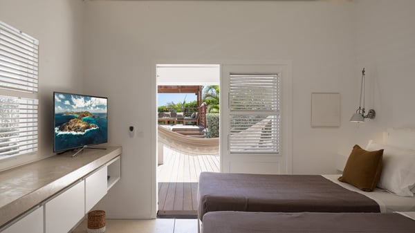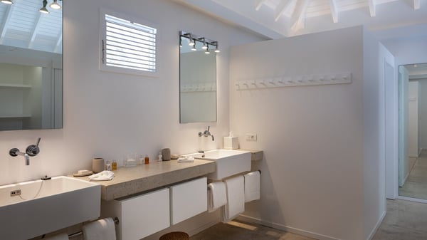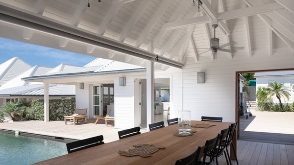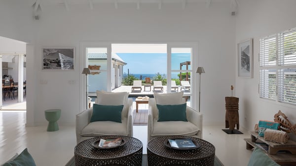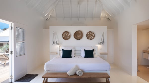 The vacation rental villa Pastels is a beautiful property located in Vitet in the heart of a peaceful and green environment, in front of the sparkling ocean. Spacious and bright, this four-bedroom house with a swimming pool welcomes guests in a very private atmosphere with a wide range of upscale services, in the heart of the Caribbean's lush vegetation. Built around a lovely swimming pool in the heights of Vitet, the luxury villa Pastels in St-Barth is a single-story house in front of the ocean. All rooms are spacious, with wide openings that let in the natural light and the gentle trade winds, which create a most soothing atmosphere. The living room is comfortably furnished with a sofa and soft armchairs, close to the well-equipped kitchen with a dining area that can accommodate up to ten guests. From there, the view over the pool provides a delightful sense of luxury and quiet. Under the high, whitewashed mansard ceiling, the ambience is relaxing and restful. The terrace of the luxury vacation rental villa Pastels is a large teak deck furnished with deckchairs and parasols. In the center, the swimming pool with steps shines under the Caribbean sun, near the many palm trees and exotic plants all around the pool and over the property. On the terrace, you’ll also find a shaded hammock and a pleasant pergola which filters the light rays on the terrace so that you can fully enjoy the mild Caribbean air. You will love sipping a cocktail in front of a view in the outdoor lounge under the pergola, in a truly idyllic setting. The luxury villa in St-Barth Pastels consists of four air-conditioned bedrooms which open onto the terrace. All have their own bathroom, one with two showers, one inside and one outside. Three bedrooms have king-size beds, and the fourth has twin beds. The white and beige colours combined with the warm wood and the modernity of the polished concrete make this vacation villa a lovely paradise in front of the ocean. In the heart of the Caribbean nature in utmost calm and luxury, villa Pastels welcomes guests in a relaxing and paradise-like decor for an unforgettable vacation in St-Barth.