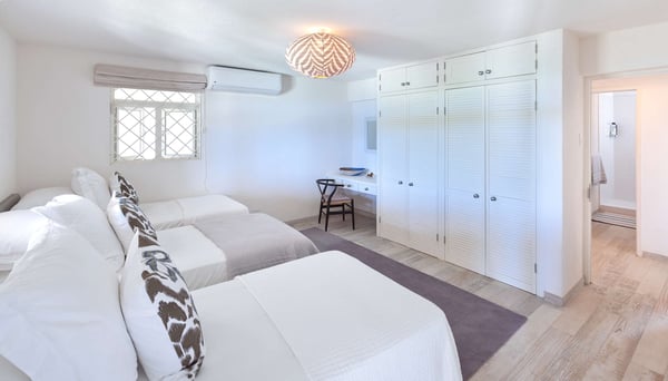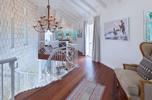 This stunning oceanfront villa in Barbados offers breathtaking views of the Atlantic Ocean, a modern open-plan design, and a relaxed beachy atmosphere. The villa has six bedrooms spread across different levels. The spacious main bedroom, located off the kitchen, features a king-sized bed, ample cupboard space, and direct access to the pool patio. The en suite bathroom offers a shower and a bathtub with a view of the ocean. A stairwell from the kitchen leads to the basement apartment, which includes three bedrooms, a playroom/gym, a small kitchenette, and a casual living and dining area. This separate apartment has its own entrance, offering privacy for guests. On the second floor, accessed via a curved stairway, you will find three additional bedrooms. These rooms offer stunning views of the turquoise and blue sea and feature large windows to let in plenty of natural light. This villa also features beautiful light wooden floors, striking chandeliers, and a state-of-the-art kitchen. The entrance is marked by a unique coral stone wall resembling a lighthouse, which sets the stage for the spacious oceanfront verandah and pool deck. The pool area is perfect for lounging and enjoying the view. In addition, there are picturesque shallow pools and bays nearby along the low cliffs from the garden. The deck is an ideal spot for al fresco dining, with a large dining table that seats eight and oversized sun loungers for enjoying the sunrise with your morning coffee. The fully modernised kitchen includes a large breakfast bar and French doors that open out to capture the views. Emily House is situated in the Atlantic Shores area, known for its picturesque and serene atmosphere. It is close to popular surfing spots, Miami Beach, and the fishing town of Oistins. The South Coast, where the villa is located, is famous for its laid-back vibe, excellent restaurants, vibrant nightlife, and beautiful sandy beaches. The airport and Barbados Golf Club are also a short drive away.