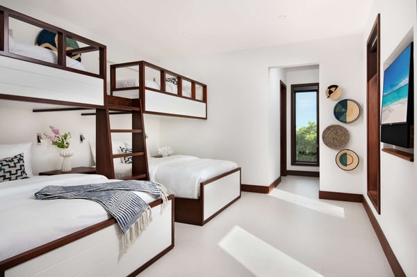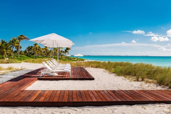 Elegance, serenity and hotel-quality service on one of the finest beaches in the world. Grand in scale and exquisite in its detailing, every inch of Vision Beach embodies contemporary coastal glamour, its pleasures unfolding as you proceed through the airy great room and out onto the terrace, past the sunken firepit and across the pool to the powdery sands of Grace Bay Beach. With a full bar, dining area and pool table outdoors but under cover, a sun deck in the sand dunes, a hot tub integrated into the pool and kayaks available, there is entertainment for every age and interest, and a full staff including a chef and butler, to ensure an entirely relaxing experience. At the heart of Vision Beach is the gorgeous open plan living area, with a gourmet kitchen, a dining area, and inviting seating that merges with the outdoor recreational spaces, while a separate prep kitchen ensures the chef’s work does not disturb. Four bedrooms are on this level, ensuring easy access for those with limited mobility. Two are principal suites with king-size beds, beach and ocean views, and large, luxurious bathrooms, and two are family rooms each sleeping four, with custom bunk beds arranged over queen or king-size beds. Upstairs, a sensational primary suite with gorgeous hardwood floors and ceilings, indoor and outdoor showers, and a private balcony embraces glorious views and offers absolute privacy. With so many spaces to relax or socialize and indoor facilities that include a fully equipped gym with a Peloton bike, a massage room and a cozy media room with a games table, Vision Beach has all the ingredients for fun family gatherings.