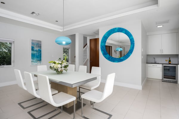 Nestled in a quiet residential area, this four-bedroom Grace Bay retreat offers the perfect blend of privacy and proximity to the beach. Just minutes away from the white sands and clear waters of Grace Bay, the property boasts clean lines and modern decor that blend beautifully with its picturesque setting. Surrounded by mature tropical trees, with a well-tended lawn and borders filled with vibrant foliage, the garden views glimpsed through the windows offer a constant reminder of the natural beauty that surrounds the property. As you step inside, you'll be greeted by cooling white interiors complemented by azure and teal hues that instantly instill a sense of quiet calm. After a day in the sun, take respite on the shaded terrace, enjoy chilled sundowners around the firepit whilst your private chef prepares an island feast for all the family. So, whether you're relaxing by the sun-dappled pool or entertaining in the spacious living and outdoor areas, this Grace Bay retreat provides the perfect backdrop for a stress-free and tranquil island escape. N.B For larger groups, Turquoise Villa can also be combined with larger sister property Salacia as a spacious 13 bedroom option.