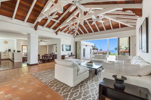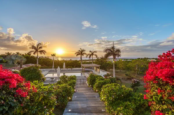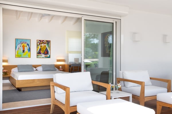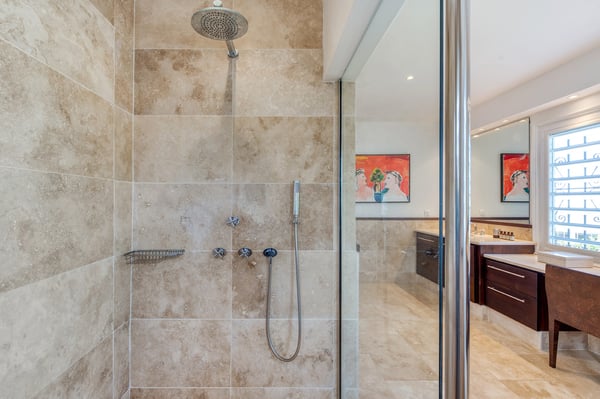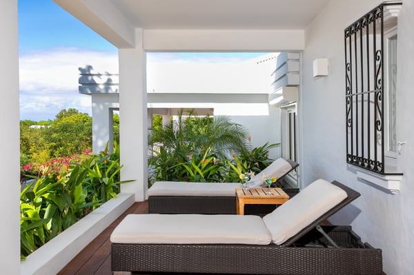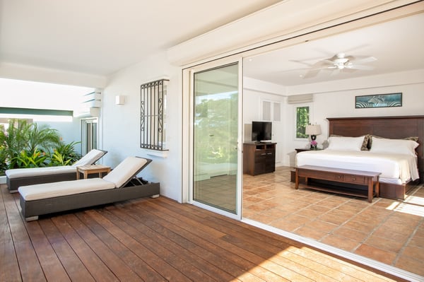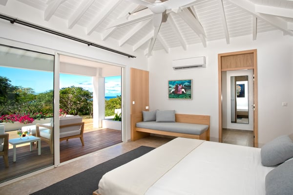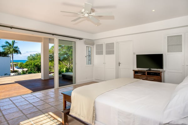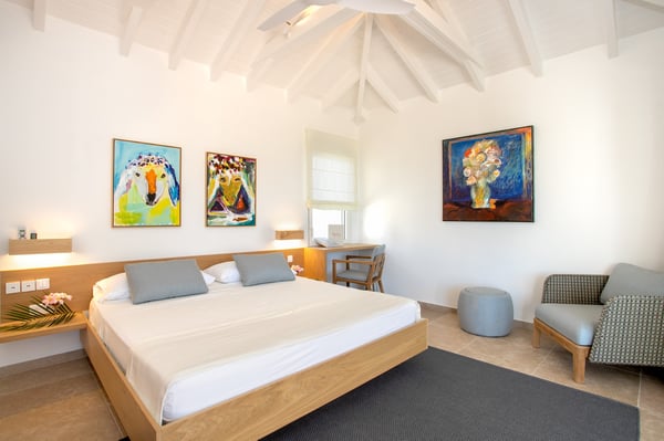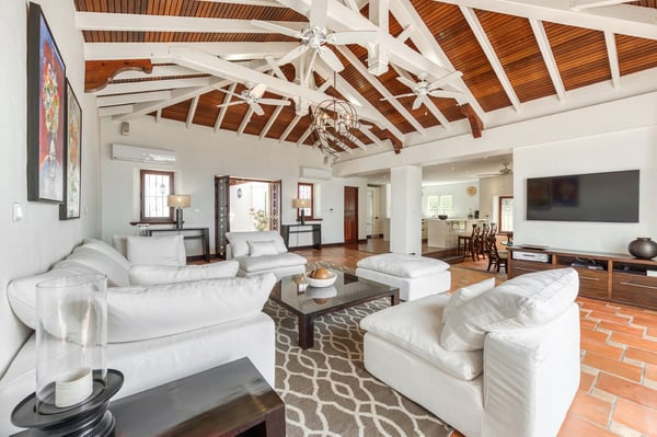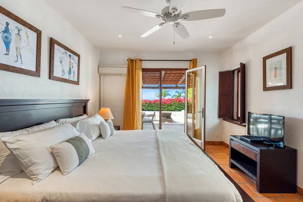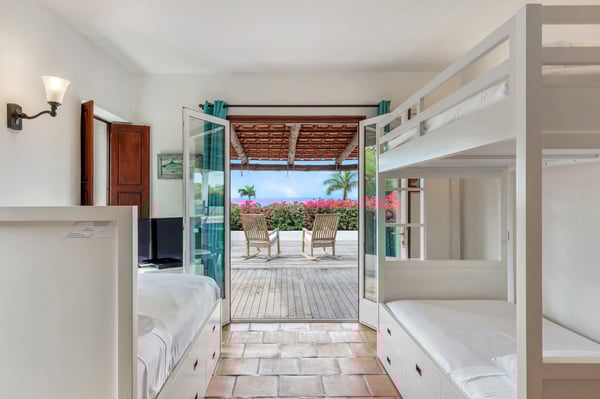 Located in Terres Basses, St. Martin, the elegant Spanish-Caribbean-style Villa La Hacienda is designed to capture the views and maximize outdoor living. The covered courtyard entrance with its Old World wooden doors, tiled floors, and exotic plantings creates the perfect introduction to a stunning tropical view. Framed by royal palms and pink bougainvillea, the view is a panoramic vista filled with shades of blue from the sapphire sea to the deep blue sky; gorgeous in the daytime, spectacular at sunset. Beautifully designed gardens surround the house and terraces. Epi wood decks on multi-levels offer endless options for dining, lounging, and sunning. You can be private or together with your friends or family. Villa La Hacienda's upper deck flows off the main indoor living area. Under wide-covered gazebos, you can lounge, dine, or fire up the barbecue. Step down to the gorgeous lower level for a swim in the inviting pool surrounded by covered terraces and sundecks. The interior great-room, with terracotta floors and dark Spanish-style vaulted ceilings, is cool, breezy, and light. Pocket doors open to the view. Comfortable oversized seating in white and taupe against dark woods set an elegant, low-key atmosphere for lounging and dining. Spanish-inspired doors and windows are featured throughout the house for an exotic touch. The well-equipped new kitchen is sleek and contemporary. Villa La Hacienda is now offering seven bedrooms. Connected to the main building, there is one private casita off the upper deck (Bedroom 1). Spacious and comfortable, each room's decor is a blend of serene whites and tans mixed with dark wood. Charming Spanish style shutters create privacy. This casita has sea and garden views as well as a patio. The gorgeous spa-style bathroom, with walk-in showers, are designed in travertine accented with dark woods. This bedroom offer exterior access only. Bedrooms two and three connect to the interior living space. It's a wonderful setup for children. One room has bunk beds. The adjacent room has a king bed. The two share a spa-style bathroom and a beautiful patio-style terrace. Four newly constructed, modern bedrooms on the right wing, each designed for additional comfort and privacy (Bedroom 4, 5, 6, and 7). These bedrooms feature stunning garden views, ensuite bathrooms with showers, walking closets, and a shared, covered terrace. With this expansion, La Hacienda can now welcome up to 14 guests, making it ideal for larger groups, whether friends or family. In July 2025, Villa La Hacienda expanded its amenities to include a private pickleball court and a basketball hoop: perfect for those who enjoy staying active while on vacation. Although private and secluded, Villa La Hacienda is close to amenities. Long Bay Beach and Cupecoy Beach are only 2 minutes away. It's also a short drive to Porto Cupecoy for grocery shopping and restaurants, including island favorite Mario's Bistro. 5 minutes in the opposite direction, you'll find Baie Nettle's wonderful gourmet restaurants. Another 5 minutes from here and you reach the charming French capital of Marigot with restaurants, shops, and galleries, historic buildings, and the Creole Market. Drive 25 minutes to Grand Case or Philipsburg's shopping haven, while only a 10-minute drive to the international airport.