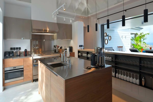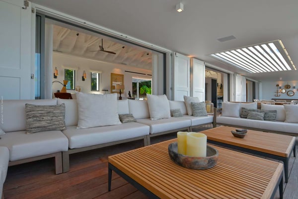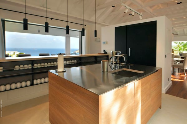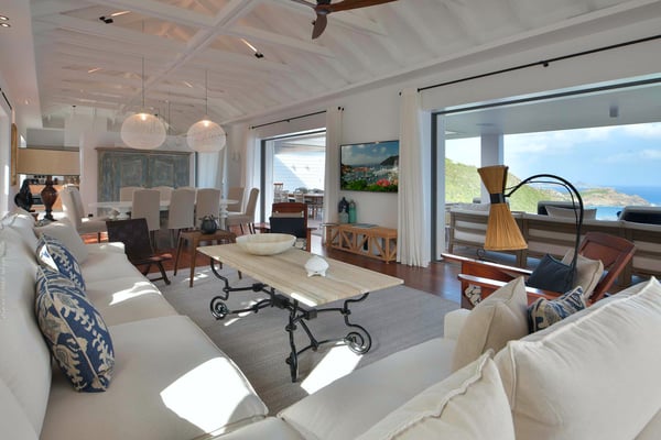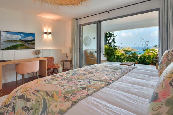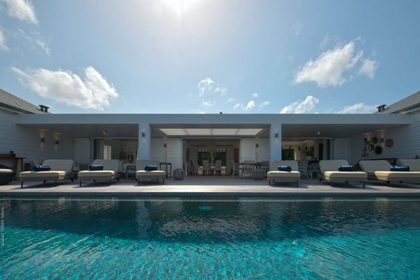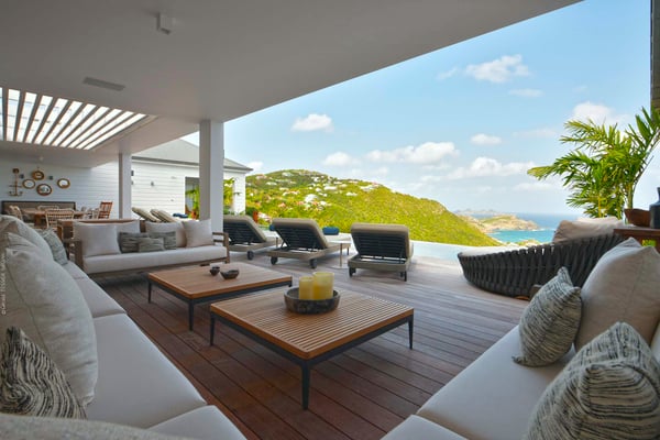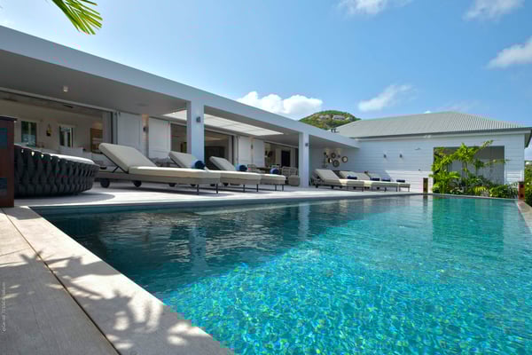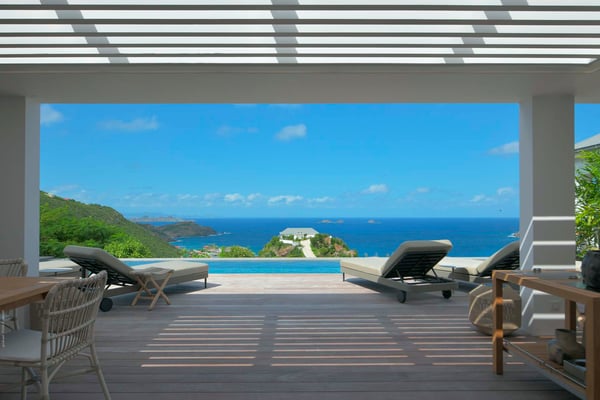 Romance is a splendid villa located in Flamands. It is elegant, modern, spacious and very pleasant to live in. From the large heated pool, you can admire the amazing view of the ocean or welcome your friends with the large main terrace. Access to the first three bedrooms is through the main room. The other three bedrooms are one floor below. Five of them have individual terraces. We highly recommend this luxurious villa.