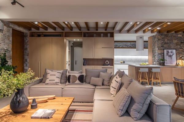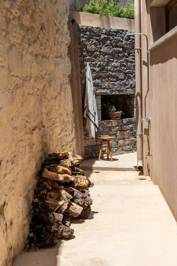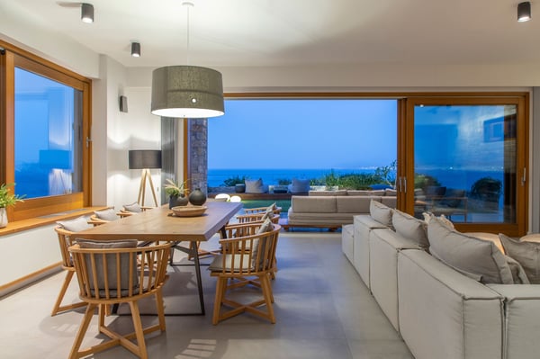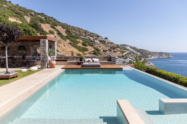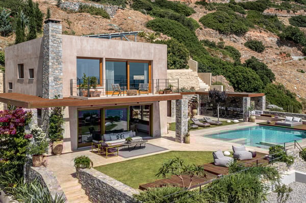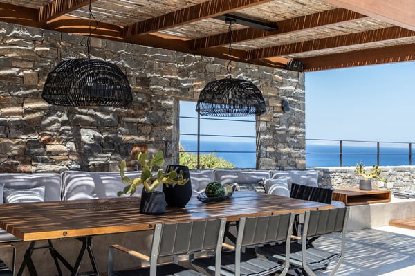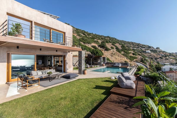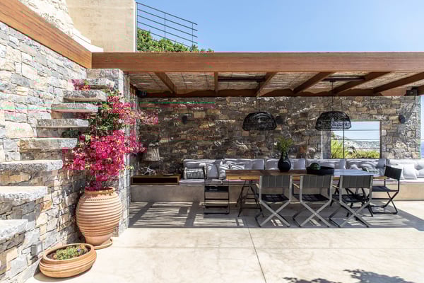 Villa Octo is a newly designed, eco-friendly, 195-square foot villa located near Heraklion, the capital of the island, on a bay overlooking the city. The villa is comprised of two levels and it can host up to six-people. On the first floor there is the Master Bedroom with a suite bathroom offering a spacious jacuzzi bathtub, ideal to relax and enjoy a beautiful view through the window with a glass of wine. Its main feature is the amazing view of the horizon and the sea from every corner of the bedroom which entices you to lose yourself with your partner. Two more bedrooms individually designed and furnished offer you relaxation and comfort. The main bathroom with shower services the extra bedrooms. All bedrooms are equipped with CocoMat natural full latex anatomic mattresses and bedding to offer the ultimate sleeping experience. On the ground floor, you will find the luxurious open space living room and kitchen area with hand-picked, stylish sofas and specially made furniture for you to enjoy the splendid views and share moments with your friends or family. The ideal space for private dinners or drinks with your loved one. Free wireless Internet is offered throughout the premises along with a tablet, a music set, a DVD player, and satellite TVs to service all your needs. The kitchen is fully equipped to allow you to prepare anything you wish for you or your company. The external of the villa consists of a beautiful garden with stone walls, open-air kitchen, a large barbecue area with a dining area, and an external toilet and shower. The unique element though is the beautiful private pool which offers you hydro massage (whirlpool) and foot air massage to complete the feeling of seclusion and luxury. The private hammam will complete the overwhelming experience. The external area is your unique space to pamper your body and your soul and enjoy the sunny and warm climate of the island days and nights. There is also a private, secure parking area for the guests of the villa with a remote control entrance gate. LICENCE: EL 1039K91003104501