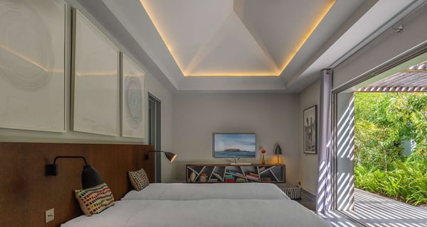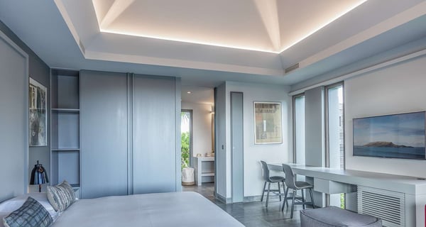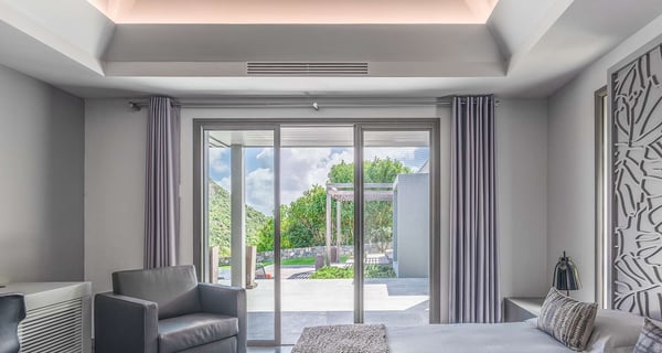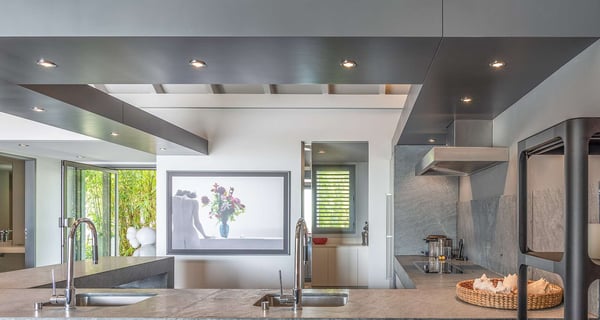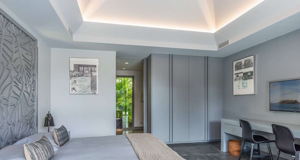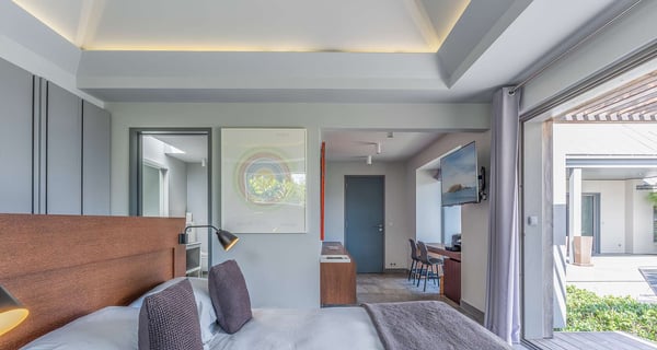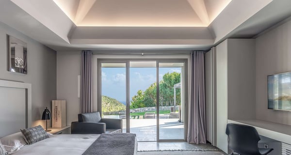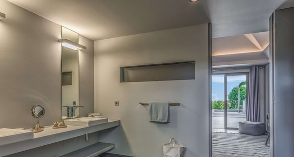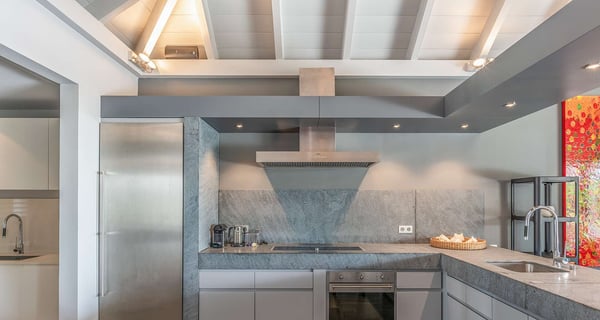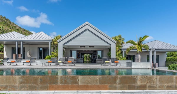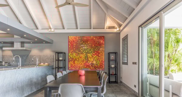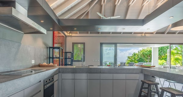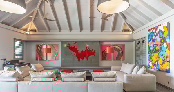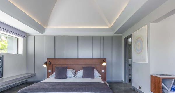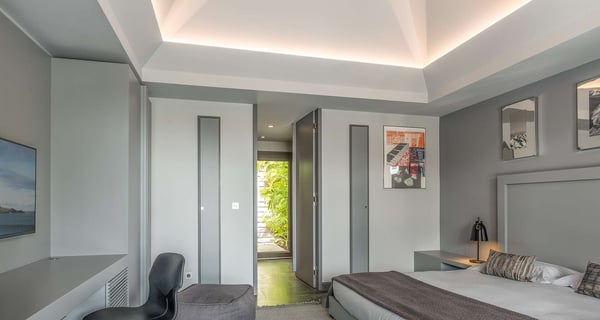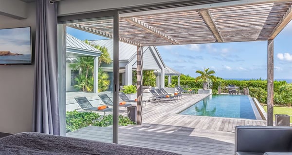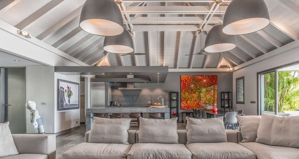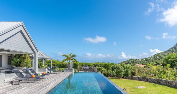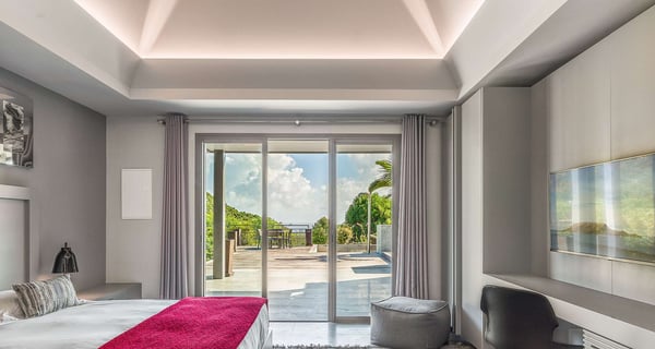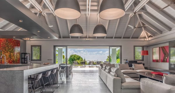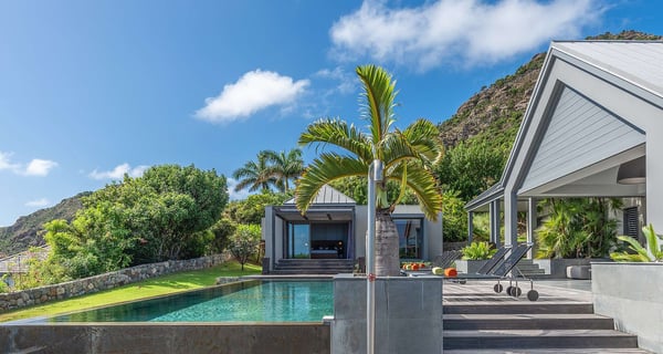 The holiday rental Villa Angel is a sumptuous property located on the heights of Vitet, in the heart of St-Barths’ rolling hills. With a splendid view over Grand Fond and large indoor and outdoor spaces, Angel consists of six bedrooms with private bathrooms in the most refined contemporary decor, for an unforgettable vacation with family or friends in St. Barths. Built over one main building and two comfortable bungalows, the vacation rental Angel is ideally located in the tropical Caribbean environment in front of the deep blue ocean. This beautiful property features lovely shades of gray in its welcoming and spacious lounge with sofas and fine cushions, while the ocean breeze gently blows through the openings. The amazing view over the swimming pool and the ocean creates a delightful feeling of relaxation. Close to the indoor dining room, which can accommodate up to twelve guests, you will find the well-equipped kitchen with a breakfast bar ideal to talk over a coffee. What’s more, artworks bring charming colourful hints throughout the indoor space. At the front of the villa, the beautiful terrace faces the view over Grand Fond and the sparkling ocean. The large heated infinity swimming pool is at the center of this well-appointed outdoor space well furnished with lounge chairs and featuring an outdoor shower as well as a pleasant children's basin. The Caribbean vegetation brings a fresh touch to this idyllically beautiful setting. You will also enjoy reading or chatting around the outdoor table located near the barbecue. Between sky, vegetation and ocean, you and your guests will marvel at the beauty of nature. The holiday rental villa Angel is composed of six air-conditioned suites with king-size beds and en-suite bathrooms throughout the property. Four bedrooms are located in the main building, while the fifth is in a bungalow which overlooks the pool deck. The sixth one is in the second bungalow and features a kitchenette, making it perfect for a teenager or for staff. Velvet curtains, office areas, and soft cushions create a soothing atmosphere in these bedrooms, where you will enjoy relaxing after days of exploring the island's treasures.