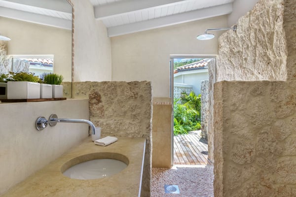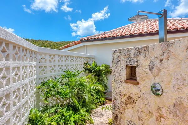 Casa Cervo is a lovely home. It is built modularly. Each room stands on its own built around a pool. The four bedrooms we used are almost identical. Two have outdoor showers two don’t. They have a large living / dining area. The kitchen is Euro so the oven is tiny by US standards but nice. Biggest complaint no air conditioning in the kitchen or bathrooms. We were there in October and still very warm in these spaces. Storm shutters can be opened in the kitchen for air flow but then the bug issue. It is in the Caribbean. The deck is wood so don’t forget tweezers for splinters. Access to the beach is easy. The beach is extremely rocky and rough. The view sensational! Sitting in the gazebo provides ultimate relaxation