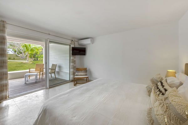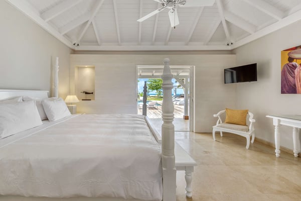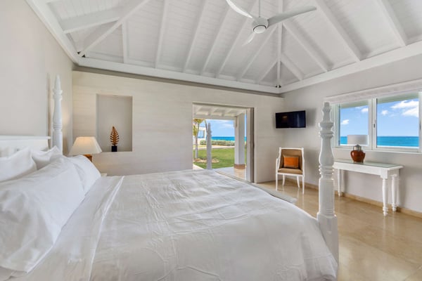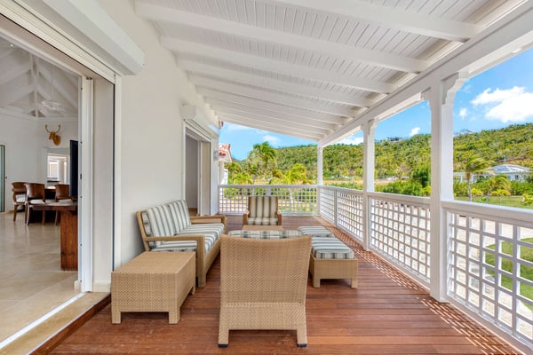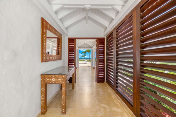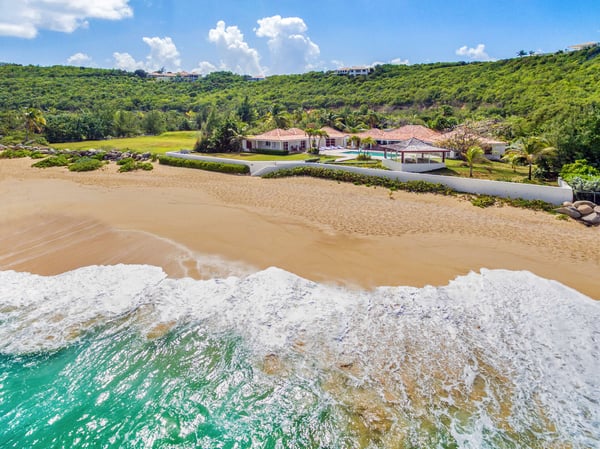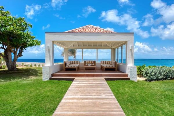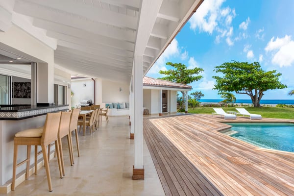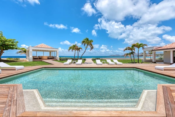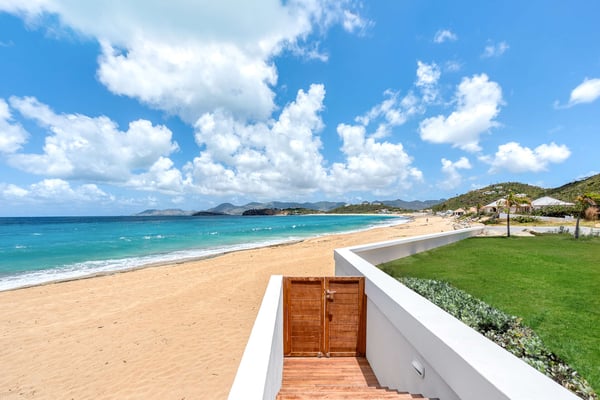 Set in a tropical courtyard with a circular drive, the grand raised entrance begins the crescendo for the view. Set right at the ocean's edge, the stunning scene flows over the wide green lawn right out to the turquoise sea and beyond to Anguilla and the poetic mountains of St Martin. Step through the gate right out to the sand. Every room enjoys incredible views. The main living area's glass doors disappear, giving you full access to the sea breezes and nature's beauty. A spacious open plan includes multiple areas for lounging and dining. The villa's decor tastefully mixes Indonesian teak with contemporary pieces in soft white. The sleek kitchen is a wonderful place to prepare a meal while taking advantage of the view and your guests. Ample outdoor living includes sea-facing covered verandas that connect all the rooms with the main house, providing multiple opportunities for dining and relaxing. Oversized travertine tiles flow throughout, blending with the Epi wood pool deck for a seamless transition from interior to exterior. The large classic pool, the centerpiece of the deck, creates a visual connection with the sea. A grand gazebo sits at the ocean's edge, where you can relax in comfortable seating and enjoy the music of the surf from sunrise to sunset. If you prefer private garden views, a large, well-furnished deck sits off the main living area. Large and small, colorful tropical gardens are placed throughout the villa. Four of the five bedrooms have private seating areas and sea views. The fifth bedroom is located on the garden level with a private patio. The decor is a mix of soothing whites and warm beiges. The en suite bathrooms have a stylish spa feel, complete with river stone trimmed showers, teak benches, and marble tiles. Several bathrooms have ocean views. The Lowlands are the location of some spectacular beaches: Baie Longue and Baie aux Prunes (Long Beach and Plum Beach) are secluded, have public parking, but no services. Neither beach is ever crowded. Baie Rouge is set amongst some dramatic red cliffs. The elegant homes in Terres Basses are sitting on generous lots, most of them with gorgeous views of either the Lagoon or the ocean, or both. By car it's about 10 minutes away from Marigot, and 15 minutes away from the Airport.