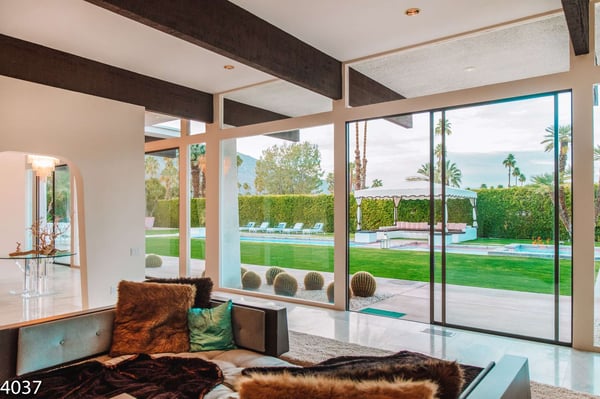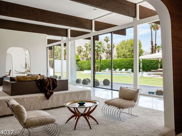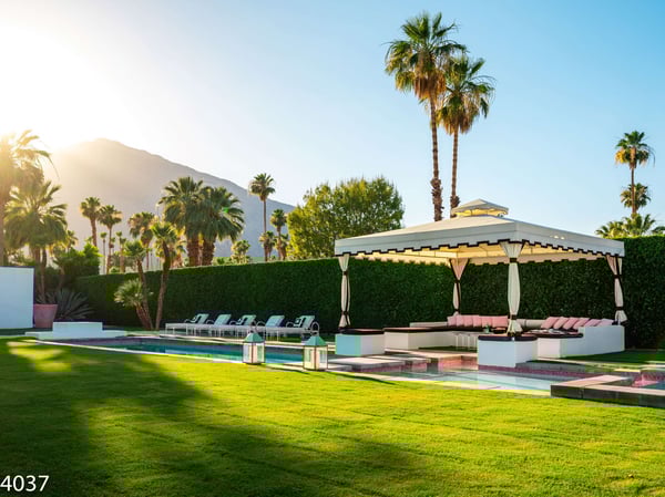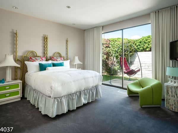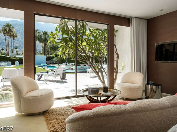 An iconic mid-century desert ranch situated on a double lot in the popular Indian Canyons neighborhood, Villa Sierra is a sprawling 4-bedroom, 4.5-bathroom property with grand entertainment areas and floor-to-ceiling windows that blur the boundaries between inside and outside. The manicured grounds, towering palm trees, and captivating mountain views permeate the brilliantly designed 5,300-square-foot home that sleeps 8 in total luxury. Styled in a chic, holiday regency scheme, the open living area excites the imagination with its globally inspired collection of art and richly colored décor, including a Byzantine blue leather sofa and a canary yellow bistro table. A minimalist dining room, brightened by pink chairs, seats 8 around a unique tree trunk table, while 4 mid-century saucer chairs at the chef’s table provide a casual dining space. The gourmet kitchen’s Sub-Zero refrigerator and Viking stove are complemented by pistachio green cabinetry that adorn the walls. Set against a Baroque stained-glass window is a billiard room with a beautiful mosaic wet bar, ideal for mixing drinks between games. With a quartet of sumptuously appointed bedrooms, each adorned with Frette linens and sliding glass doors leading to the backyard sanctuary, Villa Sierra provides endless luxury. Its 75-foot swimming pool captivates guests—boasting an attached sitting spa and Bisazza in-laid tanning shelf—with a small walkover that leads to the 10-person art deco cabana, ensuring loved ones never want to leave this peaceful oasis. A lush, green Ficus wall surrounds the manicured grounds for total privacy while sipping cocktails at the outdoor bars and grill nooks, lazing in the poolside loungers, or dining alfresco under the clear blue skies. When night falls on the valley, an outdoor firepit is sure to please with the remarkable silhouetted mountain backdrop. That Pink Door is famously known and draws crowds from all over to photograph the spectacular pink door. With on-site parking for 4 vehicles—with 1 in the garage—when it’s time to explore, downtown Palm Springs is a quick 5-minute drive, while Joshua Tree National Park is accessible in under an hour. Book this iconic rental today! *Please be advised that due to severe allergies, this home will not permit pets. Permit #4037