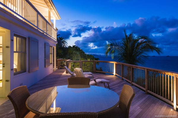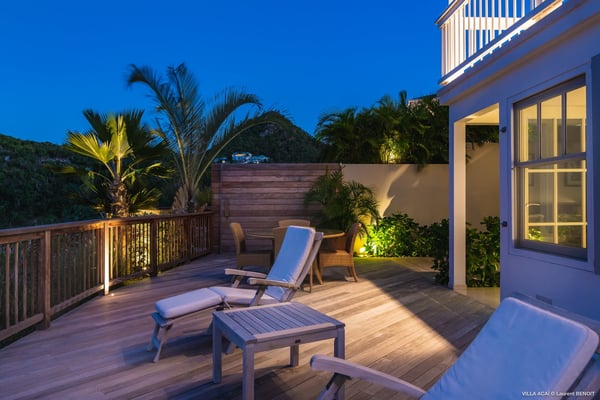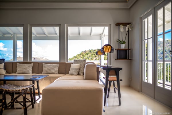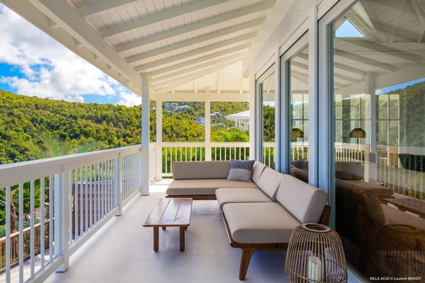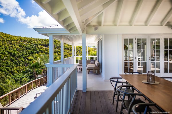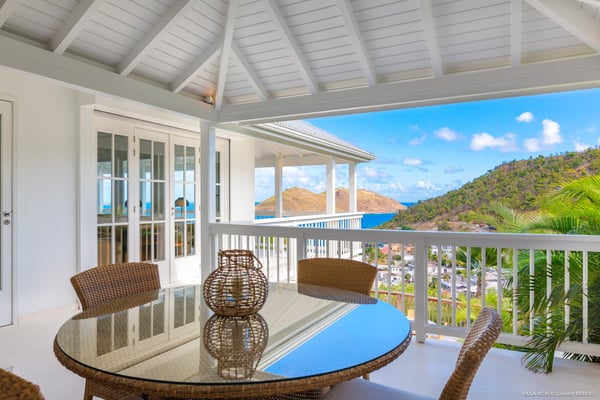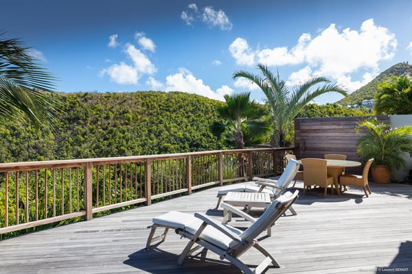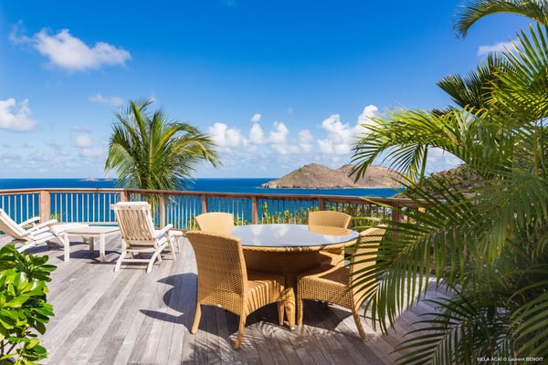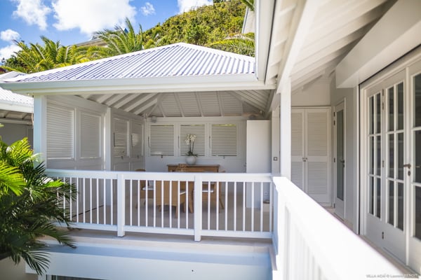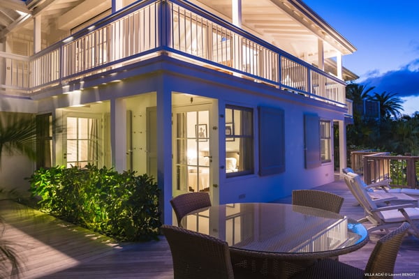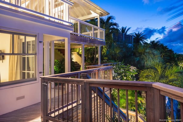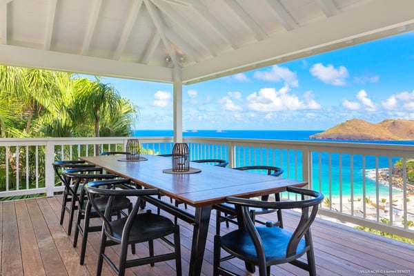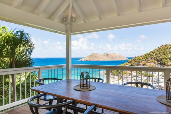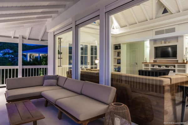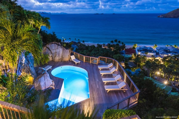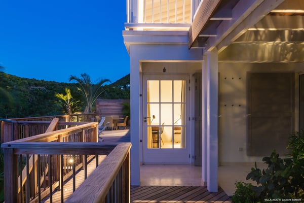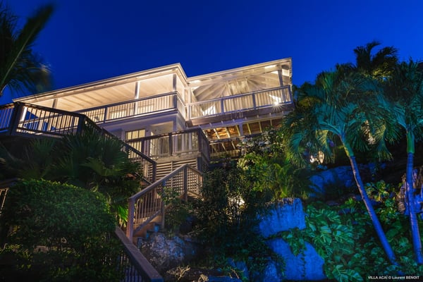 Located a few minutes from the white sand beach of Flamands, the luxurious villa Acai offers an outstanding view of the ocean, the beach and the surrounding islands. Built over three levels in a traditional colonial style, the villa offers comfortable and ample modern spaces, surrounded by a beautiful tropical garden. The living area is located on the upper level, with a fully glazed living room and a unique view of the blue waters of St. Barths. Enjoy serenity in this cozy and air-conditioned great room, with its comfortable sofas and armchairs, and in the evening mildness, just relax in the beautiful soft lighting. The outdoor covered dining room, made of weathered wood, welcomes up to eight guests in selected furniture, facing the ocean and the beach below. A second rattan and glass dining table is installed at the back under a covered terrace. Inside, you’ll enjoy cooking your meals and preparing cocktails in utmost comfort in the fully-equipped and air-conditioned kitchen. Stairs will lead you on the terrace with deckchairs around the heated swimming pool in a tropical environment. Enjoy the unique and amazing view over the Bonhomme island, Fourchue, Saint Martin and Anguilla islands… and the blue ocean. On the middle level, have a rest in the quiet and relaxing spaces with three comfortable air-conditioned bedrooms. The master bedroom is composed of a king-size bed and a private bathroom, with a magnificent view over the pool and ocean. The other two bedrooms share a bathroom and open onto the hillside vegetation. In the evening, the outdoor lighting offers a soft glow, highlighting the original and modern architecture of the house in the hillside under the stars. Located in a quiet area location in the heart of stunning natural surroundings, the vacation rental villa Acai is the perfect choice for a family or for a group of friends looking for a peaceful and unforgettable stay, a short walking distance from the beach.