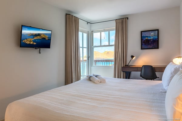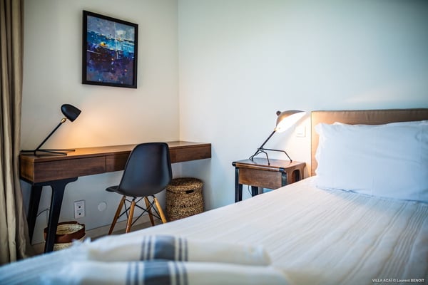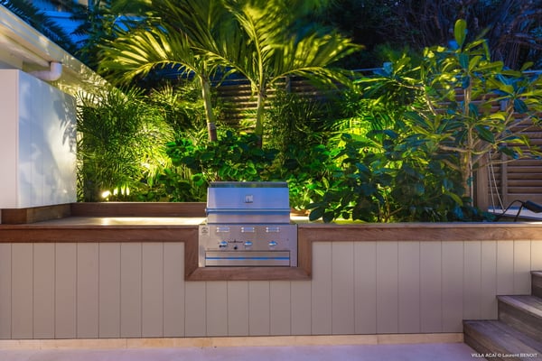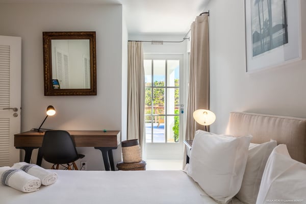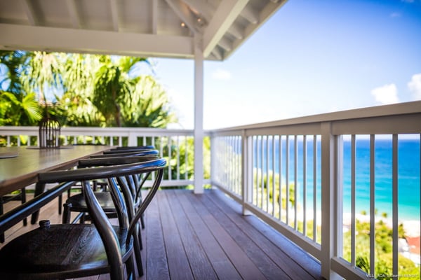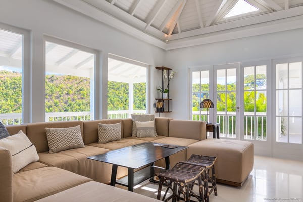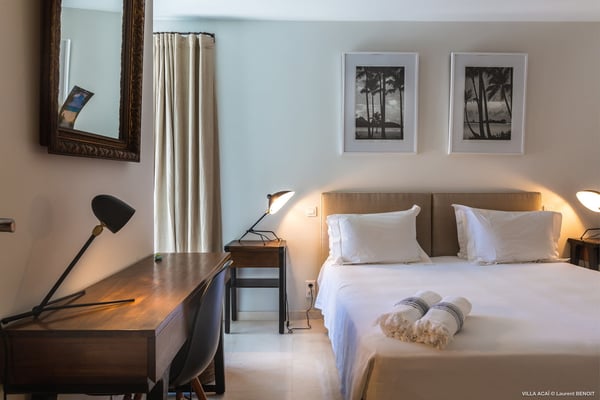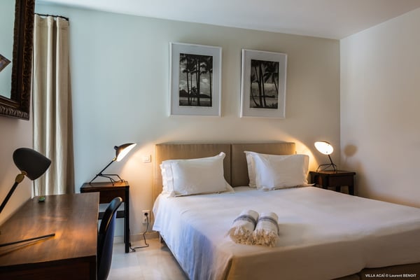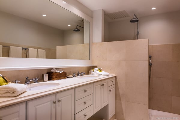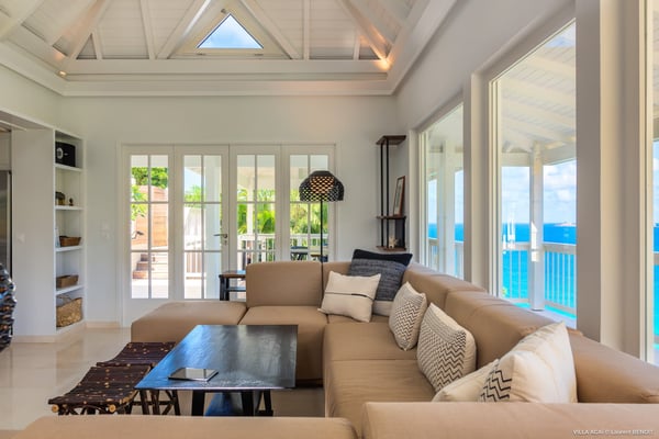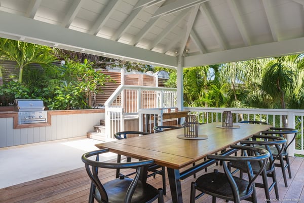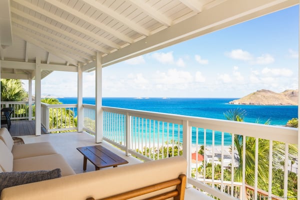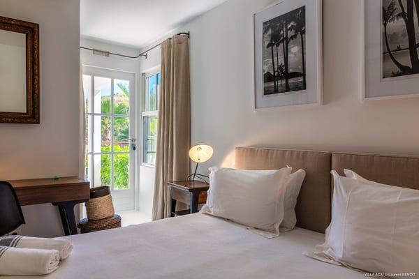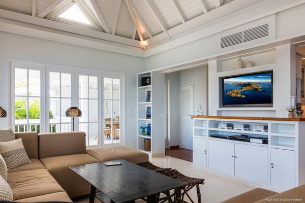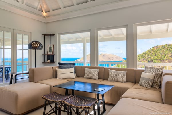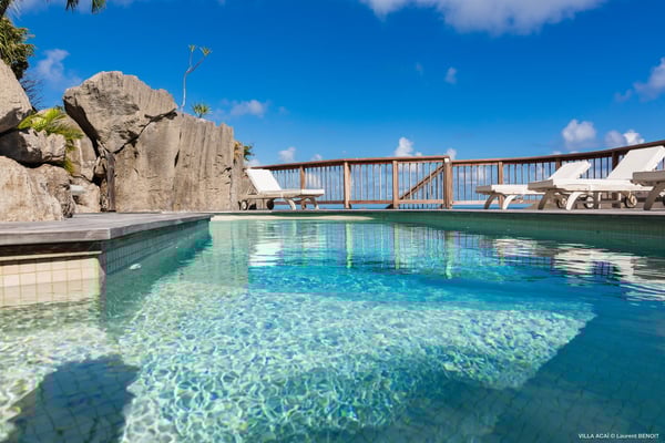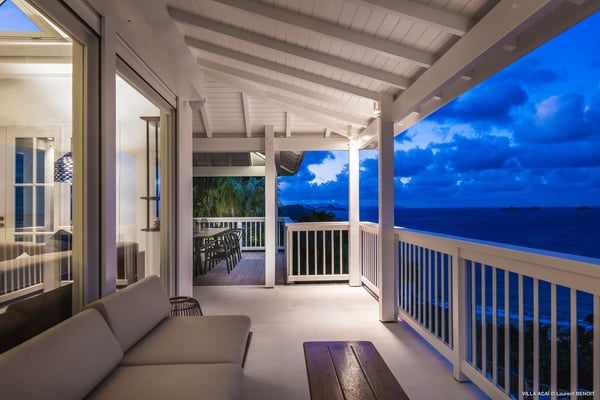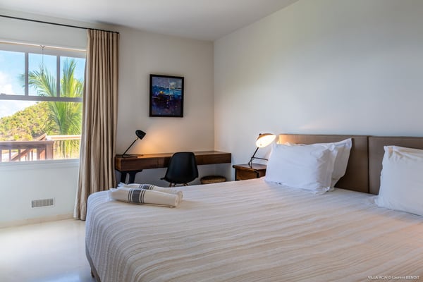 Located a few minutes from the white sand beach of Flamands, the luxurious villa Acai offers an outstanding view of the ocean, the beach and the surrounding islands. Built over three levels in a traditional colonial style, the villa offers comfortable and ample modern spaces, surrounded by a beautiful tropical garden. The living area is located on the upper level, with a fully glazed living room and a unique view of the blue waters of St. Barths. Enjoy serenity in this cozy and air-conditioned great room, with its comfortable sofas and armchairs, and in the evening mildness, just relax in the beautiful soft lighting. The outdoor covered dining room, made of weathered wood, welcomes up to eight guests in selected furniture, facing the ocean and the beach below. A second rattan and glass dining table is installed at the back under a covered terrace. Inside, you’ll enjoy cooking your meals and preparing cocktails in utmost comfort in the fully-equipped and air-conditioned kitchen. Stairs will lead you on the terrace with deckchairs around the heated swimming pool in a tropical environment. Enjoy the unique and amazing view over the Bonhomme island, Fourchue, Saint Martin and Anguilla islands… and the blue ocean. On the middle level, have a rest in the quiet and relaxing spaces with three comfortable air-conditioned bedrooms. The master bedroom is composed of a king-size bed and a private bathroom, with a magnificent view over the pool and ocean. The other two bedrooms share a bathroom and open onto the hillside vegetation. In the evening, the outdoor lighting offers a soft glow, highlighting the original and modern architecture of the house in the hillside under the stars. Located in a quiet area location in the heart of stunning natural surroundings, the vacation rental villa Acai is the perfect choice for a family or for a group of friends looking for a peaceful and unforgettable stay, a short walking distance from the beach.
