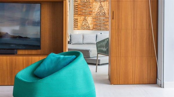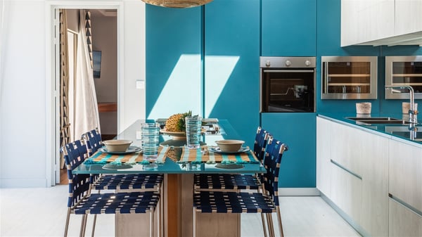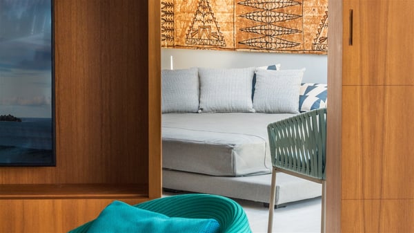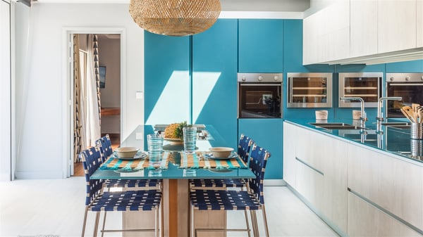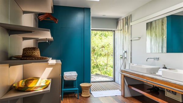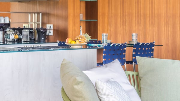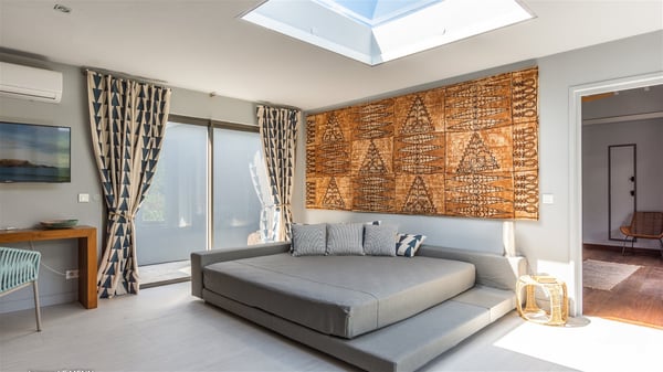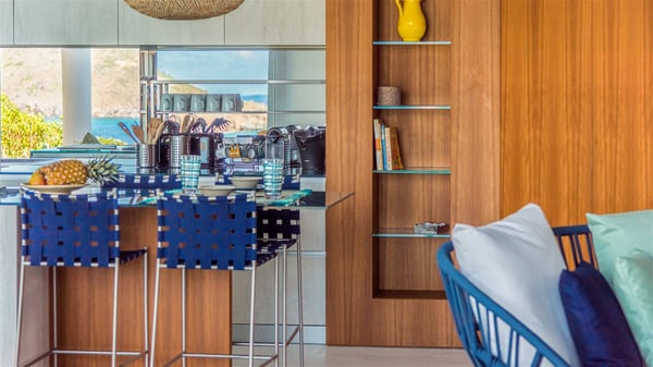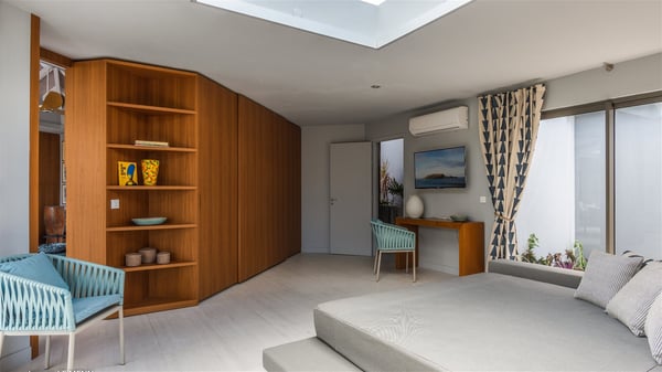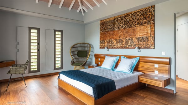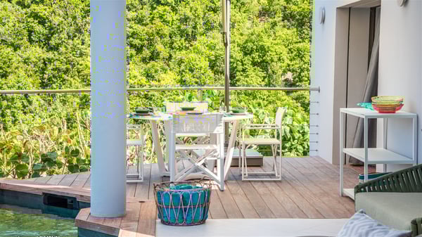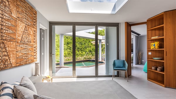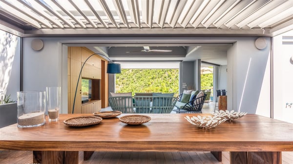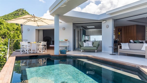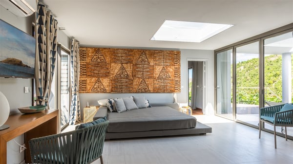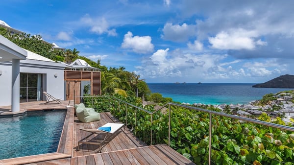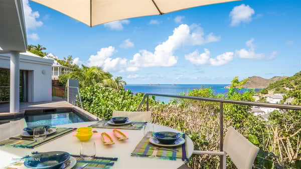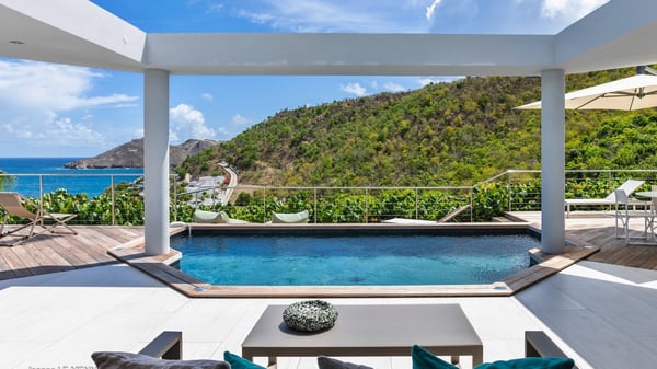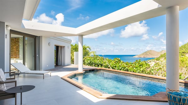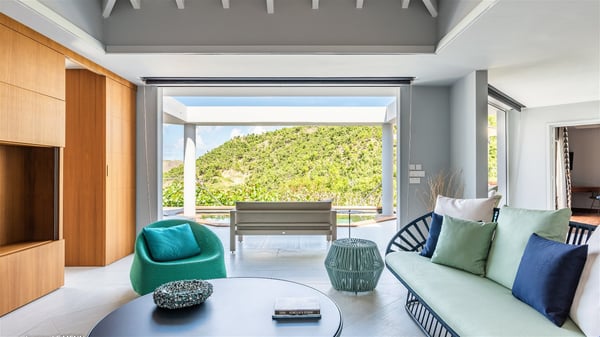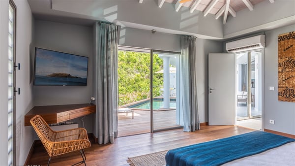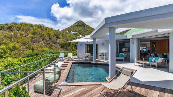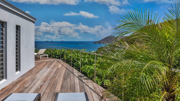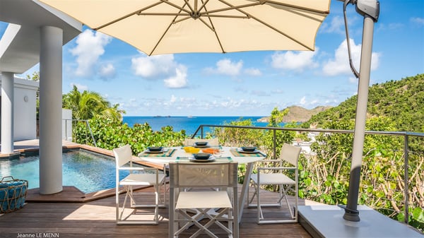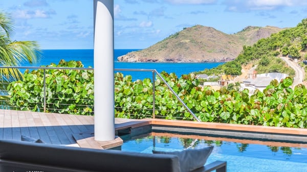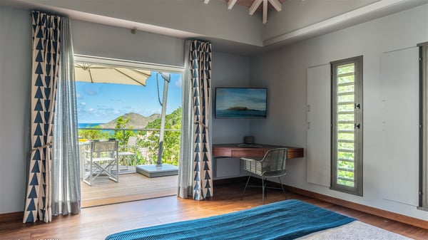 The vacation rental Triagoz is a sumptuous property located in Flamands, close to the beach and the Cheval Blanc hotel. This three-bedroom vacation home opens onto a magnificent view over the ocean and the hills, making it an ideal place for a stay with family or friends in St. Barths. Nestled in a green setting of palm and grape trees, villa Triagoz is built in a contemporary style with clean lines. Recently renovated by its new owners, it combines very modern amenities with the utmost comfort and luxury. The pastel-coloured living room features a delightful shade of blue reminiscent of the nearby deep blue ocean. It is furnished with soft sofas and armchairs facing the breathtaking view over Anse de Flamands and Chevreau Island. On the back terrace, the dining room can accommodate up to ten guests around a long table and wooden benches for delicious meals enjoyment in the natural breezes. You may choose to stay under the sun or in the shade as you wish, thanks to the white electric shutter for protection against rain. The bright kitchen is well equipped with a central island and a dining area for four guests in a shimmering peacock blue décor. The front terrace is a true haven of peace, featuring a beautiful heated swimming pool as well as lounge chairs. A dining table for four people is also set up at one end of the terrace, where guests can sip a cocktail or read under the shade of the large parasol. In this paradisiacal environment, the ocean view is strikingly beautiful, between the wooded hills and the perfect horizon. The rental villa Triagoz has three beautiful air-conditioned bedrooms with en-suite bathrooms and ocean views. They are furnished with king-size beds and decorated with refined wood and picturesque touches. Two of them connect, making it an ideal villa for a family looking for an unforgettable stay in the Caribbean.