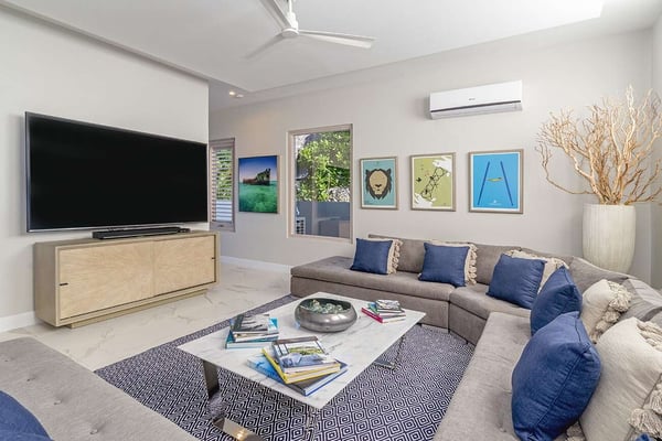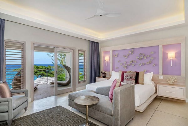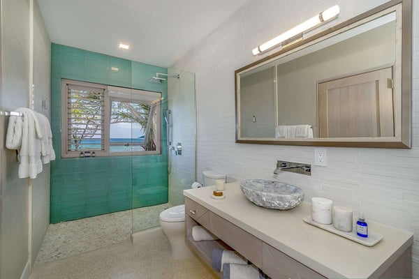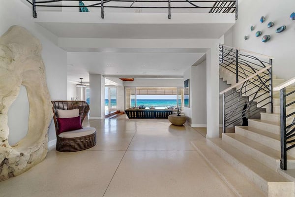 This incredible new villa faces the ocean front and center. From the minute you enter the villa, through the dramatic Jequitiba wood ceiling entranceway and over-sized pivot door, your eye meets the Caribbean Sea. It is home to an excellent collection of artisan pieces representing the very best Jamaican artists including Dougall, Mara Made, Pinto Pottery, and Dready Art. This cool, chic, modern villa is the epitome of ocean-edge living. The sunken-level sitting room benefits from wide openings to the verandah. The custom artisanal dining table made from one piece of Tamarind seats 18 and is a piece of art in itself. There is an air-conditioned games room that leads into the media room filled with enormous comfy sofas and an 85” flat-screen television, perfect for a cozy evening watching a movie or a football game. There are two ground-floor bedroom suites as well as four suites upstairs along with the Sky Gazing Deck furnished with oversized double reclining umbrella chairs to relax and look out at the infinity edge view of the horizon. Buttonwood Reef is conducive to outside living along with the shallow entry, and infinity edge pool with a Baja ledge with sun shelves and an adjacent hot tub for 14. The Almond Tree terrace with barbecue is a shaded terrace overlooking the sandy beach area to the east. A lower terrace with sun loungers, a 3-pin putting green, and numerous other quiet areas for peace and tranquility are available to guests. Next door to the villa (via a gate) is the small sandy beach of Hermosa Cove Boutique Resort, perfect for swimming in the calm, reef-protected bay.