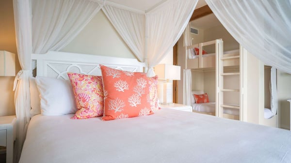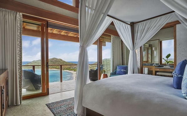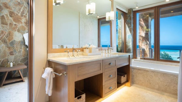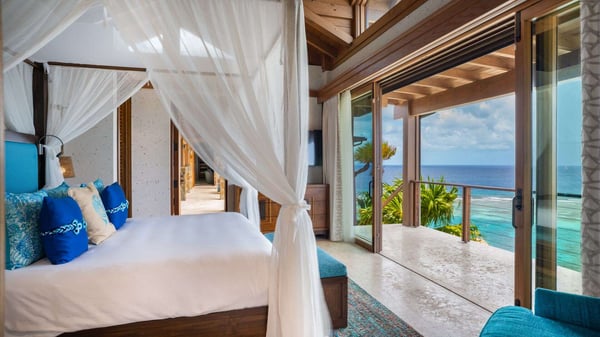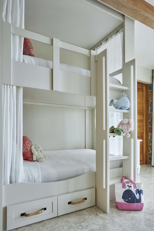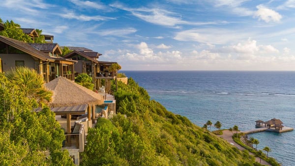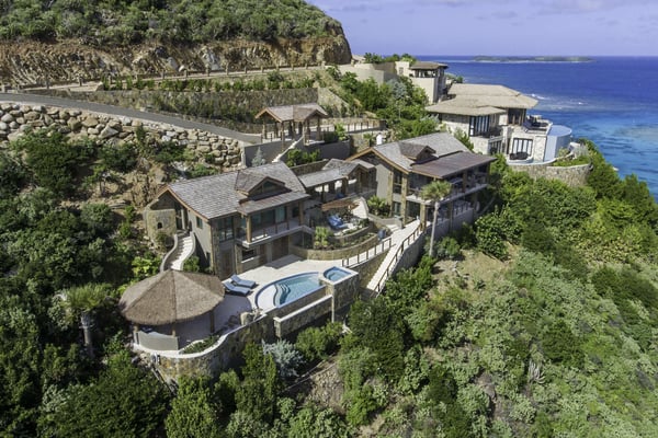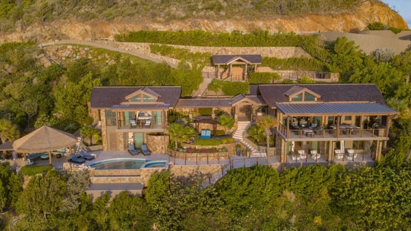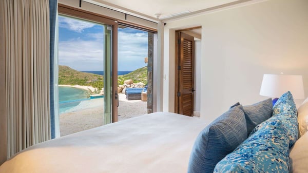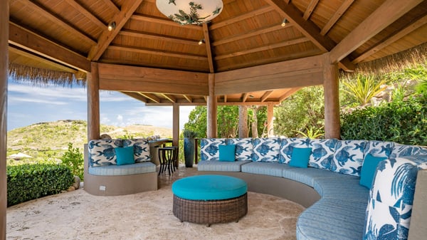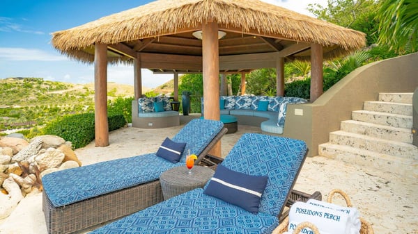 Luxury abounds in this four bedroom villa in Virgin Gorda at Oil Nut Bay. A whimsical water palace, Poseidon’s Perch Villa resides atop the Ridge neighborhood surrounded by natural beauty and turquoise views. Island inspired artistry adds elegantly themed touches throughout this vacation home, while contemporary furnishings offer comfort with style. On the upper level is a generously sized Great Room complete with open-plan kitchen, breakfast bar and living room all under vaulted ceilings with a separate laundry room and half bath. Floor-to-ceiling glass doors open onto a breezy deck with lounge seating, outdoor dining, grill and wet bar perfect for family feasts. This is also the ideal spot for turtle and ray watching in the iconic Oil Nut Bay. On the same level as the Great Room, yet with its own separate entrance is the primary bedroom with a private balcony, ensuite bathroom and outdoor shower with steps directly down to the pool below. This luxury villa also offers a bubbling jacuzzi beside the swimming pool and large tiki hut with casual lounging area. The guest suites offer plush accommodations with ensuite bathrooms, outdoor showers and stunning views from every angle. Two of the guest suites interconnect (or lock for privacy) and one features bunk beds along with a queen sized bed, making it ideal for families. A multi-level, modern, four bedroom family villa with a nautical twist, Poseidon’s Perch is precisely where one could envision the God of the Sea himself surveying the beautiful bay and ocean below.
