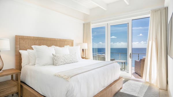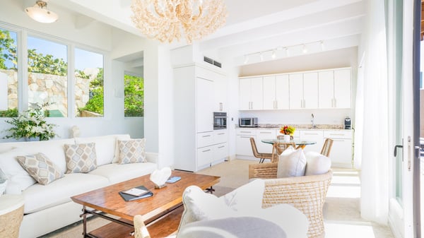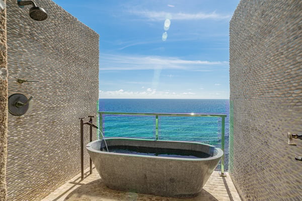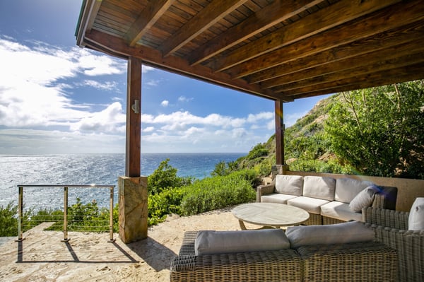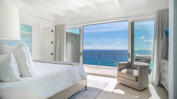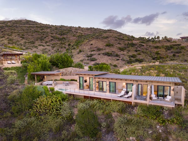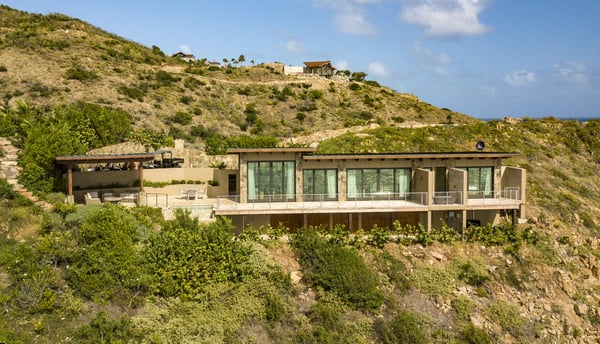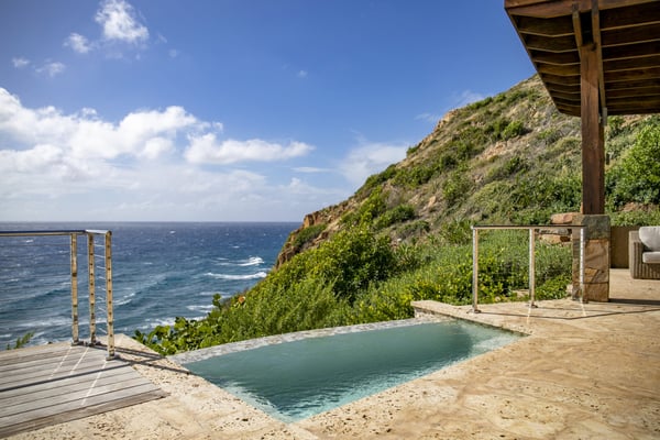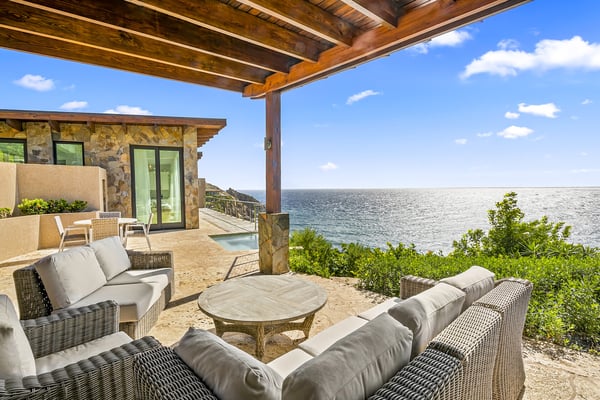 Overhanging the ocean on the southern ridge of Oil Nut Bay, Sol Mate Villa opens up to a full 180-degree view of the Caribbean Sea. As one of our most exclusive two-bedroom British Virgin Islands rentals, it is the epitome of simple island elegance. Clad in beautiful native stone, the vacation villa’s natural color palette allows it to blend seamlessly into the landscape. Soft tropical light streams through floor-to-ceiling glass doors that run the length of the home, and the cool ocean breeze carries with it the soothing sounds of the breaking waves beneath. Paradise found! Wrap yourself in luxury while staying in this beautiful vacation home featuring two exquisite Primary bedrooms, ensuite bathrooms, and private patios. This graceful villa boasts an open living area with a fully equipped kitchen. Enjoy the plunge pool on the spacious terrace while the tide turns beneath you, or climb the natural stone path and take in the sunset from the elevated deck perfect for whale watching. Our British Virgin Islands rentals are all about the splendor of the ocean and the casual-chic Caribbean lifestyle.