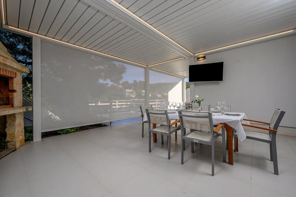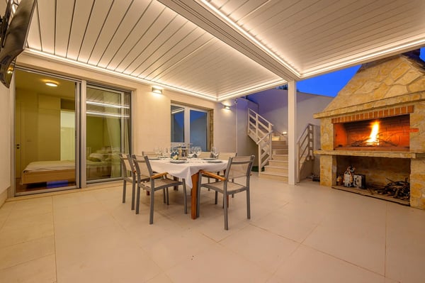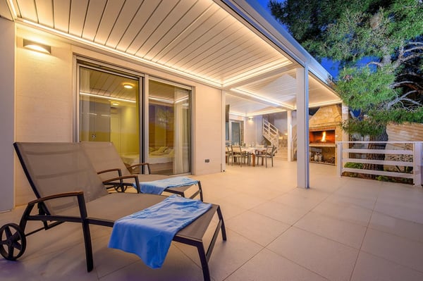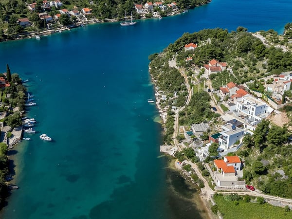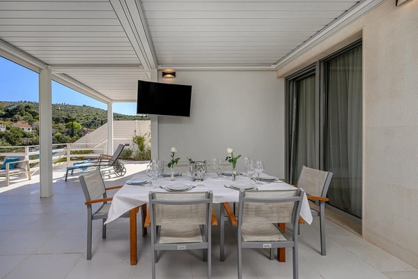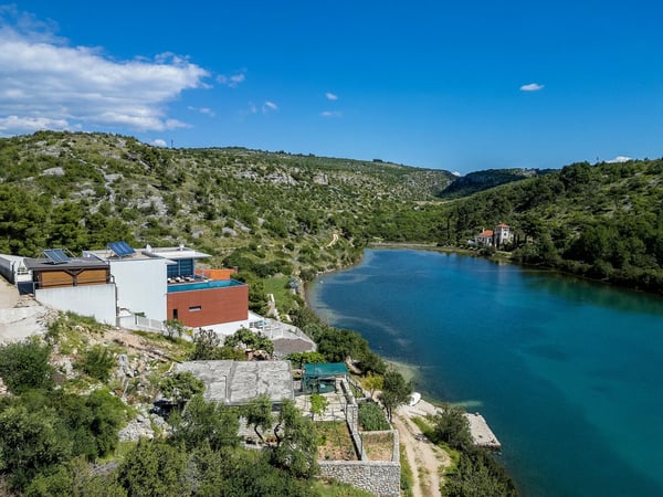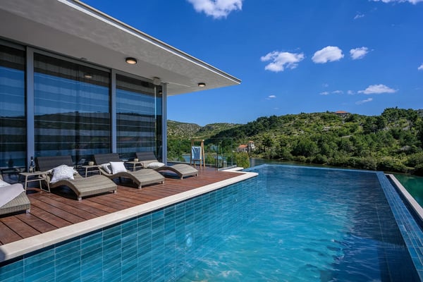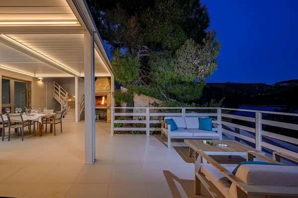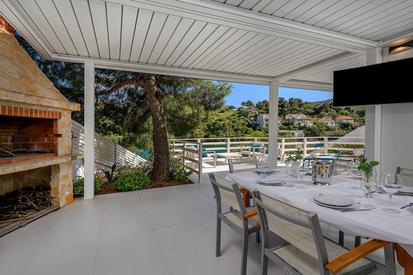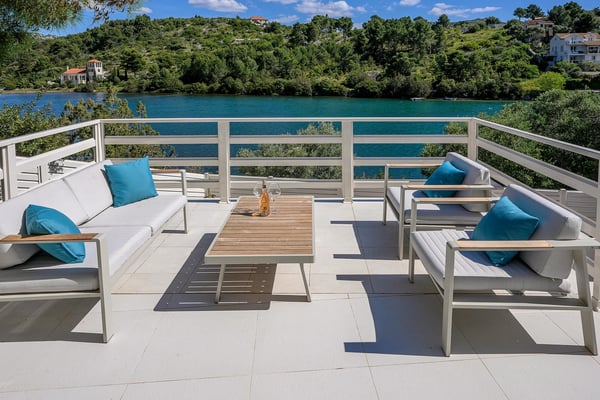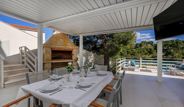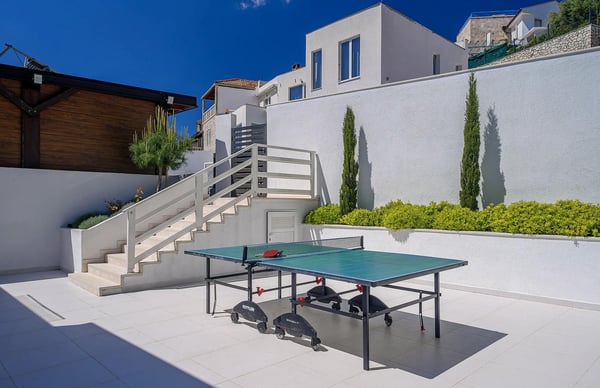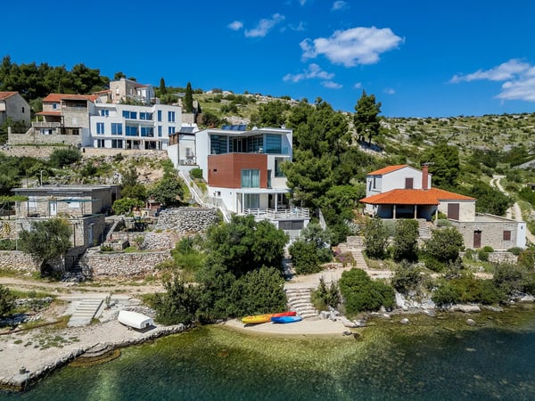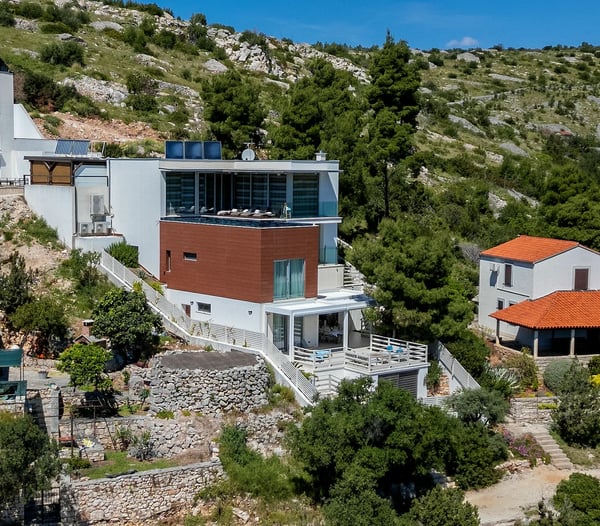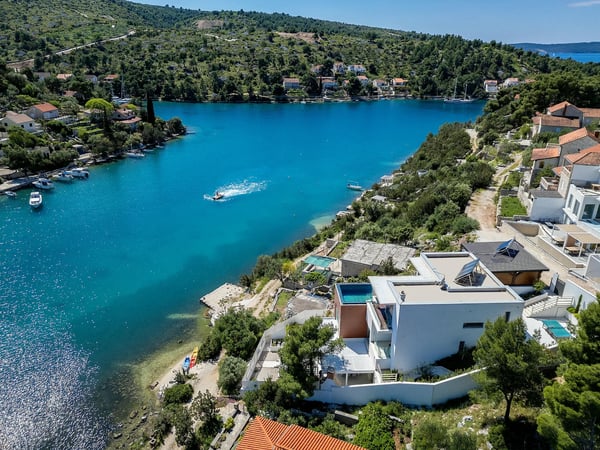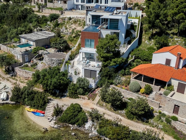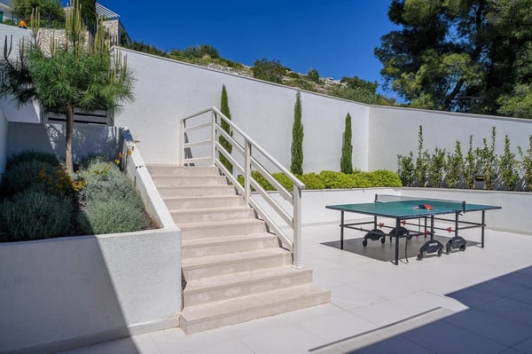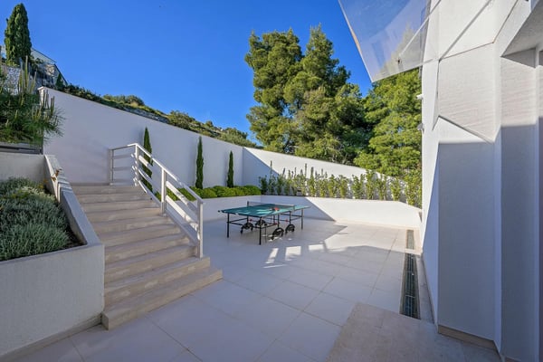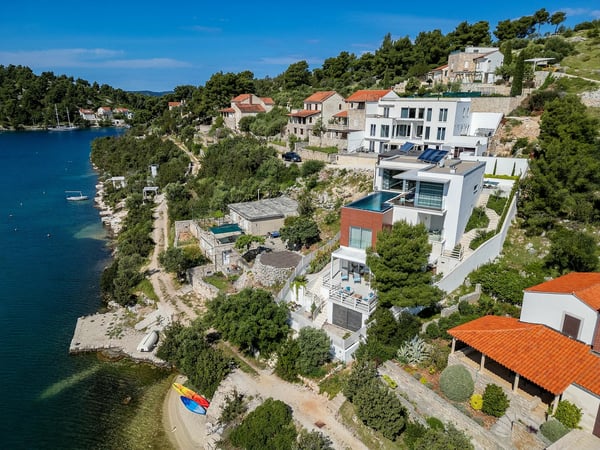 Villa Infinity is the ideal summer hideout, situated just steps from the crystal clear blue Adriatic Sea, in the small village of Bobovisca on the most beautiful island in Croatia – island Brac. Bobovisca is a small but very pretty fishing village where old and new villas line up spaciously along a lovely bay. Characterized by its unique design, this strikingly contemporary villa offers unbeatable style and functionality and boasts stunning sea views. Ensconced in cool elegance, guests will savour indoor and outdoor living with exceptional service and upscale amenities. This beachfront villa offers its own private infinity pool and outdoor dining area overlooking the sea. Truly private getaway - Villa Infinity offers opportunities for total relaxation and escape. Luxury Villa Infinity is arranged on three floors and built on sloping ground. It consists out of five bedrooms all en-suite and one additional bathroom for guests. and it is perfect accommodation for up to 10 persons. The villa is all about location, the closeness to the sea and the view. In addition, there is every comfort and plenty of style indoors, and a nice garden for outdoor entertaining and relaxation. From the rear of the villa, the main entrance is at ground level but from the front, it is on the second floor. In front of the main entrance, in case you would like to stay more active, you will find table tennis and darts, as well as bicycles which can be very handy and practical if you like to explore the island a little bit more. When entering the villa, you enter the main living area, which has a stunning view over the glittering bay. There you will find yourself inside a spacious area divided in several parts; fully equipped kitchen, dining and living room with cozy and comfortable modern sofas, stylish artwork and satellite TV and DVD, while large glass sliding doors connect it to the outdoor, heated swimming pool with several sun loungers, which maximizes the enjoyment of the stunning view of the entire bay and the fishing village. The bedrooms are situated on the first and ground floors. The internal staircase leads down to the first floor, where are two comfortable double bedrooms with bathrooms and sea view. There is also a separate TV/Cinema room, completely soundproofed and ideal for leisure. Another double bedroom with a private shower room and balcony with a sea view, additionally enriched with wooden sitting furniture, is on the lower level. The ground floor comprises two double bedrooms with en suite bathrooms, each opening out onto the villa's courtyard. Nearby is a summer kitchen, ideal for al fresco dining. The villa has a terraced garden, which is partly paved with white local stone, and the bottom of the garden is covered in a lawn with a gate that opens out directly onto a private flat rock beach. On the terrace, there is a covered area with an outdoor table and chairs. The villa has a private garage for two cars. In all, it is a unique villa.