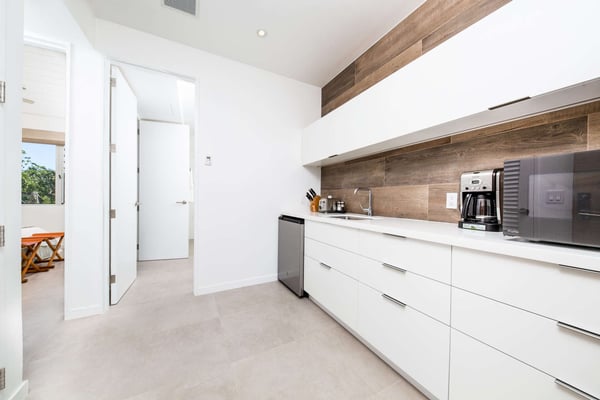 Beach Enclave’s signature design is present throughout this 7,800-plus-square-foot, five-bedroom villa. This design ethos features a seamless philosophy of combining indoor and outdoor living spaces with generous, concealable sliding glass doors, an expansive infinity pool, an outdoor kitchen and barbeque, outdoor bar and dining areas, a beach lounge with an outdoor shower and an open kitchen designed for entertaining. This layout is available with five bedrooms in the main villa, plus one suite in a separate garden cottage.